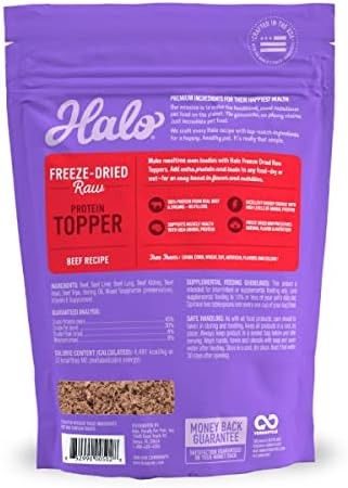 Boost your dog’s daily protein (and make mealtime even tastier) with Halo Freeze Dried Raw Protein Topper, beef recipe. Sprinkle on to add extra protein and flavor to any food, dry or wet. The premium protein comes from real beef and organs only, with no fillers at all. The freeze dried raw-food recipes from Halo are minimally processed to preserve natural flavor and nutrients. High-quality protein is an excellent source of energy for daily adventures, dog park runs and W-A-L-Ks. Made in the USA, this raw dog food topper recipe contains no corn, wheat or soy. And it’s free from artificial flavors, preservatives and colors too. These freeze dried raw dog food toppers make meal time nutritious — the perfect food topper for dogs.