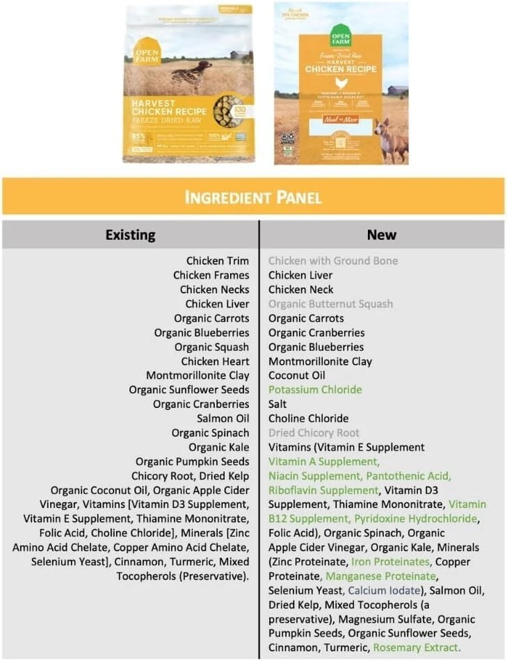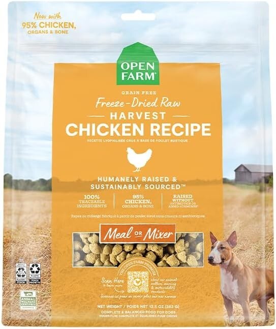 Freeze Dried Raw Dog Food, Humanely Raised Meat Recipe with Non-GMO Superfoods and No Artificial Flavors or Preservatives Ounce Pack of 1, Harvest Chicken Recipe HARVEST CHICKEN RECIPE: Our humanely raised chickens are naturally raised on family farms with gentle handling, space, and the ability to engage in their natural behaviors. Our chickens are fed a healthy vegetarian diet without antibiotics or growth hormones. Chicken is a great source of protein and healthy fats. MORE WAYS TO FEED: Boost their kibbles with the ultimate meaty taste that can't be beat by other wet mixers or toppers. Mix it into meals as either dry nuggets or use its absorbency to rehydrate it with a little water for soft, moist bites. FULL COVERAGE NUTRITION: Treat any breed to nature’s best-- a blend that uses bits of meat and vegetables to supply vital health benefits through protein and probiotic fiber, all in a small resealable travel pouch container for easy scoop and serve. FROM FARM TO BOWL: Dogs crave meat by wild primal instinct, so our recipe makes it the 1st ingredient. Then we skip the wheat, corn, and potato in favor of fresh superfoods like pumpkin and blueberries for extra wellness and an honest balanced diet. 100% TRANSPARENCY: As a part of our commitment to transparent sourcing practices, we provide owners with the ability to trace the origin of every ingredient using the lot number on the bag, because where pet foods come from shouldn’t be a mystery. FREEZE DRIED RAW: Gently freeze-dried, never cooked, easy-to-feed pure raw nutrition. Antibiotic, hormone, and steroid-free.
