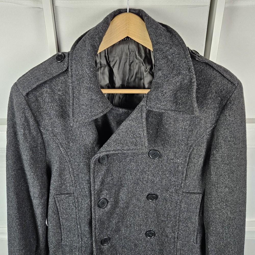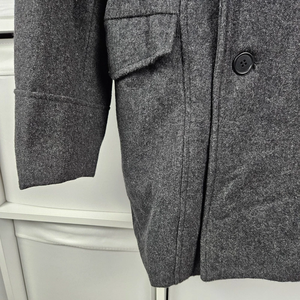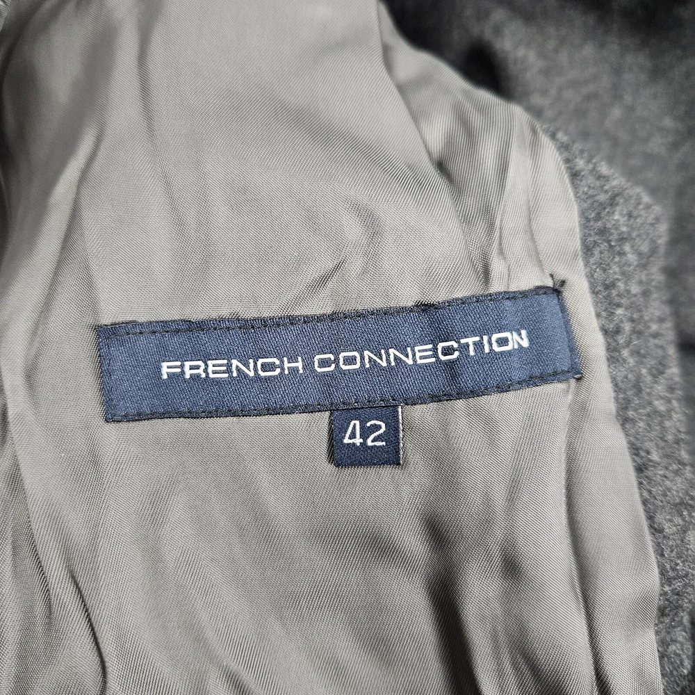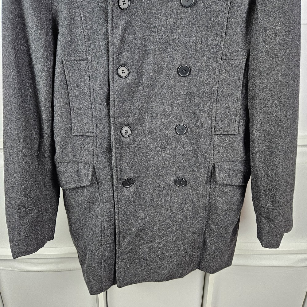 French Connection mens charcoal grey Pea Coat, size 42 which is approximately a UK M to L. Double breasted. Fully lined. Wool (60%) blend fabric. In good used condition, one small split in the lining as seen in pictures, not seen when on. Approximate Measurements in inches: Armpit to armpit: 22 Length: 34