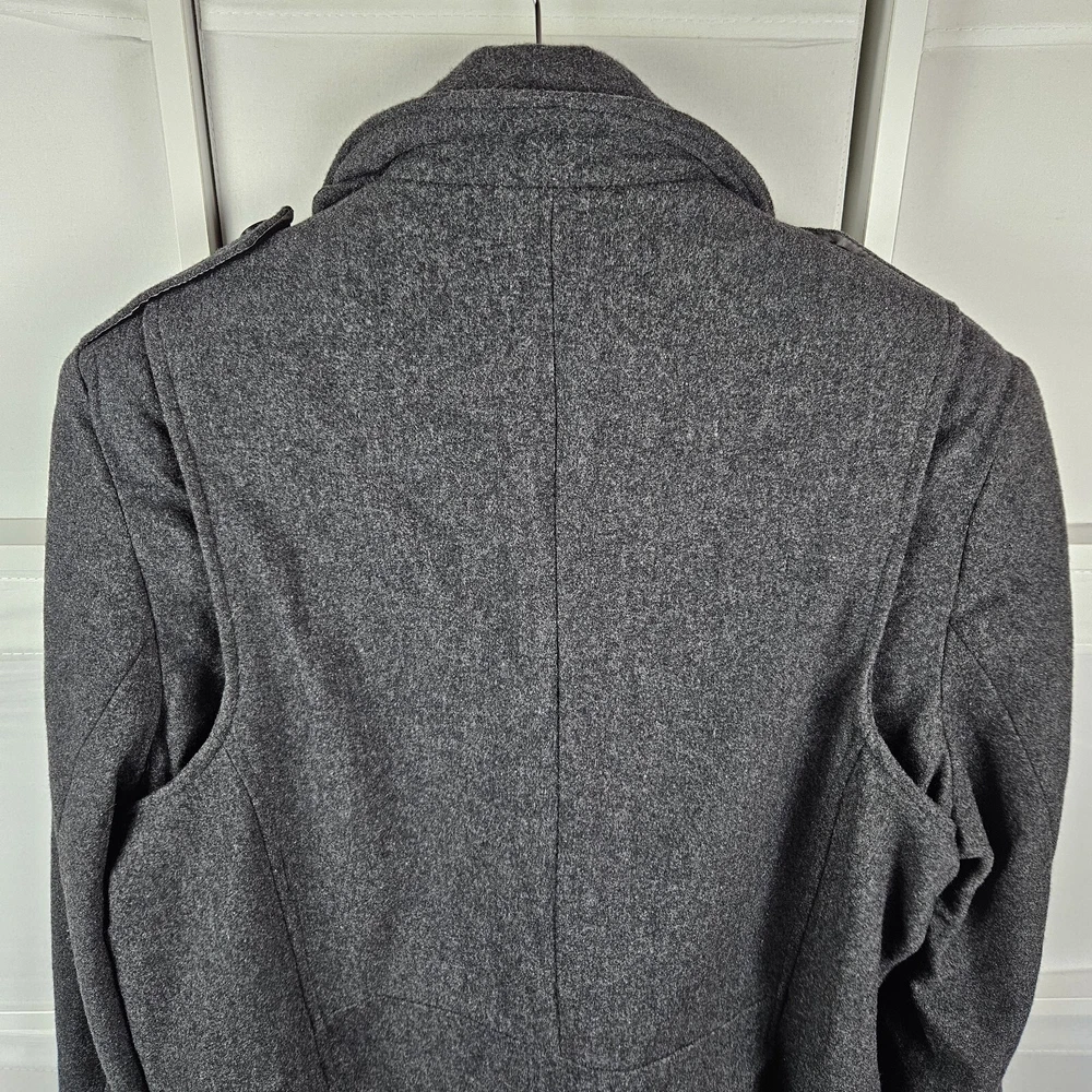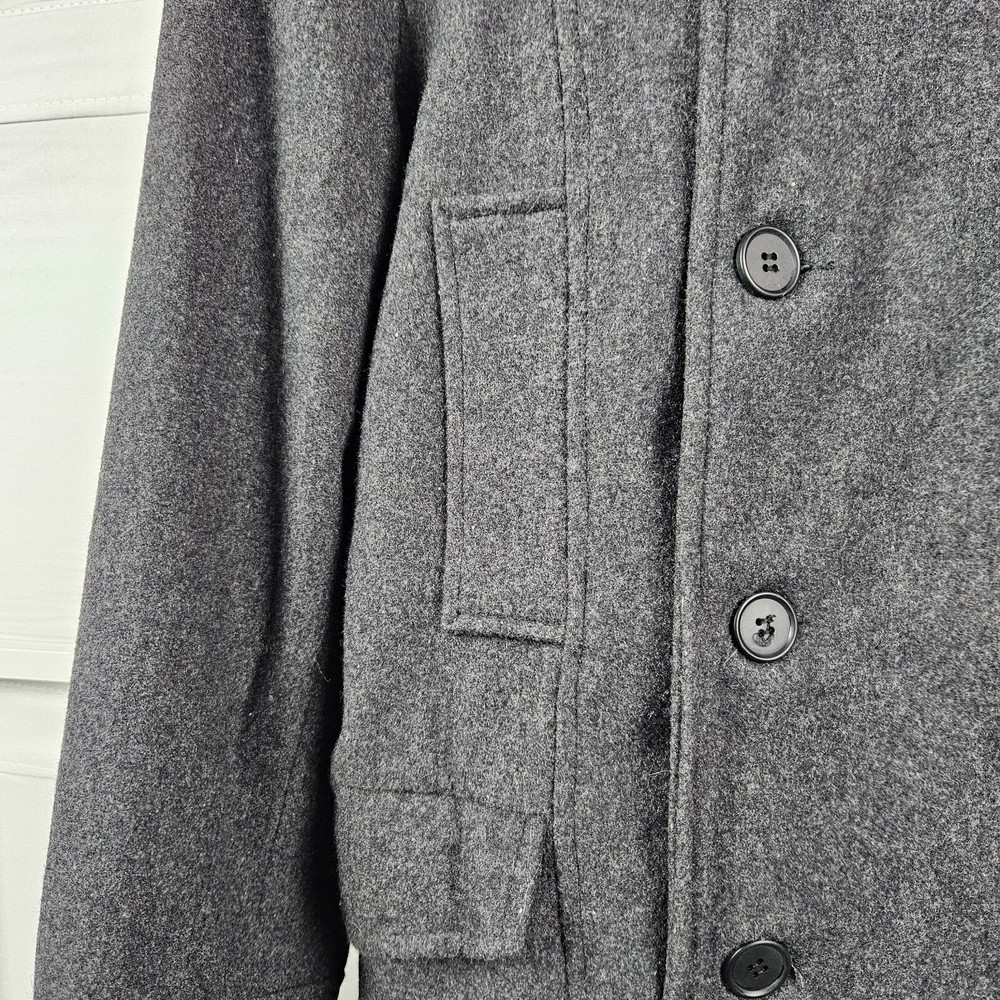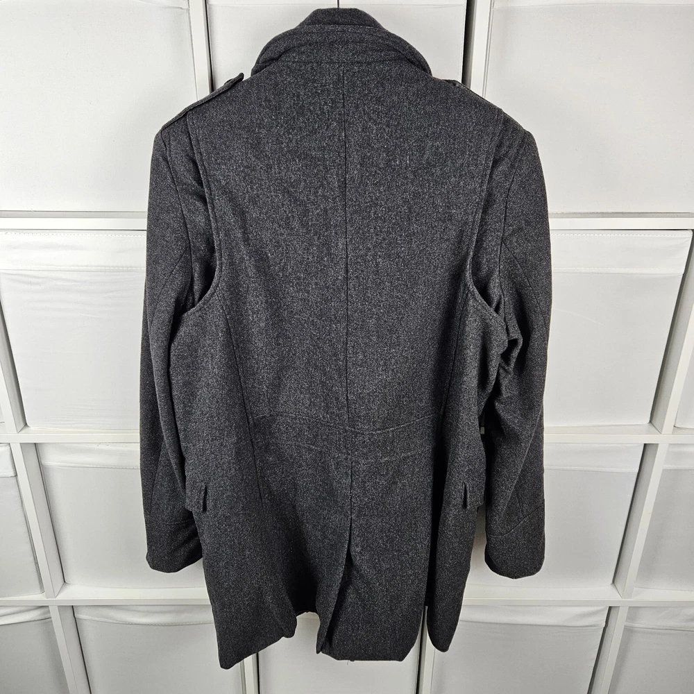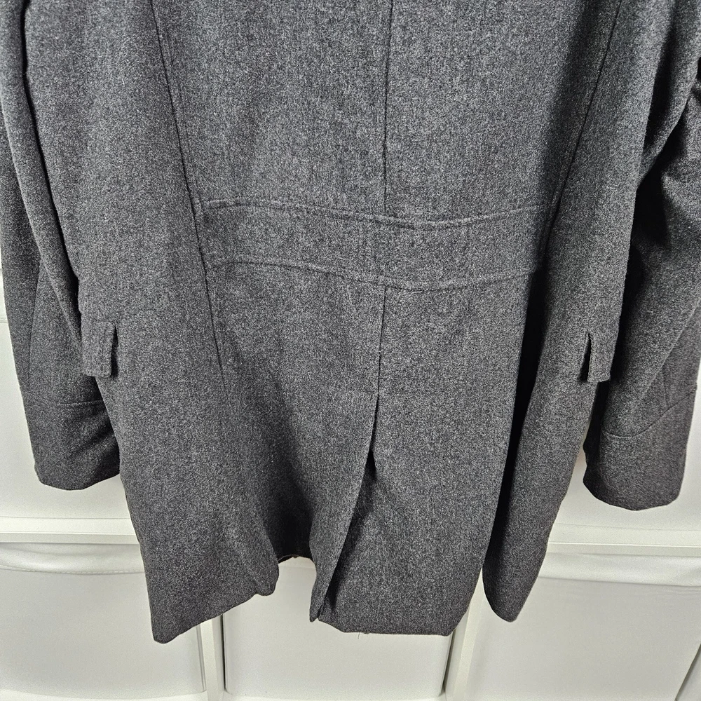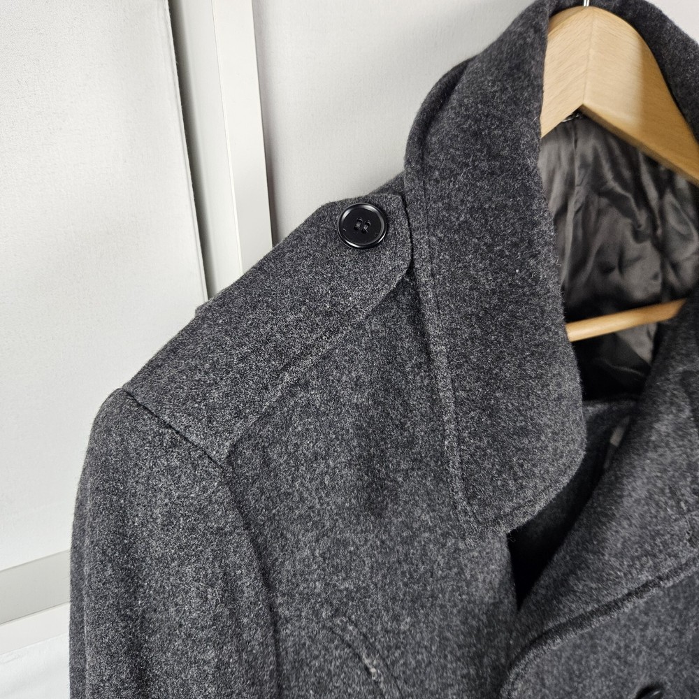 French Connection mens charcoal grey Pea Coat, size 42 which is approximately a UK M to L. Double breasted. Fully lined. Wool (60%) blend fabric. In good used condition, one small split in the lining as seen in pictures, not seen when on. Approximate Measurements in inches: Armpit to armpit: 22 Length: 34