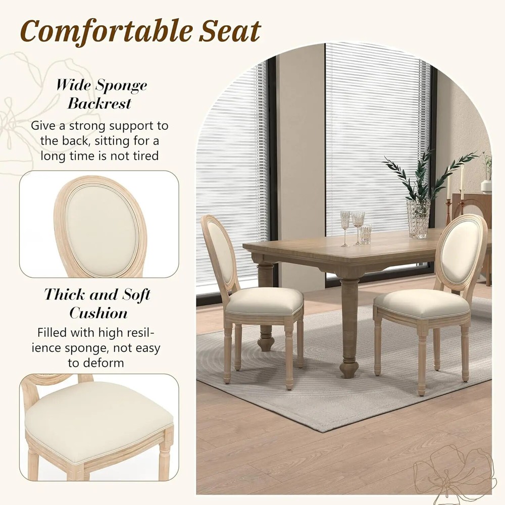 French Dining Chairs Set of 4, Upholstered Vintage Farmhouse Chair with Round Backrest, Mid Century Fabric Chairs with Solid Rubberwood Legs for Dining Room Kitchen Restaurant, Beige Color Beige+sponge Back Size Set of 4 Shape L-Shape Item Depth 22.4 inches Style Modern Assembly Required Yes About this item Chic French Style: Our set of 4 vintage French dining chairs, designed with an elegant and rustic style, equipped with upholstered dining chairs and exquisite wooden frames, elegance and nobility are everywhere, providing you with unparalleled comfort. The beautiful oak color collides with the soft fabric, creating a different French charm for your dining environment. Superior Construction & Sturdy Wood Frame:Solid wooden frame and rubber-wood legs make this Mid Century dining room chair sturdy and durable,Wooden legs with white footpads for more stability and protect your floor. Weight capacity: 250 LBS. [Suitable Size & Widely use]:Sized 22.4''DX19.5''WX38"H. French dining chairs are suitable for any home decoration, from the country farmhouse to the middle of the century to modern times. The fabric dining chair can be used in dining room, kitchen, living room, bedroom, dining room, dressing room, study and so on as dining chair, reading chair or tea corner chair. Comfy Seating Experience: The linen cushion and upholsytery round back make you feel extremely comfortable when sitting.This exquisite side chair adds features around the table, even anywhere.