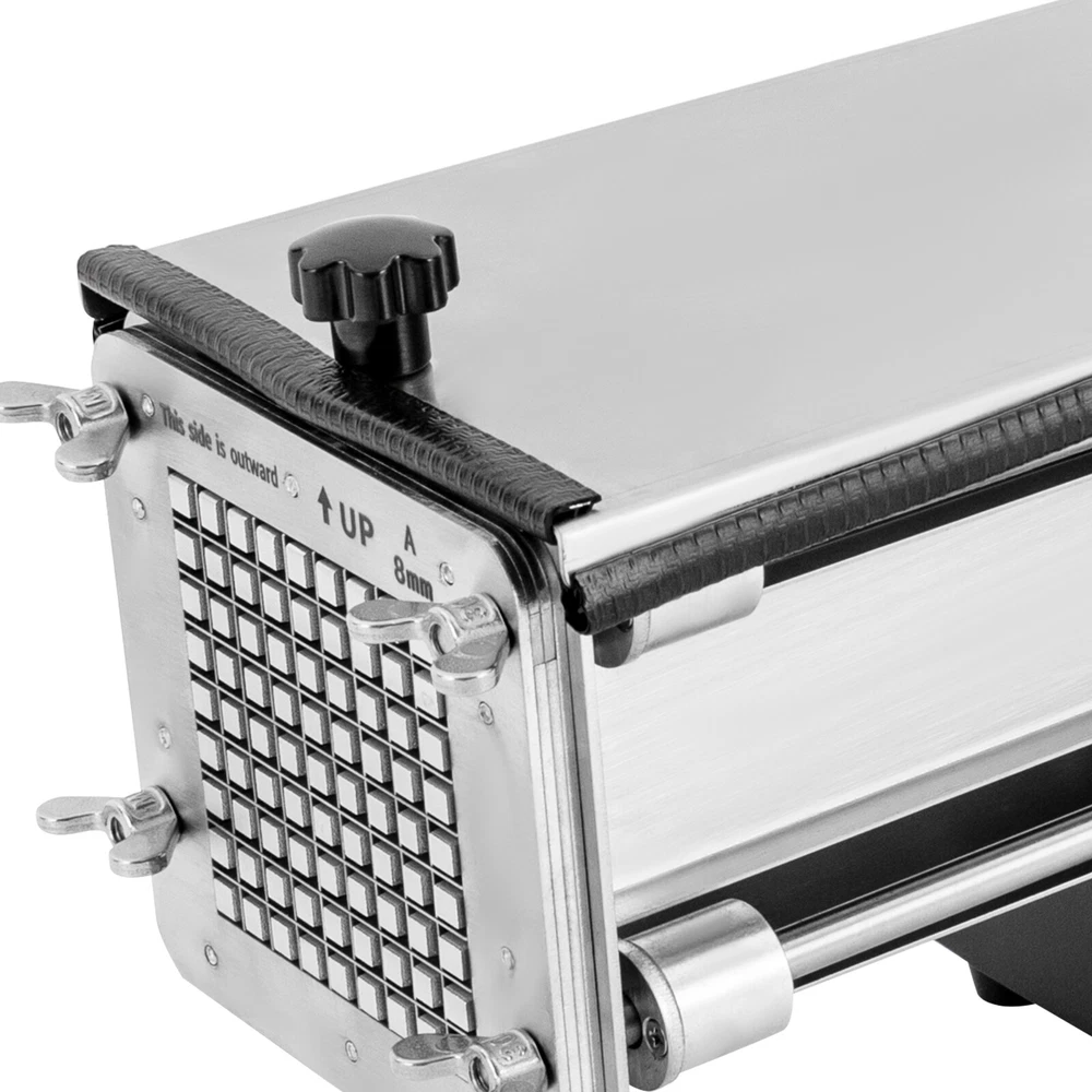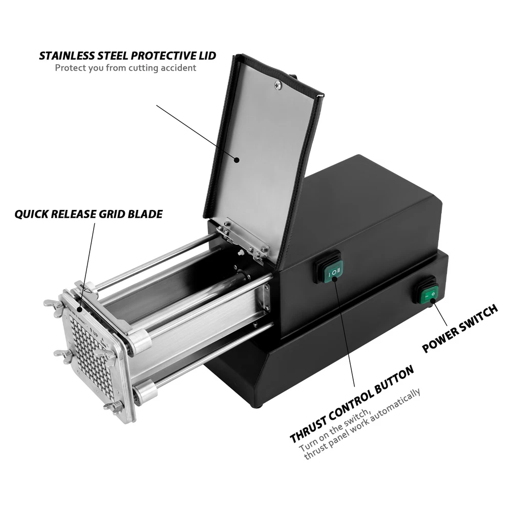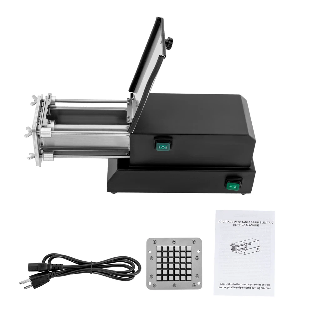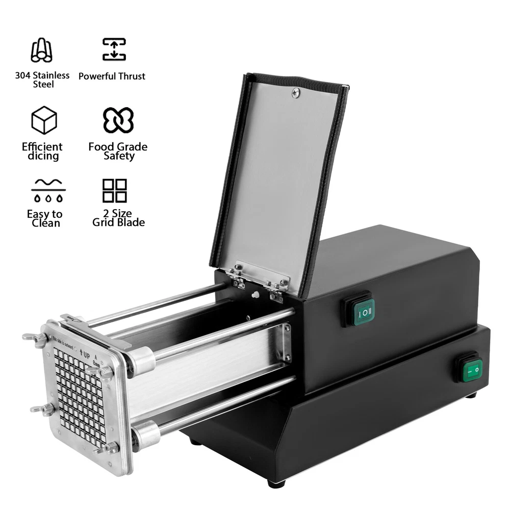 Description Are you worried about your poor knife work, cutting out the uneven thickness of foods, or still worried about manual cutting vegetables laborious and easy to hurt your hands? Then we strongly recommend buying our electric potato cutter to meet your cutting needs and give you efficient and convenient cooking services! Key Features High-quality Material: The entire body, including the blade, is made of stainless steel, which is not only safe and hygienic but has good wear resistance, durability, is not easily deformed, and has a long service life. Good Assistant: The 200W power and 3.32in/s pusher speed enable you to easily cut raw materials into strips or dicings, which will save you time and allow you to enjoy time with friends and family. Intelligent Control: Compared to French Fry Cutter Electric Stainless Steel W/ 2 Blades For Commercial, Home Description Are you worried about your poor knife work, cutting out the uneven thickness of foods, or still worried about manual cutting vegetables laborious and easy to hurt your hands? Then we strongly recommend buying our electric potato cutter to meet your cutting needs and give you efficient and convenient cooking services! Key Features High-quality Material: The entire body, including the blade, is made of stainless steel, which is not only safe and hygienic but has good wear resistance, durability, is not easily deformed, and has a long service life. Good Assistant: The 200W power and 3.32in/s pusher speed enable you to easily cut raw materials into strips or dicings, which will save you time and allow you to enjoy time with friends and family. Intelligent Control: Compared to traditional manual control, you just need to plug in the power cord, and put in the ingredients, through one button to control forward and backward, very time-saving and labor-saving. High Safety: It has an overload protection function that automatically disconnects the machine if it is overheated or overloaded to protect the machine and improve safety in use. Large Capacity: With the capacity of 7.68*3.07*2.76 inch, this cutter is big enough to cut an entire potato, sweet potato and other vegetables, which is suitable for commercial or home use. Easy to Clean: With its smooth surface, removable blade, you can easily and quickly clean it. Only need to clean it with a damp cloth or rinse the blade with water. Spacing-saving: Because of its small size (19.29*6.3*8.11 inch), it can be placed on your kitchen table or in a closet without taking up too much space. Customer Service: We aim to provide quality products and services. If you have any problems, please feel free to contact us. We will reply and solve the problem for you as soon as possible. Details Anti-slip Feet: The bottom of the product has four anti-slip feet, which can effectively prevent it from slipping, and reduce scratches on the desktop caused by machine vibration during use. Spiral Carry Handle: The top of the lid is equipped with a spiral carry handle, which makes it easy for you to lift and close the lid. Control Buttons: You can manually control the forward and backward which is easy to use. Stainless Steel Shield: It has a stainless steel shield added to the top, which helps prevent food splashes and increases the use safety. Multi-size Blade Grids: The product is equipped with multi-size blade grids(1/2", 3/8") to meet your different cutting needs. Application It can cut not only potatoes and French fries but also white radishes, carrots, sweet potatoes, cucumbers, apples, and various other harder vegetables and fruits. And it is suitable for homes, and restaurants to use. How to Replace the Blade 1. Turn off the power. 2. Unscrew the nut counterclockwise. 3. Remove the net blade. 4. Open the lock, and replace the push plate and net blade. 5. Lock the nut back after screwing. How to Use 1. Put a big potato or small potato into the machine. 2. Cover the lid and turn on the power switch. 3. Use the control switch to control forward and backward to cut potato. 4. Fry the potato chips and start to enjoy your perfect french fries! Specification Material: 201&304 Stainless Steel, PVC Color: Black Style: Modern Minimalist Processing Range: Fruits and Vegetables Plug: US Standard Voltage: 110V Power: 200W Frequency: 50/60HZ Blade Shape: Rectangular Operation Mode: Automatic Pusher Speed: 82mm/3.32in/s Single Pusher Stroke Time: 1.95s 2 Size Grid Blades: 12mm, 1/2"; 8mm, 3/8" Vegetable and Fruit Holding Size: 19.5*7.8*7cm/7.68*3.07*2.76 inch Package Size: 56*25*25cm/22*9.8*9.8 inch Product Size: 49*16*20.6cm/19.29*6.3*8.11 inch Gross Weight: 10kg/22 lb Net Weight: 9kg/19.84 lb Package Includes 1* Electric Potato Cutter 1* Power Cord 2* Grid Blades(One is Already Installed) 1* English Manual Notes Due to the strong power of the machine, when cutting small ingredient, it'll be bent. Therefore, it is recommended to use this machine to cut large ingredients such as large potatoes, large sweet potatoes, large carrots, and so on. If the power switch is not on, it is possible that the machine's power cord is not plugged in properly. If the lid is not closed, the machine will not start either for your safety protection. The blade is sharp, pay attention to safety when cleaning, replacing, and storing! Please dry it when stored after cleaning. It is best to hand wash to avoid touching badly, the body should not be immersed in water. Please allow the slight color difference caused by the shooting light and 1-3 cm error due to manual measurement, and make sure you do not mind before ordering. Payment Delivery details Terms of sales About us Contact us Payment We accept ebay payment 。 Fees such as import duties, taxes are not included in the item price or shipping costs. These charges are the buyer's responsibility. Delivery details Shipping: 2-9 working days to: USA Terms of sales We maintain high standards of excellence and strive for hundred percent customer satisfaction. Feedback is very important t