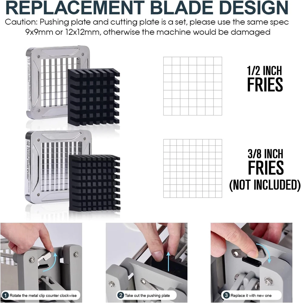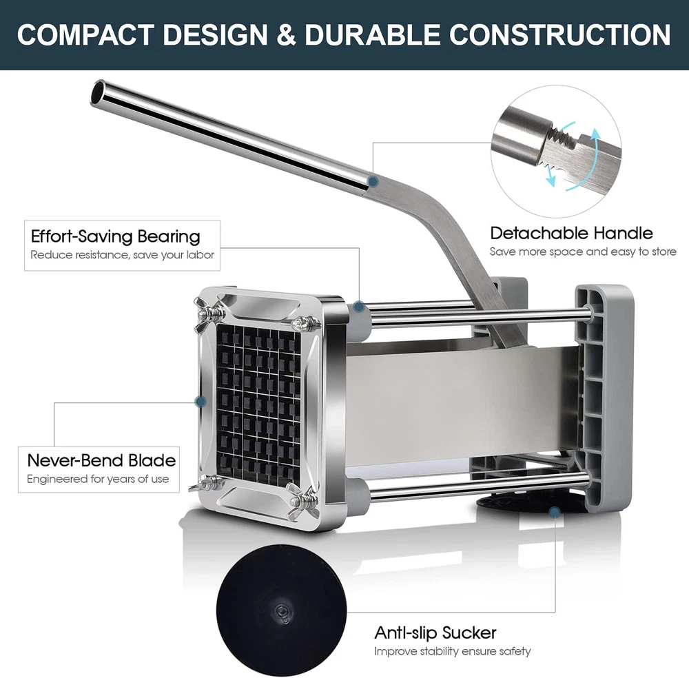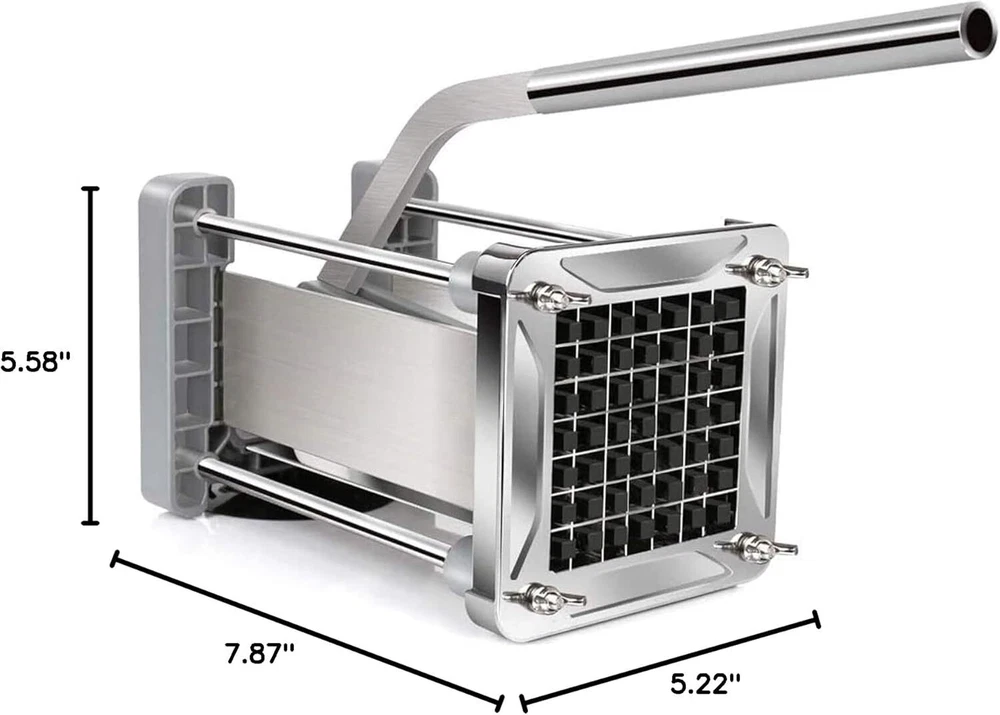 French Fry Cutter, Sopito Professional Potato 1/2'' Blade, Silver Product Details Brand: Sopito Product Dimensions: 5.58"L x 5.22"W x 7.87"H Material: Stainless Steel Color: Silver Special Feature: Portable,Interchangeable Blades Recommended Uses For Product: Vegetable Product Care Instructions: Hand Wash Only Blade Material: Stainless Steel Item Weight: 5 Pounds Blade Length: 0.5 Inches Blade Shape: Square Operation Mode: Manual Manufacturer: Sopito UPC: 616010013833 Item Weight: 4.99 pounds Item model number: V6 Is Discontinued By Manufacturer: No HIGH QUALITY BLADE: Made of high quality stainless steel, robust, restaurant-grade blade engineered for years of use., slice fast and easy to use, just with little effort for cutting the potato, carrots, cucumbers, eggplant, onion into 1/2 inch thick strip ERGONOMIC HANDLE DESIGN: Extended handle makes everything easier to make homemade fries. With a single lever action you can squeeze through potatoes with ease NO NEED TO QUARTER OR HALF CUT THE POTATOES: The cutter box can takes 5.58*3.51inch potatoes, the capacity of this cutter is big enough for most potatoes, sweet potatoes and other vegetables. Cuts the entire potato in one go CONVENIENT FOR ALL: Cuts fries in 1/2" pieces. Also great for zucchinis, cucumbers and other vegetables, fruits into perfectly shaped sticks in seconds. Create stunning French fries, sweet potato fries, etc. For thinner 3/8 Inch blade, you may check our store and search 3/8 inch blade SPACE SAVING AND EASY TO CLEAR: Unlike commercial French fry cutter in the market, which takes too much space, this potato cutter has small volume as well as commercial grade quality. Easy to clean with water, never be worried about rinsing and rust, use the cutter easily