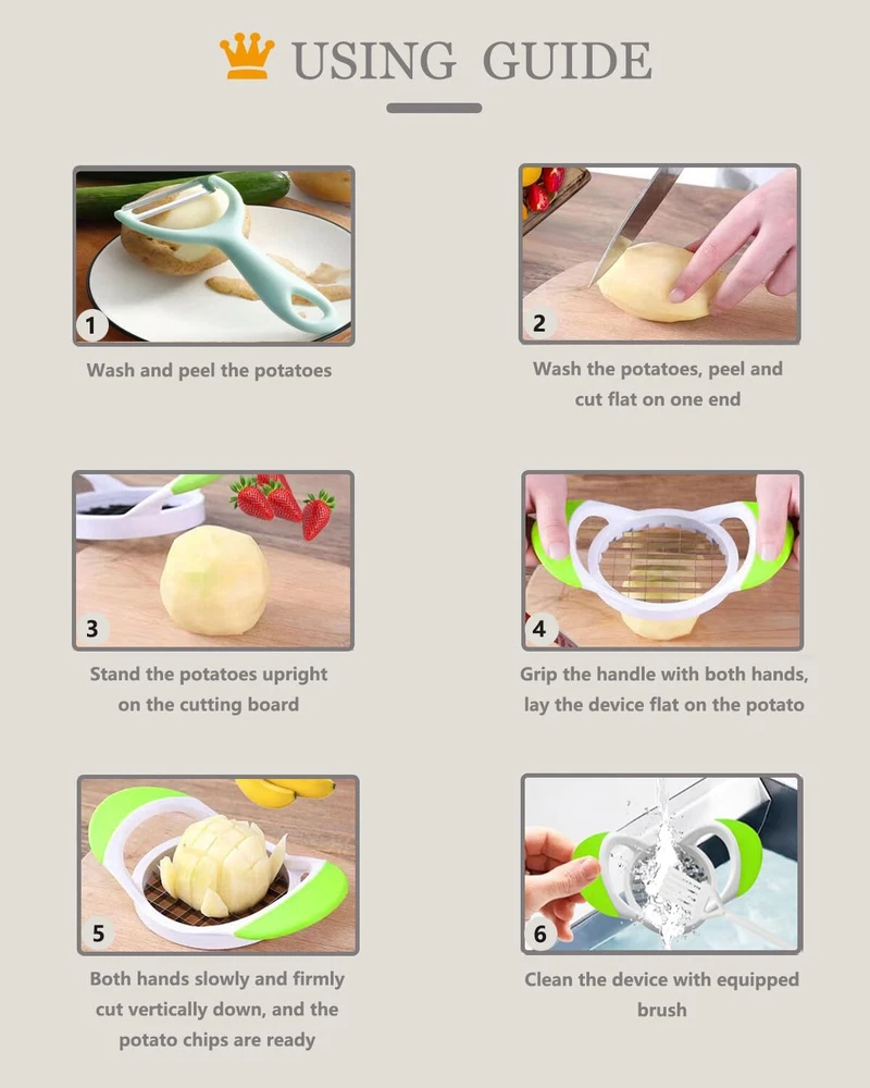 🎖️【Be Worth Having】This device is specially designed to make French fries and is perfect for everyday use in home life. In addition to the french fry cutter, it also comes with a potato peeler and a white cleaning brush, which is more cost-effective. Almost the same functions, for less money, get a three-piece set, what are you waiting for? Having them will bring more convenience and fun to your life. Small tool, big changes. As long as you use it, you will know its advantages 🎖️【Saves Space & Easy To Store】 The overall length of this potato Chopper is 7.09''(18cm), its overall width is 4.13''(10.5cm) and the circular inside diameter of the cutter section is approximately 3.54''(9cm); The length of the peeler is 5.51''(14cm) and its width is 2.75"(7cm); The total length of cleaning brush is 4.3"(11cm), the size of the bristle is approximately 1"(2.5cm) X 0.8''(2cm). Small size, can be stored in any spare place in your kitchen 🎖️【Beautiful Appearance & More Advantages】The lines of the fuselage are smooth and shiny; A good color match; The handle is wrapped with frosted textured TPR material, non-slip while giving you a comfortable grip; The white main part of the device is made of ABS material, which is strong and durable; The blade is made of high quality food grade thickened stainless steel material with double-sided cutting edge, which does not rust and is sharper, and has a longer service life. In short, let you look at it happy and use it comfortable 🎖️【Easy To Use & Cutting Efficient】 Are you getting tired of pulling out the cutting board and knife to try and cut perfectly shaped fries? With this device, you can perfectly prepare delicious French fries in just a few steps by following the instructions shown on the left. Simple operation. Save effort, save your time. It will be easy to prepare a delicious meal of French fries for family or friends. Warm tip: For better use, please slowly and firmly press down when cutting potatoes 🎖️【Multi-purpose & Easy To Clean】 This handheld French fries cutter is designed for Making fries, it can also be used to cut other fruits and vegetables such as cucumbers, onions, to meet your daily needs. Compared with other equipment with similar functions and complex structures, the more complex the structure, the more likely it is to cause food residues. This one has a simple structure, no other parts, a one-piece design, and almost no dead corners, so it is easier to clean (Clean with water and equipped brush, or in the dishwasher) 🎖️【Quality & After-sales Guarantee】 International standard production process, every French fry Maker has passed strict quality inspection and testing before being delivery. 24-hour online after-sales service, as long as you have any questions about the product, please feel free to contact us and give you a satisfactory solution(Refund or replacement). This is our promise to you. Your satisfaction is our concern