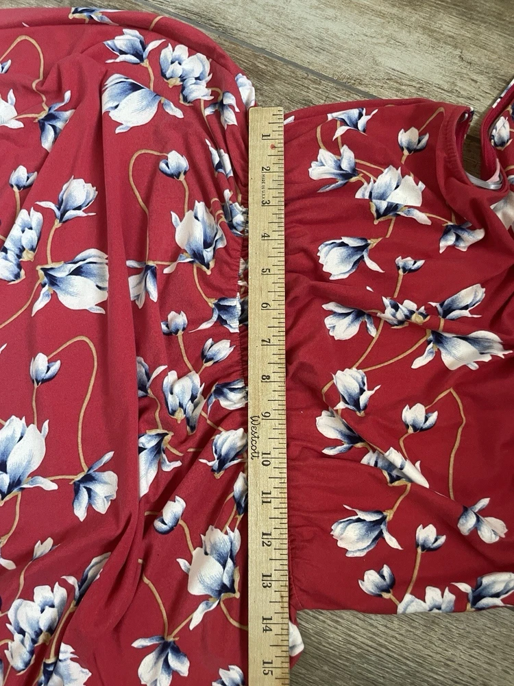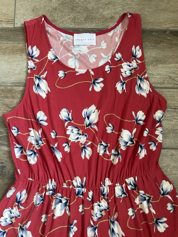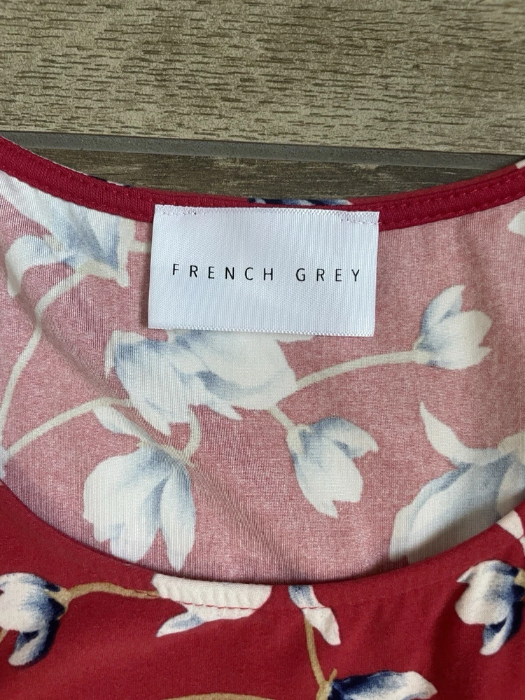 This French Grey Evalynn dress is perfect for any occasion, whether you're traveling, going to a business meeting, or just out for a casual day. The dress features a beautiful floral pattern in shades of red and grey, and is made of a soft and comfortable knit fabric. Size: large
