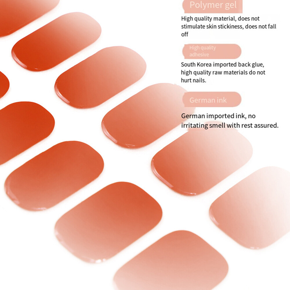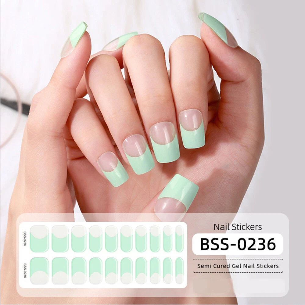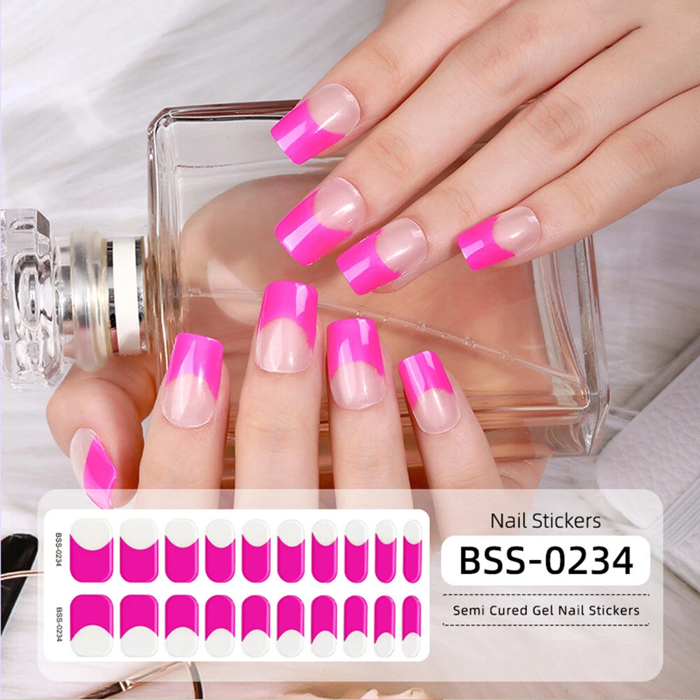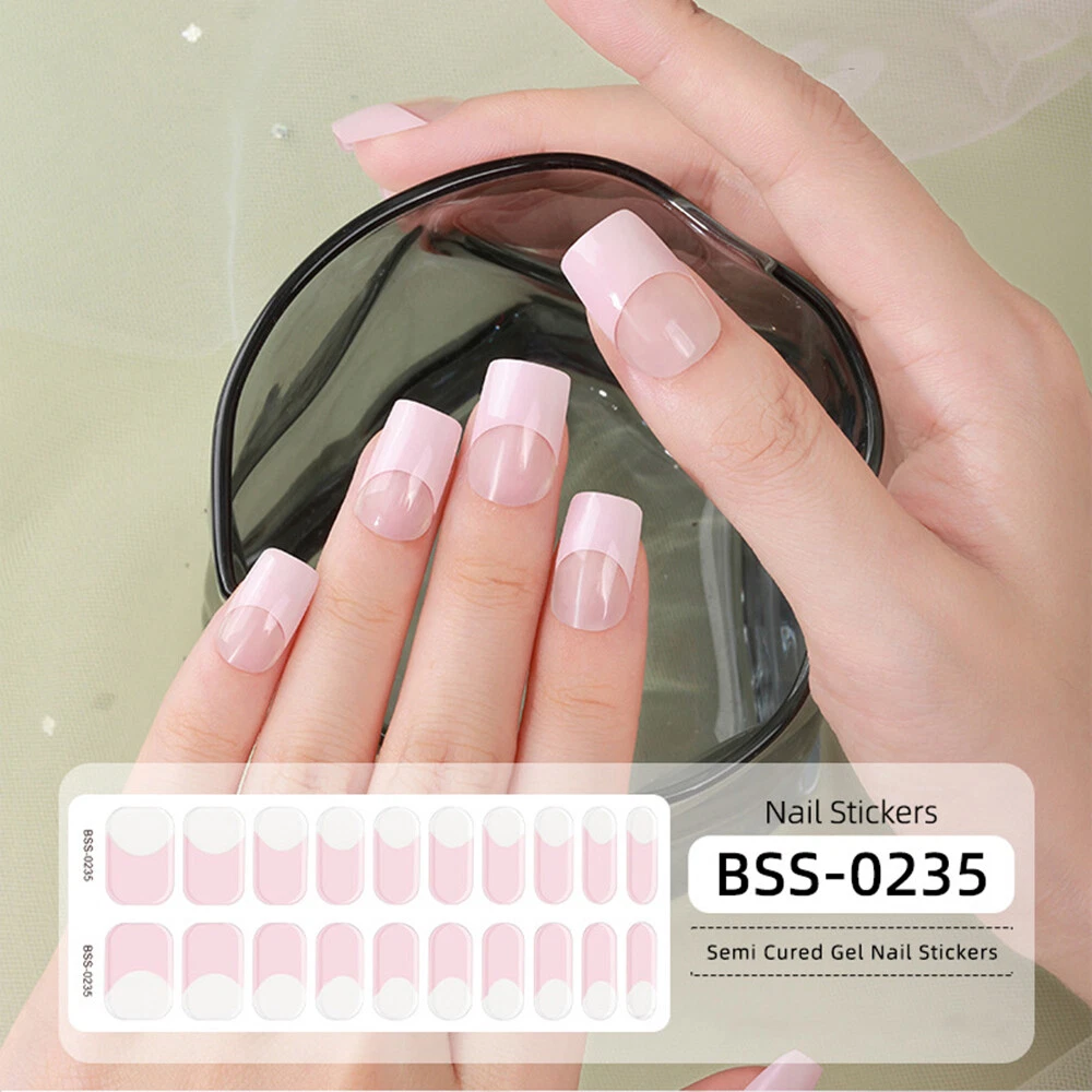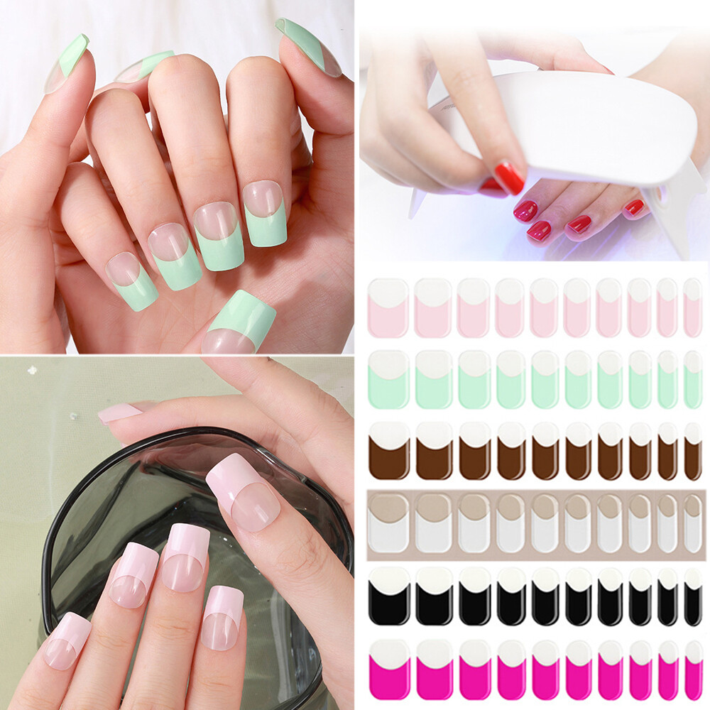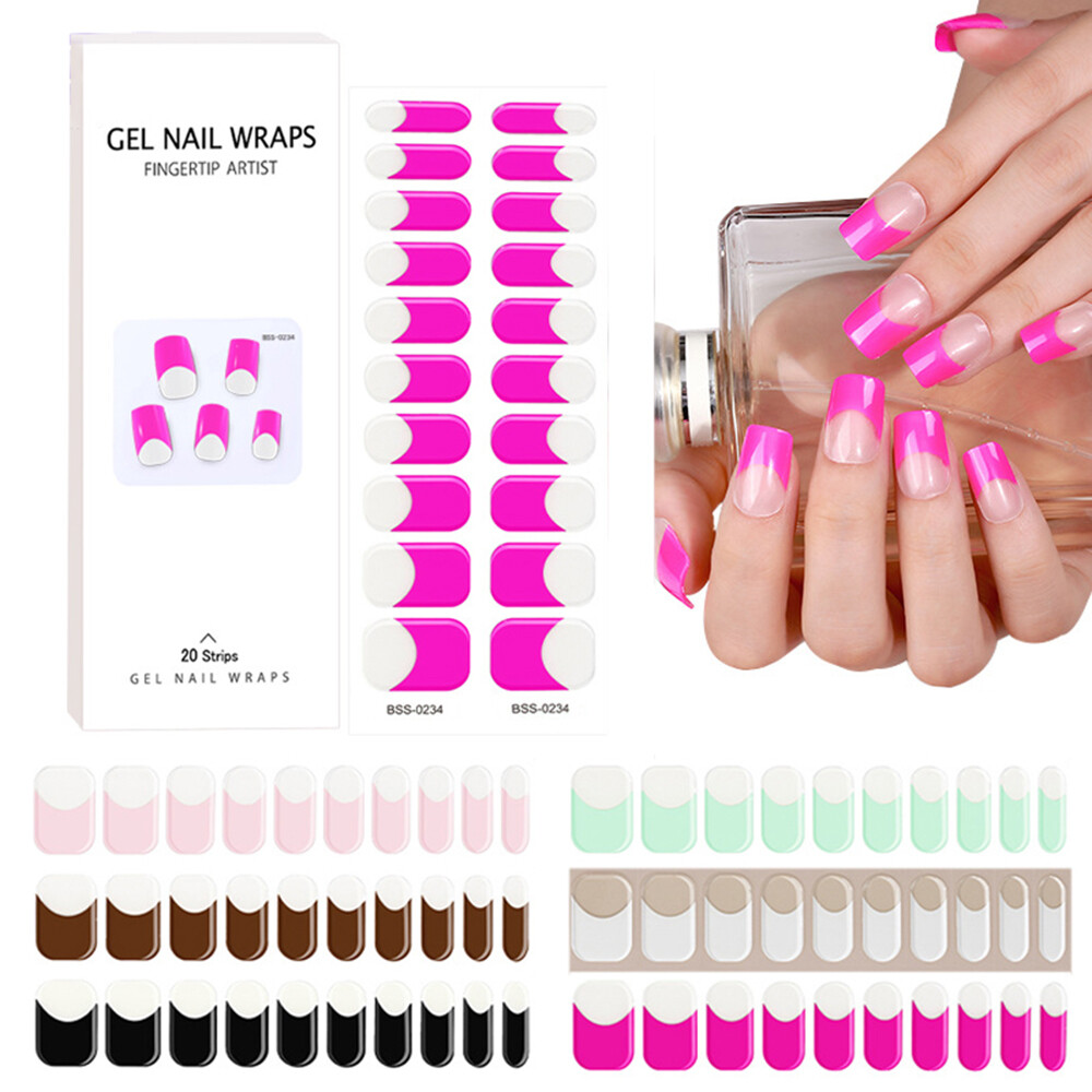 French Patch Full Cover Wraps Gel Nail Sticker UV Lamp Semi-Cured DIY Manicure Specification: Color:as the picture shows QTY:20 Tips/Sheet Color:As Show Package Include: 20 Tips/Sheet Nail Stickers 1 PC Alcohol Wipes 1 PC Nail File 1 PC Stick Features: What are semi-cured gel nail wraps stickers? 1.They are stickers made of real liquid gel and cured (or finalized) by 60%. 2.They are made of flexible and wearable material in order to fit most nail shapes and sizes. 3.After placing them on your nails and curing the remaining 40% with a UV lamp, the gel will completely harden, and the effect will be like applying colorful nail polish in a nail salon. 4.Semi-cured gel nail strips can also be dried naturally under the sun for 1-2 hours without UV light. HOW TO USE: 1. Smooth your nails with the nail file and clean your nails with cotton pads. 2. Choose the right size that fits your nails, peel off the protective films of the Gel Nail. 3. Place on the fingernails gently. 4. Use a small wood stick to press and flatten the edges of the nails. 5. Use scissors to cut off the excess gel nails, and then file the perfect shape with a nail file. 6. Cure the gel nails under UV/LED light. 7. Smooth the edges with a nail file. 8. Done! How To Remove: 1.Use the wood stick to lift gel nail wraps off your nails. 2.Clean your nails with cotton pads. ATTENTION: 1: Please use it immediately after opening it. 2: Please keep it in a film container after use, and use a sealing strip to avoid drying out. 3: Please keep it away from young children, and avoid eating by mistake. 4: Do not use it when your skin has a cut. 5: The colors may exist slight differences due to different screens. STORAGE: Please store in dark, cool and dry place to avoid hardening