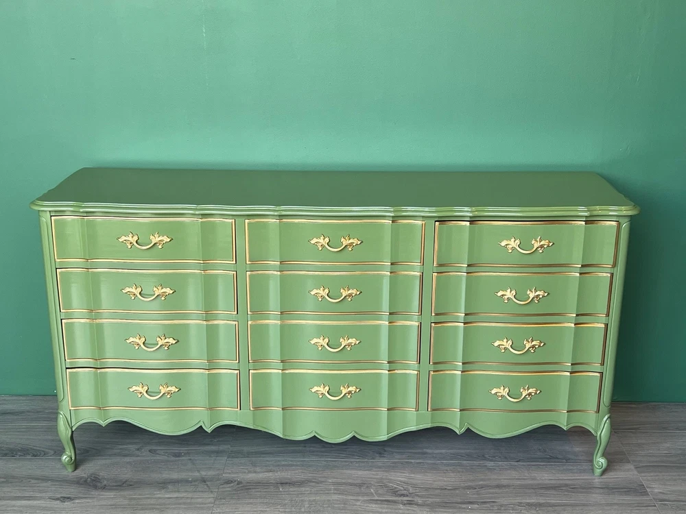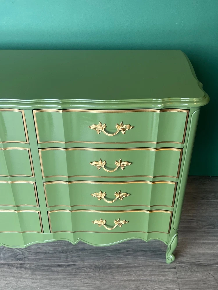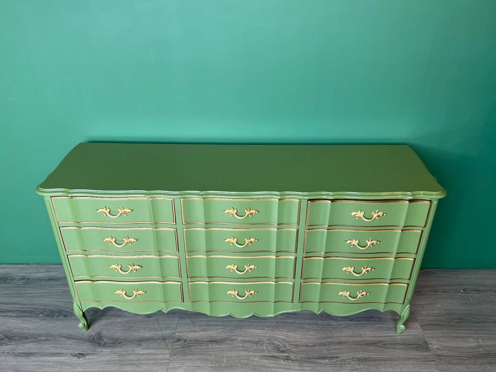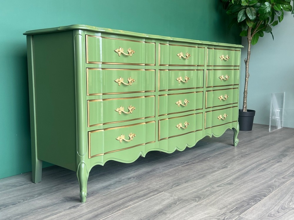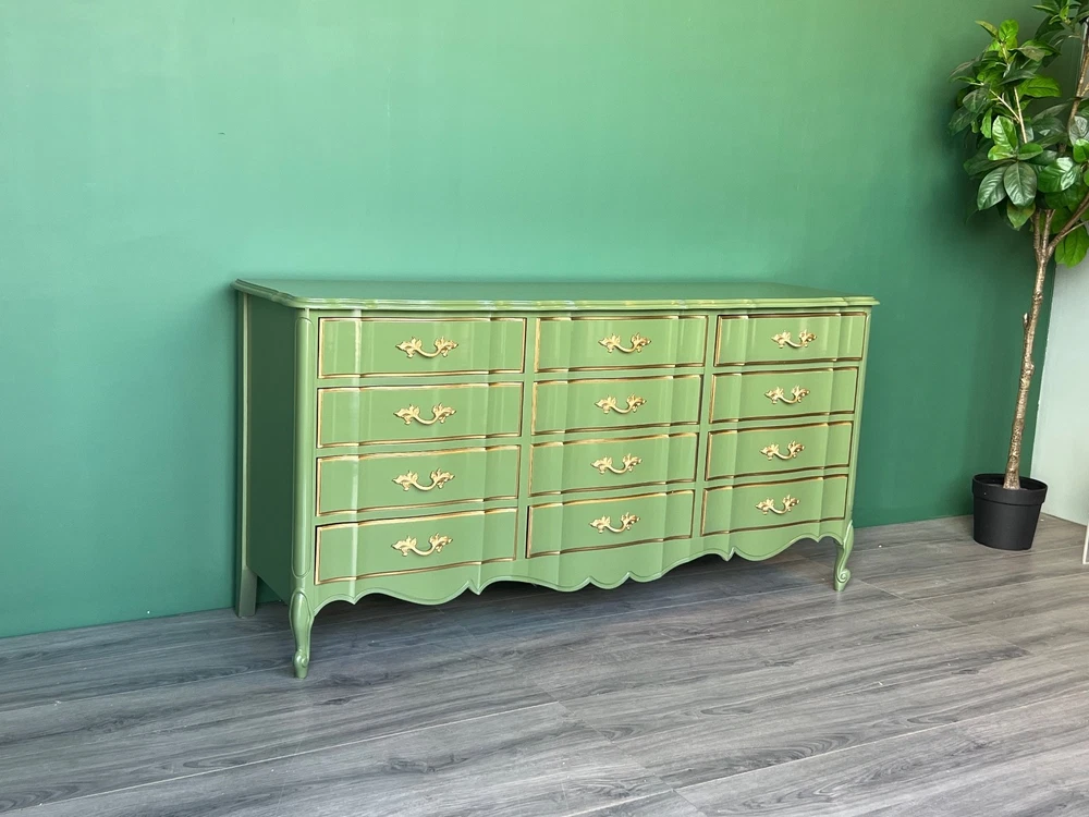 Vintage French Provincial Dresser by Dixie. This is a solid built dresser of twelve drawers with dovetail joints This dresser is newly refinished in a high gloss green lacquer with gold painted hardware Dimensions: 68”Width x 18”Depth x 34”Height See pictures and condition for reference SHIPPINDS IS NOT INCLUDED, SHIPPING WILL BE HANDLE SEPARATE IF YOU NEED ASSISTANCE WITH SHIPPING PLES LET US KNOW, THANK YOU