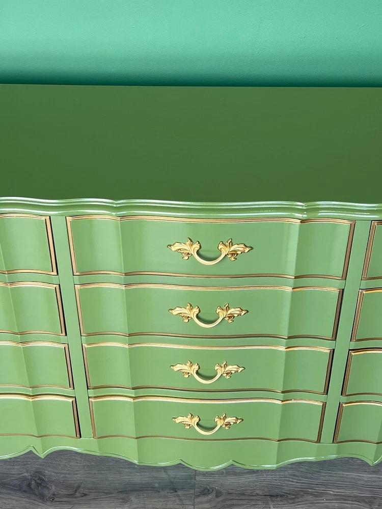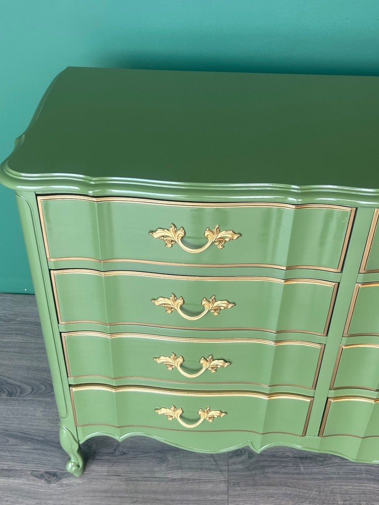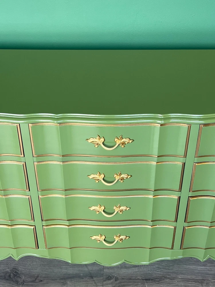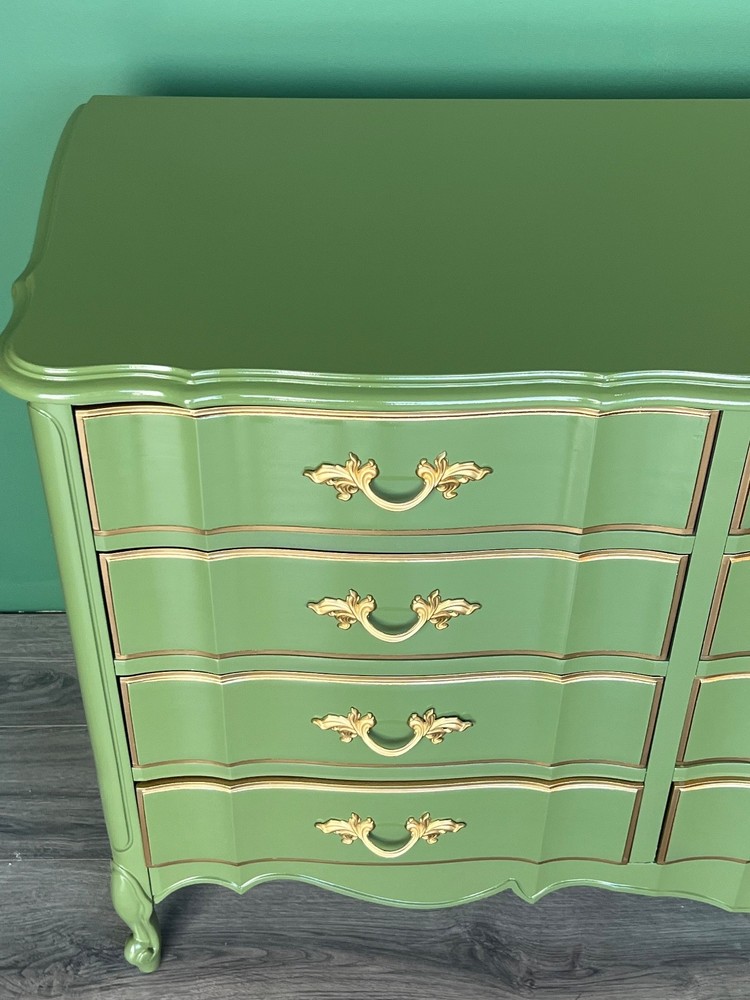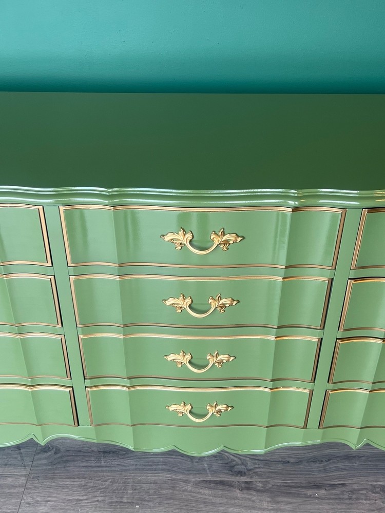 Vintage French Provincial Dresser by Dixie. This is a solid built dresser of twelve drawers with dovetail joints This dresser is newly refinished in a high gloss green lacquer with gold painted hardware Dimensions: 68”Width x 18”Depth x 34”Height See pictures and condition for reference SHIPPINDS IS NOT INCLUDED, SHIPPING WILL BE HANDLE SEPARATE IF YOU NEED ASSISTANCE WITH SHIPPING PLES LET US KNOW, THANK YOU