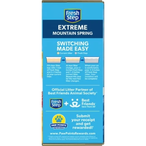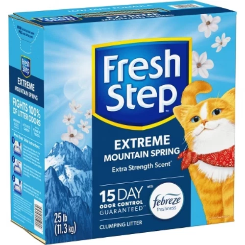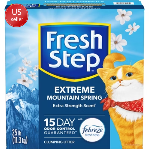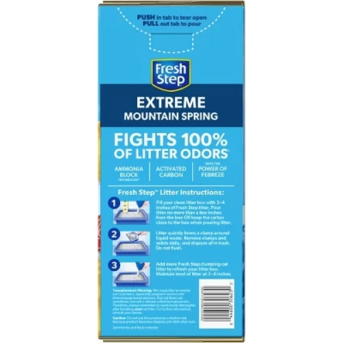 Dear Valued Customers, Before you place your order, we’d like to share a few important details to ensure a smooth shopping experience: Fresh & Long-Lasting Products: All items are recently produced with a shelf life of 12+ months. If you encounter any issues, simply contact us for a full refund—no questions asked. Free Shipping (with Some Limitations): Currently, we cannot deliver to warehouse addresses or forwarding addresses. We’re actively working to expand our shipping coverage, but if your location isn’t serviceable, you’ll receive an automatic full refund—no risk to you. Eco-Friendly & Branded Packaging: To keep costs low (and pass the savings to you!), we ship in recyclable boxes with our logo. Your satisfaction is our priority. If you have any questions, just reply to this message—we’re happy to help! Thank you for trusting us. Jessica Description Fresh Step Extreme Clumping Cat Litter is formulated with the power of Febreze in Mountain Spring scent to destroy extreme litter box odors. Now with Ammonia Block Technology, this litter repels the strongest odors from urine and feces and leaves behind a light tropical scent. A paw activated fragrance releases every time your cat uses the litter box, providing odor control as needed without being overpowering. The high quality, ClumpLock technology in this litter quickly absorbs liquids while trapping odors on contact to form tight clumps, leaving virtually no stinky crumbles after scooping, making cleaning fast and easy. Made with a low dust and pet friendly formula, this cat litter helps keep surfaces cleaner and air clearer with your cat's health and happiness in mind. To refresh and maintain your litter box, every time you scoop just add more Fresh Step scented cat litter. Usage Directions: For best results, do not mix with non clumping cat litter. For first time use, start with an empty, clean cat litter box. Fill your clean litter box with 3 to 4 inches of Fresh Step Cat Litter. Remove clumps and solids daily and dispose in trash. Do not flush. The rest of the litter stays fresh. Add more Fresh Step Cat Litter to refresh your litter box each time you scoop. Maintain level of litter at 3 to 4 inches. Caution Statements: As a reminder, especially to pregnant women and immunosuppressed persons, cat feces can sometimes transmit a disease called toxoplasmosis. Therefore, always remember to wash hands thoroughly after handling used cat litter. For further information, consult your doctor. Unused cat litter poses no toxoplasmosis threat. Caution: Do not use this product as a traction aid because product becomes slippery and slick when wet. highlights CLUMPING LITTER: Fight litter box odors with the strength of Fresh Step Litter partnered with the power of Febreze in our easy to scoop, clumping clay cat litter in a Mountain Spring scent that deodorizes extreme cat litter smells ODOR CONTROL CAT LITTER: Specially formulated for multi-cat litter boxes, this cat litter has a 10-day odor control guarantee with Ammonia Block Technology activated charcoal that traps and eliminates kitty litter odor LOW DUST LITTER: For cleaner surfaces and clearer air, we developed a low dust formula with paw activated fragrance that’s s released every time your cats use the litter box SCOOPABLE KITTY LITTER: Make cleaning easy with the ClumpLock technology that absorbs liquid and forms tight clumps leaving behind no stinky crumbles FRESH STEP CAT LITTER: Made for extreme litter box odors, this scented Fresh Step scoopable cat litter is created with your cats health and happiness in mind