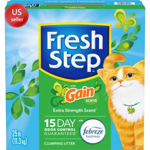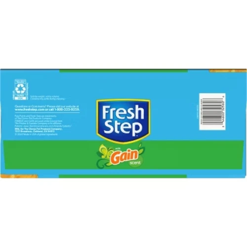 Description Get total odor control in your cats litter box with Fresh Step Clumping Litter with Febreze Freshness and Gain Scent. Formulated with activated carbon and Ammonia Block Technology, this clumping cat litter eliminates the strongest kitty litter box smells and guarantees 15 days of odor control (1). A paw activated scent is released every time your cat uses the litter box, leaving your litter box smelling Febreze fresh with the scent of Gain. Fresh Step ClumpLock Technology locks in liquid and odor on contact to form tight clumps and make scooping easy. In addition to easy cat litter clumping, this litter has low dust formula to help keep your floors and cat litter box area cleaner. Enjoy more catnaps and cuddle time with your kitty when you choose Fresh Step cat litter. (1) See package for more information on terms and conditions.Usage Directions: For best results, do not mix with non clumping cat litter. For first time use, start with an empty, clean cat litter box. Fill it with 3 to 4 inches of Fresh Step Cat Litter. Remove clumps and solids daily and dispose in trash. Do not flush. The rest of the litter stays fresh. Add more Fresh Step Cat Litter to refresh your litter box each time you scoop. Maintain level of litter at 3 to 4 inches.Caution Statements: As a reminder, especially to pregnant women and immunosuppressed persons, cat feces can sometimes transmit a disease called toxoplasmosis. Therefore, always remember to wash hands thoroughly after handling used cat litter. For further information, consult your doctor. Unused cat litter poses no toxoplasmosis threat. Caution: Do not use this product as a traction aid because product becomes slippery and slick when wet. highlights CLUMPING CAT LITTER: One 25 lb. box of Fresh Step Clumping Litter with Febreze Freshness and Gain Scent, activated carbon kitty litter that keeps litter boxes smelling fresh 15 DAYS OF ODOR CONTROL: Activated charcoal and Ammonia Block Technology in this cat litter help eliminate the strongest kitty litter box odors and guarantee 15 days of odor control (1) RAPID LIQUID ABSORPTION: Fresh Step Clumping Cat Litter quickly absorbs liquid, helping to maintain a clean litter box environment for your cat's comfort FORMS TIGHT CLUMPS: Fresh Step ClumpLock technology locks in liquid and odor on contact and causes immediate kitty litter clumping to make scooping easy and prevent crumbles from being left behind FRESH, CLEAN SMELL: Fresh Step clumping cat litter with Febreze freshness and Gain scent helps keep your cat’s litter box smelling clean and inviting LOW DUST FORMULA: Low dust Fresh Step clumping cat litter formula helps keep your floors and cat litter box area cleaner PET FRIENDLY PARTICLES: This clumping cat litter is made with small, smooth particles that are gentle on cats’ paws for easy digging and ultimate comfort FIND YOUR FRESH STEP: Whether you have one fab feline or a family of fur friends, explore Fresh Step’s full line of cat litter formulas to find the purr-fect litter for you