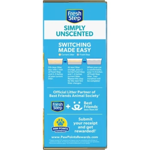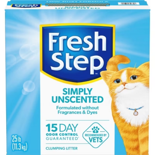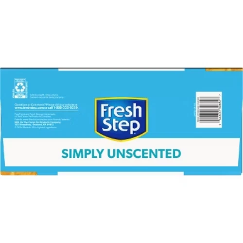 Dear Valued Customers, Before you place your order, we’d like to share a few important details to ensure a smooth shopping experience: Fresh & Long-Lasting Products: All items are recently produced with a shelf life of 12+ months. If you encounter any issues, simply contact us for a full refund—no questions asked. Free Shipping (with Some Limitations): Currently, we cannot deliver to warehouse addresses or forwarding addresses. We’re actively working to expand our shipping coverage, but if your location isn’t serviceable, you’ll receive an automatic full refund—no risk to you. Eco-Friendly & Branded Packaging: To keep costs low (and pass the savings to you!), we ship in recyclable boxes with our logo. Your satisfaction is our priority. If you have any questions, just reply to this message—we’re happy to help! Thank you for trusting us. Jessica Description Get odor control in your cats litter box with Fresh Step Simply Unscented Clumping Litter. This clumping litter uses clay, carbon and minerals to fight odors without added fragrances or dyes. Specially formulated to inhibit the growth of bacterial odor on the litter, Fresh Step unscented cat litter with Activated Charcoal Technology has the same 15 day odor control as scented Fresh Step cat litter to keep the litter box smelling fresh. The high quality clumping cat litter clumps tight for easy scooping and helps prevent stinky crumbles from being left behind in the kitty litter box. In addition to easy cat litter clumping, this litter has a low dust formula to help keep your floors and other surfaces cleaner. Created with your cat's health and happiness in mind, no added fragrance Fresh Step clumping cat litter is recommended by veterinarians. Enjoy more catnaps and cuddle time with your kitty when you choose Fresh Step cat litter.Usage Directions: For best results, do not mix with non-clumping cat litter. For first time use, start with an empty, clean cat litter box. Fill your clean litter box with 3 to 4 inches of Fresh Step Simply Unscented Cat Litter. Remove clumps and solids daily and dispose in trash. Do not flush. The rest of the litter stays fresh. Add more litter to refresh your litter box each time you scoop. Maintain level of litter at 3 to 4 inches.Caution Statements: As a reminder, especially to pregnant women and immunosuppressed persons, cat feces can sometimes transmit a disease called toxoplasmosis. Therefore, always remember to wash hands thoroughly after handling used cat litter. For further information, consult your doctor. Unused cat litter poses no toxoplasmosis threat. Caution: Do not use this product as a traction aid because product becomes slippery and slick when wet. highlights FRESH STEP UNSCENTED CAT LITTER: One 25 lb. box of Fresh Step Simply Unscented Clumping Litter, activated charcoal kitty litter that's perfect for those who prefer Fresh Step cat litter unscented PREVENTS BACTERIAL ODOR GROWTH ON LITTER: Unscented litter with Activated Charcoal Technology has the same 15 day odor control as scented Fresh Step cat litter RAPID LIQUID ABSORPTION: Fresh Step Clumping Cat Litter quickly absorbs liquids, helping to maintain a clean litter box environment for your cat's comfort FORMS TIGHT CLUMPS: Kitty litter clumping makes scooping easy and prevents crumbles from being left behind NO ADDED DYES OR FRAGRANCES: Unscented clumping litter uses clay, carbon and minerals to stop odors on contact without the use of added fragrances or dyes LOW DUST FORMULA: Low dust Fresh Step clumping cat litter formula helps keep your floors and cat litter box area cleaner VETERINARIAN RECOMMENDED: Created with your cat's health and happiness in mind, this unscented Fresh Step clumping cat litter is recommended by veterinarians FIND YOUR FRESH STEP: Whether you have one fab feline or a family of fur friends, explore Fresh Step’s full line of cat litter formulas to find the purr-fect litter for you