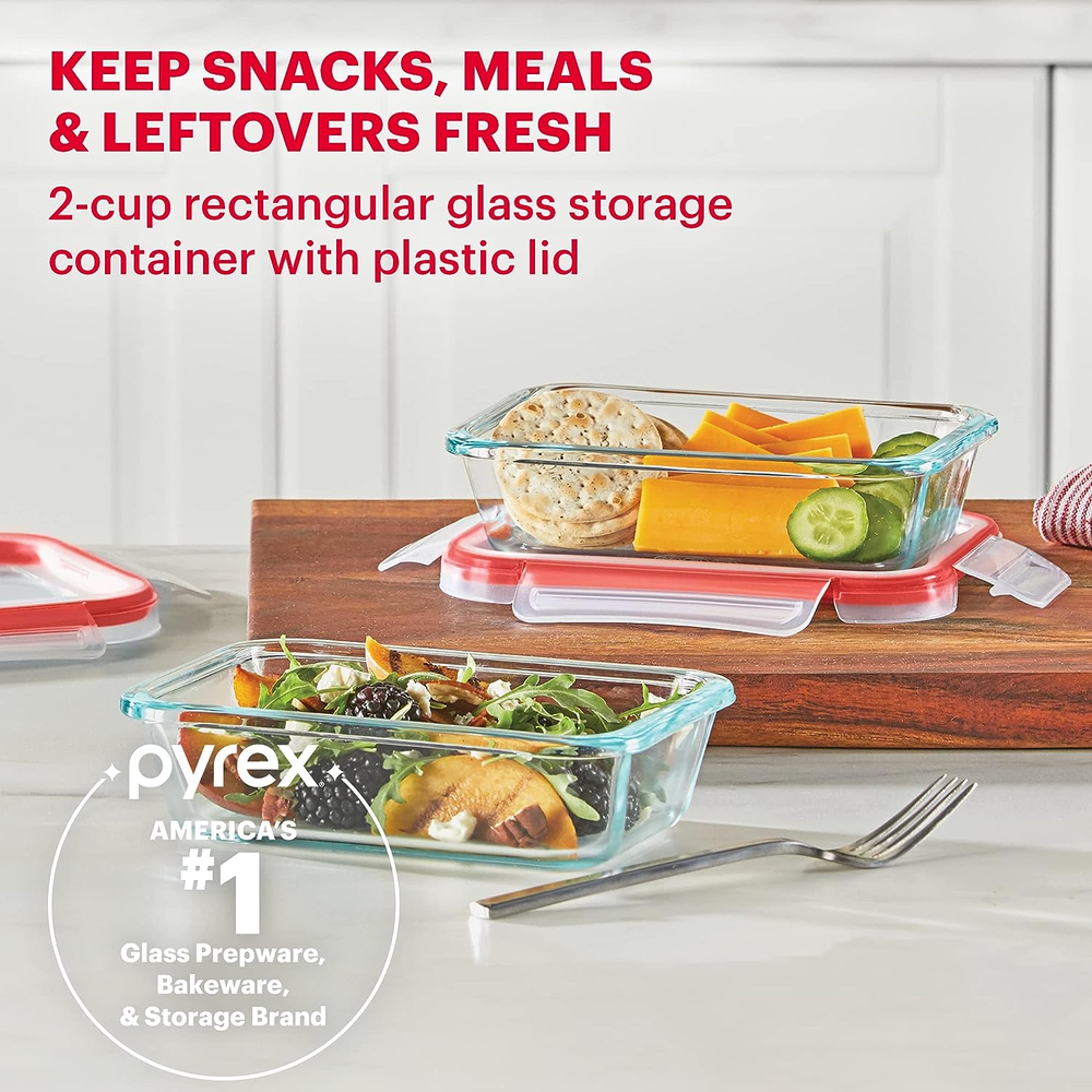 2-CUP: This small 2 cup sized rectangular glass food container comes with a BPA-free plastic lid that is perfect for storing light snacks such as fruits and nuts. AIRTIGHT & LEAK-PROOF LIDS: The locking lids with 4 locking tabs are airtight and leakproof, so you can take it on the road or store for later. DURABLE GLASS: Pyrex glass containers resist stains and does not absorb food odors or flavors, making them easy to clean and maintain. Containers are top-rack dishwasher, freezer and microwave safe. WRITE + ERASE LABEL: All lids have built-in Write + Erase labels so you can keep track of what's inside. PYREX IS THE #1 BRAND OF GLASS STORAGE*: Loved for generations, experienced cooks and beginners alike have reached for Pyrex brand glassware products, because they’re affordable, durable, and great for all their cooking, serving and storing needs. Source: The NPD Group / Retail Tracking Service, dollar sales, 12 ME December 2022 Good food is good to go—to freezer, to office to fridge or cupboard— thanks to airtight, leakproof, lock-in-place lids and durable Pyrex® glass containers that keep food fresh when you store it, pack it or freeze it. This 2-cup container is ideal for meal prep, single portions, sides, or snacks to go. Pop them into the microwave for easy reheating or place them in the dishwasher making cleanup a breeze. Plus, a built-in reusable label helps keep things organized. Just fill, label and stack, and then easily nest them together until next time.