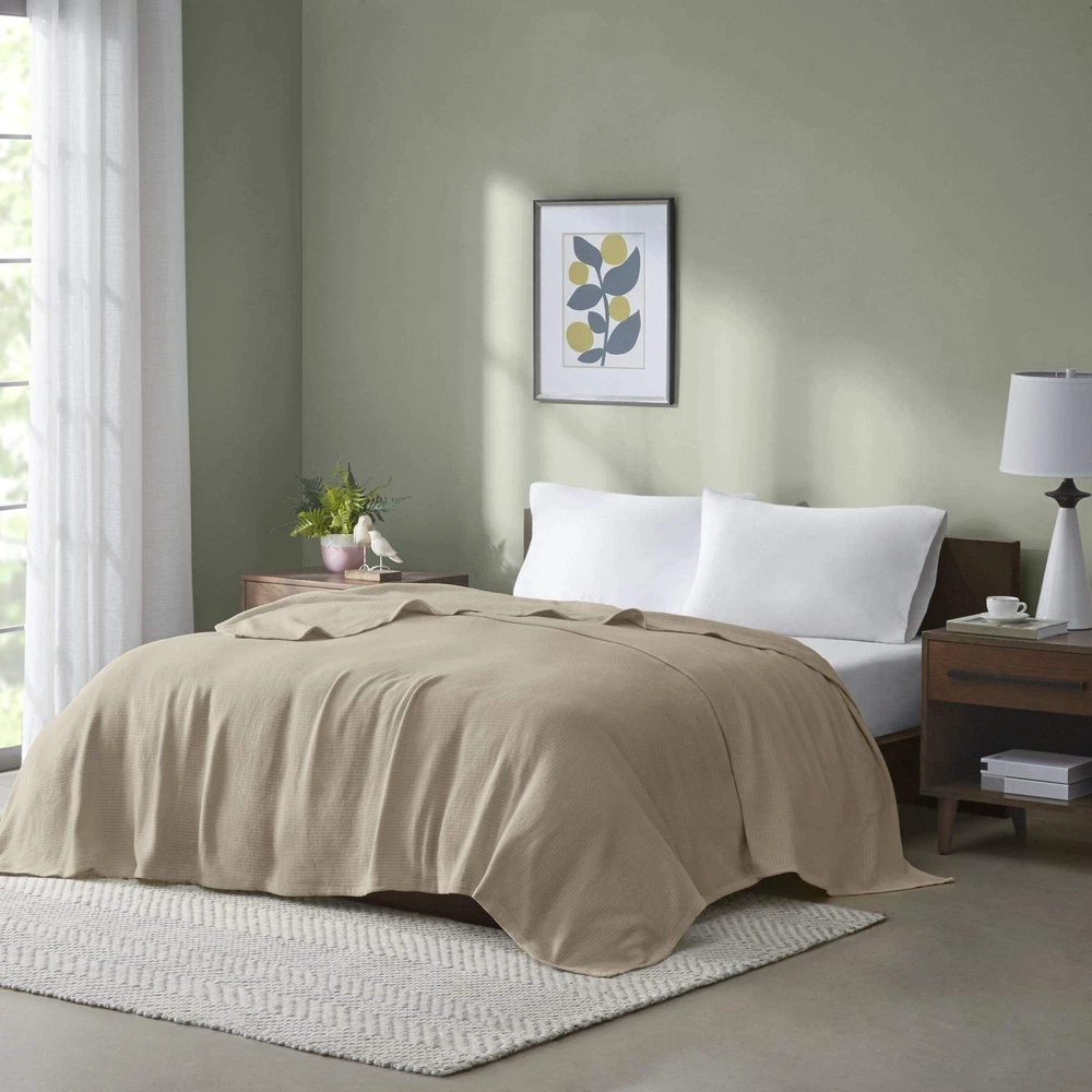 The cotton blanket is OEKO-TEX certified, meaning it does not contain any harmful substances or chemicals to ensure quality comfort and wellness. The Freshspun blanket features a classic basket weave pattern. Made from high quality first pick upland cotton, this lightweight blanket is perfect for year round use. 100% cotton basketweave 100% cotton, 250gsm 1 Blanket:66x90" MACHINE WASH COLD, GENTLE CYCLE, AND SEPARATELY. DO NOT BLEACH. TUMBLE DRY LOW, REMOVE PROMPTLY. IRON WITH WARM TEMPERATURE. IF THERE IS NO FREE MOVEMENT IN THE WASHER OR DRYER, USE LARGE CAPACITY COMMERCIAL WASHER/DRYER.