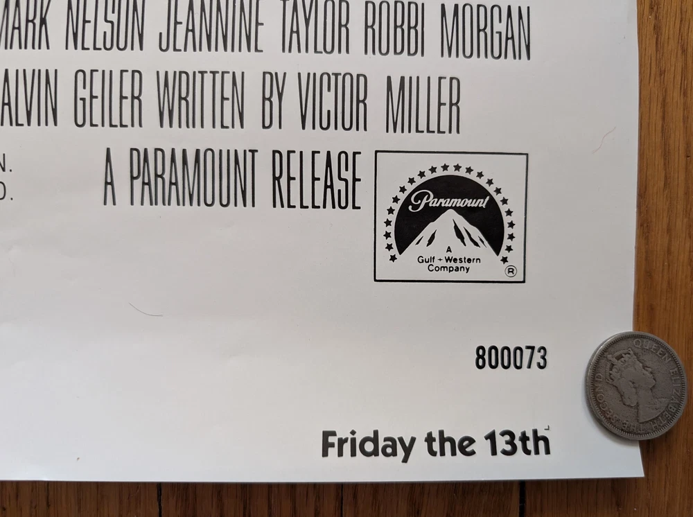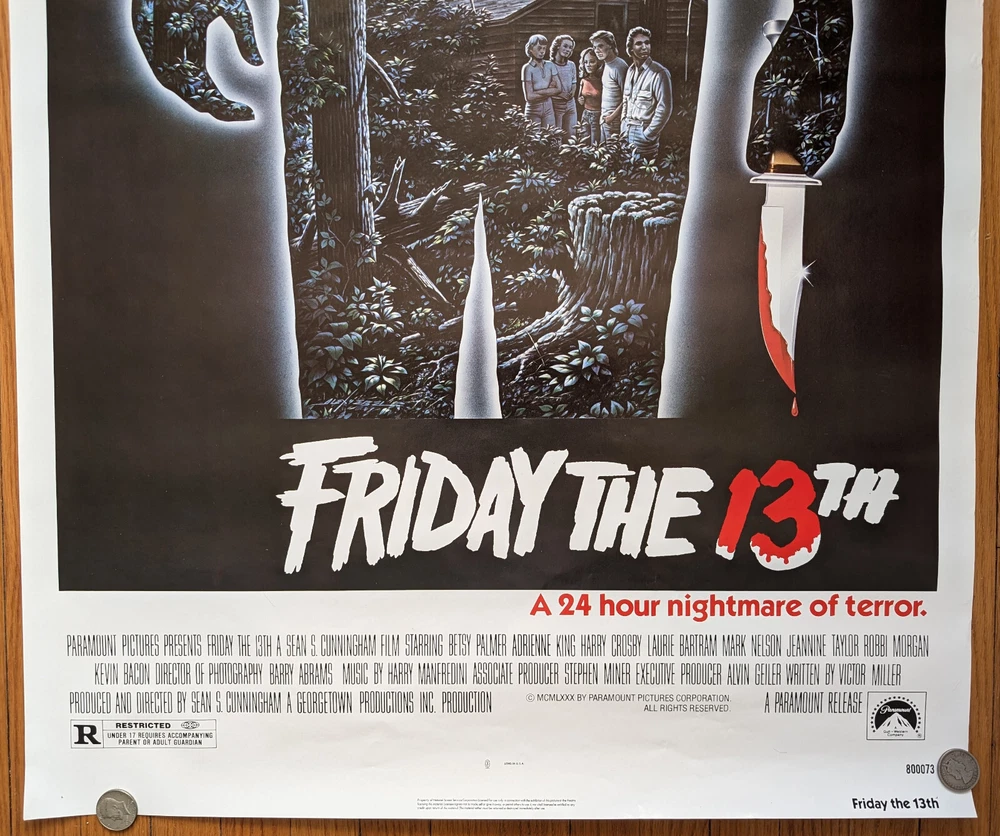 An original unused, rolled 1-sheet from the original horror classic Friday the 13th. Great condition. Has some light waviness from being stored rolled. No tears or marks. Please review the photos for condition. Shipped rolled in a sturdy tube. I worked in movie theaters from 1972 to 1983 and this is one of the many items of movie memorabilia that I saved. This has been in my possession since 1980. MohawkValley20 has many other movie items listed as well as vintage paper, ephemera, and other collectibles. Please check out our other listings.