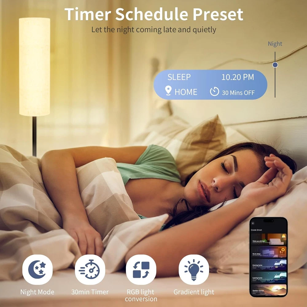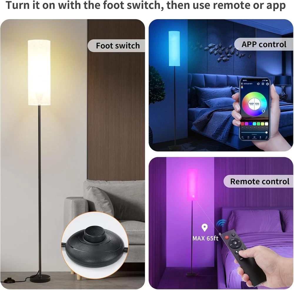 Frideko Floor Lamps for Living Room, Dimmable 3 Colors Temperature, Beige Product Details Base Material: Metal Bulb Base: E26 Product Dimensions: 5"D x 5"W x 68.11"H Lamp Type: Floor Lamp Shade Color: Beige Shade Material: Linen Switch Type: Foot Style: Modern Brand: FRIDEKO HOME Color: Beige Special Feature: 3-Way, Adjustable Color Temperature, Dimmable, Timer, Color Changing Light Source Type: LED Material: Metal Room Type: Office, Bedroom, Living Room, Playroom, Study Room Recommended Uses For Product: Reading Power Source: Corded Electric Controller Type: APP Control, Remote Control, Foot-Switch Number of Light Sources: 1 Connectivity Technology: Bluetooth Included Components: Lamp Pole& Base x 1, Corded with E26 base& On-Off Switch x 1, Lampshade x 1, Remote Control x 1, RGB Smart LED Bulb x 1 Bulb Shape Size: A19 Mounting Type: Floor Mount Wattage: 10 watts Number of Items: 1 Lighting Method: LED Control Method: App, Remote Indoor/Outdoor Usage: Indoor Specific Uses For Product: Reading Water Resistance Level: Not Water Resistant Installation Type: Freestanding Number of Pieces: 1 Connectivity Protocol: Bluetooth Voltage: 120 Volts Brightness: 800 Lumen Is Cordless?: No Is Electric: Yes Manufacturer: FRIDEKO HOME Part Number: FD02 Item Weight: 4.33 pounds Country of Origin: China Item model number: FD02 Special Features: 3-Way, Adjustable Color Temperature, Dimmable, Timer, Color Changing Batteries Included?: No Batteries Required?: Yes Color Temperature: 6500 Kelvin Product Dimensions : 5 x 5 x 68.11 inches; 4.34 Pounds Item model number : FD02 Manufacturer : FRIDEKO HOME Country of Origin : China Base Material: Metal Bulb Base: E26 Product Dimensions: 5"D x 5"W x 68.11"H Lamp Type: Floor Lamp Shade Color: Beige 【Dynamic RGB Mode】To use this RGB floor lamp, start by turning it on with the foot switch. After that, you can control it with either a remote or a smartphone app. The bedroom floor lamp offers 16 million colors to choose from, and you can easily adjust the brightness and color modes. The floor lamps for living room also includes a 30-minute timer feature,which you can set using the remote or the app. (PS:App isn’t compatible with Alexa) 【APP Control: DIY& Sync with Music 】You can choose a favorite color and adjust the color temperature using the app. The floor lamp for bedroom also has a music rhythm feature that changes the colors and brightness to match the beat of the music. It's a fun way to liven up your parties with an awesome music and light experience! 【Stepless Dimmable】This smart LED bulb delivers 800 lumens and offers color temperatures ranging from 2700K to 6500K, allowing you to enjoy warm white, natural white, and cool white light. With 0%-100% stepless dimming, you can easily switch between warm and cool light. You can adjust the color temperature and brightness using the remote, making it simple to create the perfect ambiance in any room. 【Modern Design】This corner floor lamp has a stable, compact base. Its upright design fits nicely in Livingroom next to sofas, recliners, and desks, saving space and ensuring safety. The black pole floor lamp has a minimalist and modern look that suits various home styles. 【Various use scenarios】This led bright floor lamp is perfect for creating a relaxing atmosphere for various activities. Whether you're hosting a get-together, enjoying a movie night, gaming, or reading, you can set the mood just right. The ability to customize the color and brightness allows you to tailor the lighting to fit any occasion, making it a versatile addition to any room. 【Easy installation 】The tall floor lamp is easy to install—no extra tools are needed. Just follow the instructions to screw in all the parts, and you'll be ready to enjoy customizable lighting!