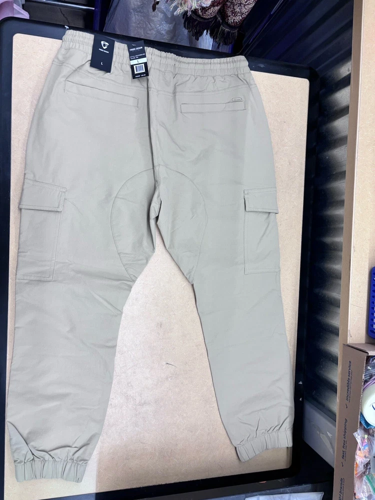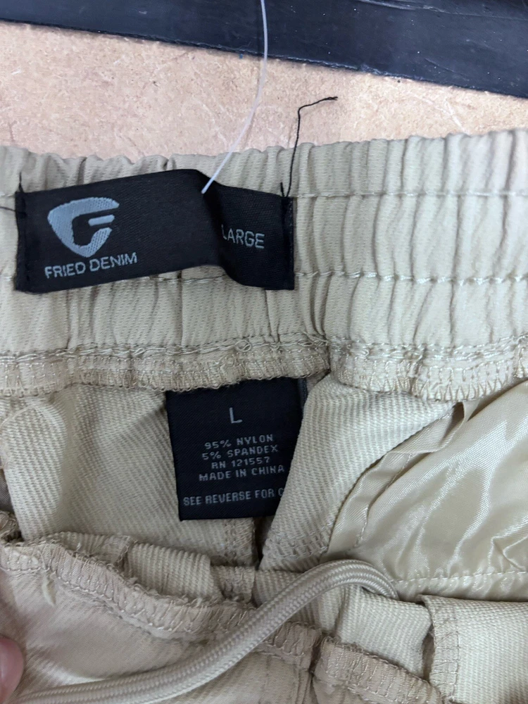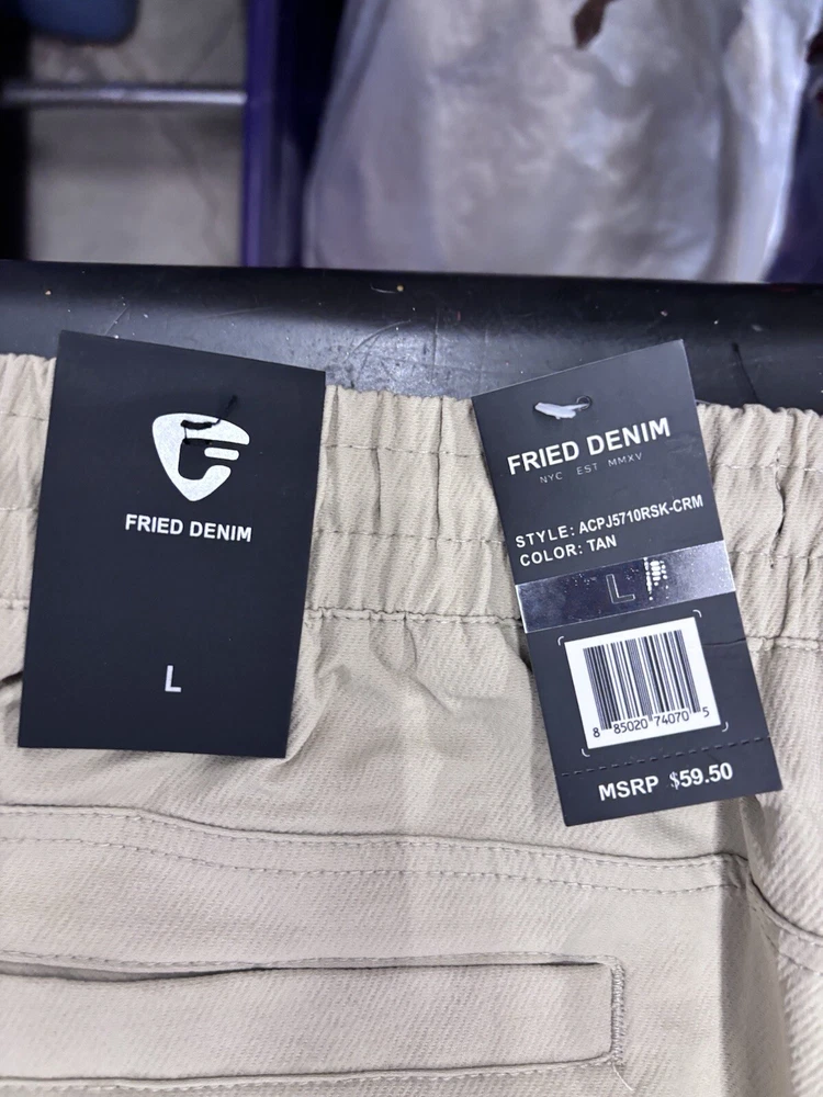 Elevate your travel or casual wardrobe with these stylish and comfortable Fried Denim jogger pants. The khaki cargo style pants are made of a durable and breathable blend of polyester and spandex fabric with a tapered leg and flat front. The elastic waist and drawstring closure provide a comfortable fit for men's size L These pants feature multiple pockets, including a logo accent, and are perfect for everyday wear or travel. The solid pattern and classic American theme make these pants a great addition to any wardrobe. The nyllon fabric type ensures durability and the Fried Denim product line guarantees quality.