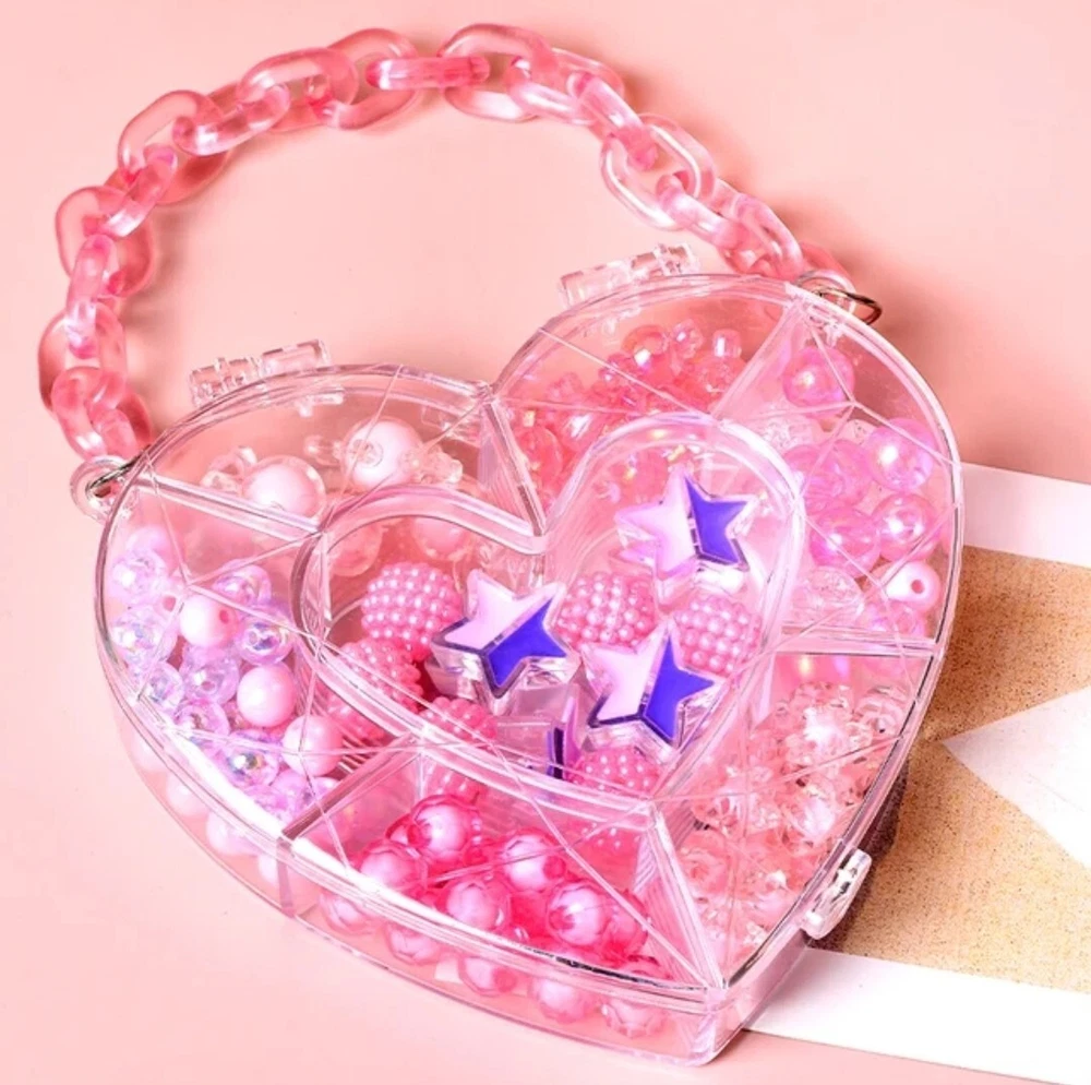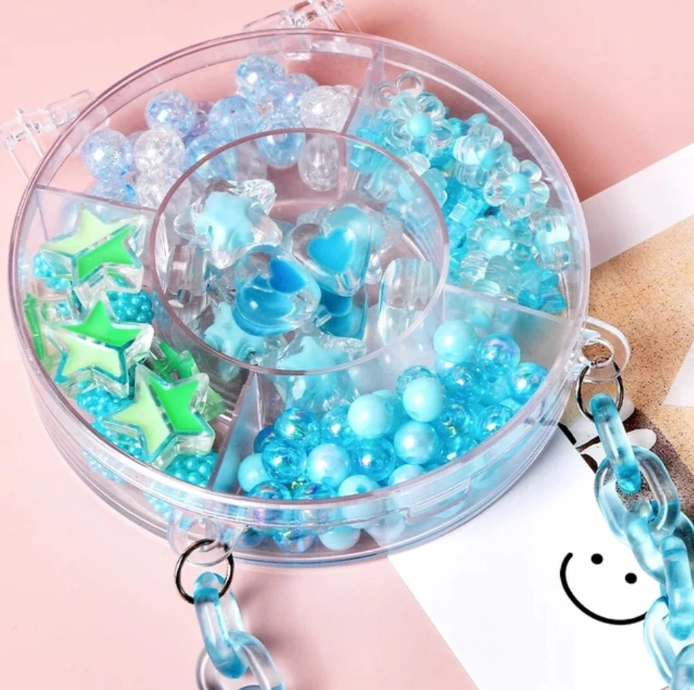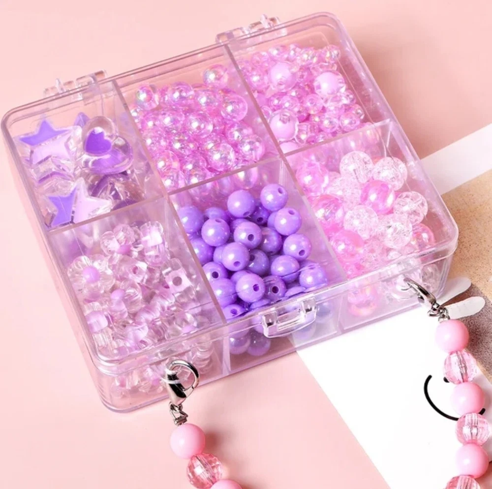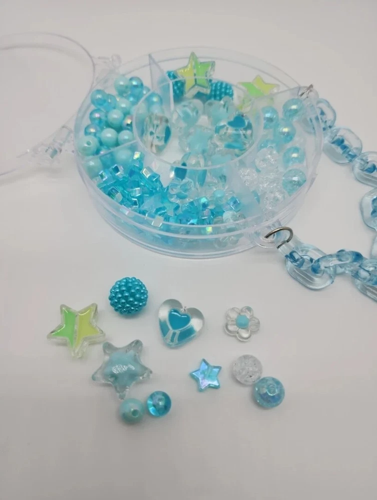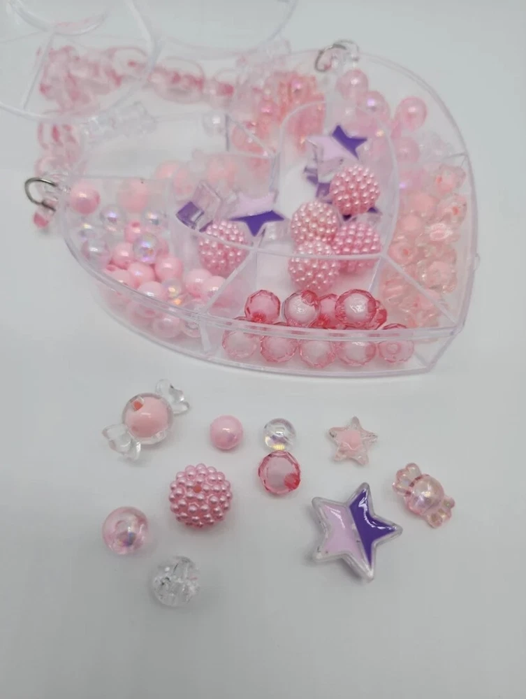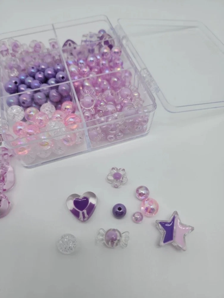 DIY Bead Kits | Friendship Bracelet Kit | Acrylic Beads | Plastic Beads | Kawaii, Cute, Festival Kandi, Jewelry, Crafting, Gifts , DIY and More! Clear plastic storage container "purse" filled with acrylic beads. The size of the beads included varies between 5mm and 20mm. The size of the hole on each bead varies between 2mm and 4mm. Use this random mix of acrylic beads to start endless projects! Perfect for numerous crafts! Create phone straps, keychains, jewelry (including friendship bracelets and necklaces), or kandi. Add these beads as embellishments on clothing and other sewing projects. Accessorize your hair or decorate a pair of sunglasses! Pink Heart Purse: around 45g of beads included. Purple Rectangle Purse: around 80g of beads included. Blue Circle Purse: around 55g of beads included. (String/Cord not included) Warning: Nothing included is edible. Please use under the supervision of a responsible adult. Not suitable for young children.
