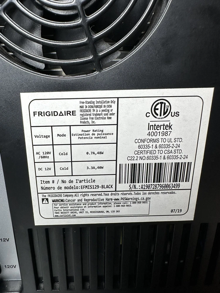 Number of Freezer Compartments:1Bottle Capacity:6 cansColor:BlackNumber of Shelves:1Item Width:7 inDefrost Method:Manual DefrostType:Portable FridgeFinish:PaintedNumber of Drawers:1Item Height:10.5 in.Brand:FrigidaireMaterial:PlasticNumber of Doors:1Features:Retro StyleInstallation:Tabletop UnitModel:EFMIS129Door Style:Opens Right