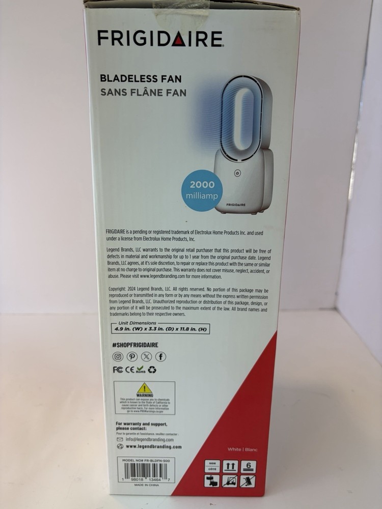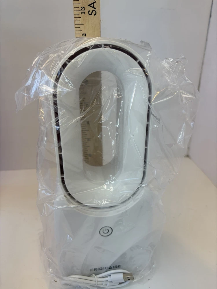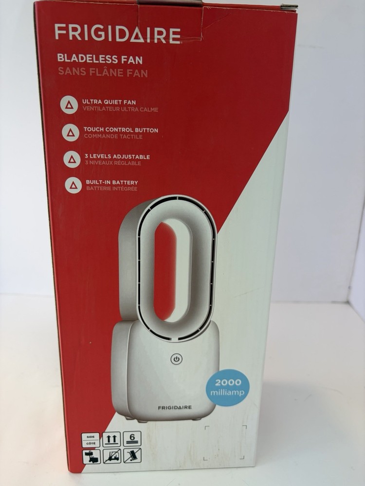 The Frigidaire Bladeless Fan is a brand new open boxed portable fan powered by a battery with a capacity of 2000 milliamps. This fan features touch control buttons for easy operation, ultra-quiet functionality, three levels of adjustable speed, and a built-in battery for convenience. The sleek white design makes it a stylish addition to any room, providing efficient and powerful cooling while ensuring safety with its bladeless design. Perfect for improving indoor air quality and creating a comfortable environment in any home setting.