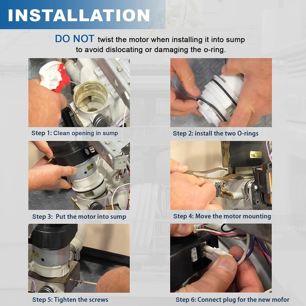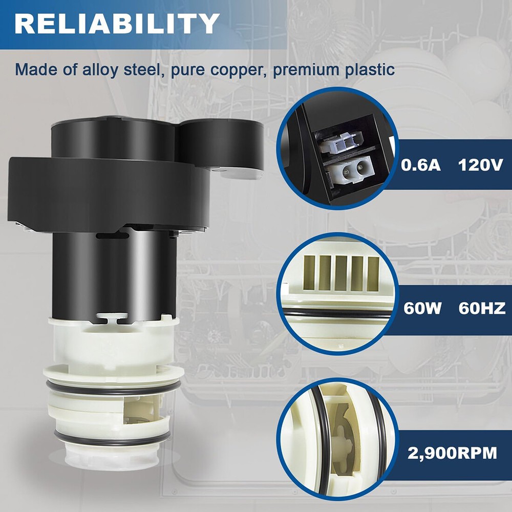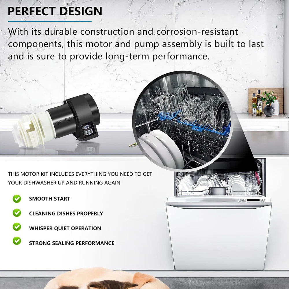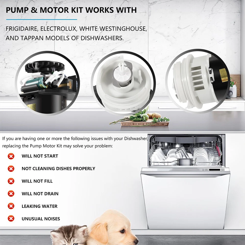 Fitment: 154844101 Motor kit applicable for Frigidaire, for Kelvinator, for Kenmore, for Sears dishwashers. Replacement for 154483001 154795001 154719201 154793001 154574601 154579701 154700001 AH3501022 EA3501022 PS3501022 Features: 1) Made of alloy steel, pure copper, and superior plastic. The material provides strength, durability, corrosion resistance and excellent electrical conductivity. These components keep the circulation pump with efficient and consistent performance that withstands constant exposure to water& temperature fluctuations 2) The dishwasher motor replacement propels water forcefully and ensures optimal water pressure to spray arms, allowing them to effectively disperse water and detergent onto dishes during the wash cycle 3) Ensure dishes receiving a thorough rinse and cleaning. Provide consistent water pressure and even distribution. Operate at a little noise level to keep a quiet dishwasher running experience 4) Voltage: 120 V, Frequency: 60 Hz, Current: 0.5 A, Wattage: 60 W, Speed: 2,900 RPM 5) To get the dishwasher out from under counter. Then unplug harness and remove bracket to pull out the old pump. Put in the new pump, install bracket, and plug in the harness. Finished within several minutes and without complicated tools Package included: 154844101 Motor kit