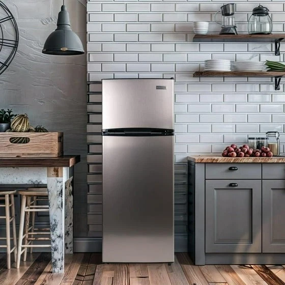 About this item Product details Your Frigidaire 7.5 cu. ft. Top-Freezer Refrigerator with Platinum design look features upfront temperature controls that make it simple to regulate both the fresh food and freezer sections. Adjustable shelves provide flexibility to meet your food storage needs. Combines easy-to-use features with practical design to complement any kitchen. Maintenance is easy with the convenient cycle defrost system and finding your favorite beverages is a breeze due to the tall bottle storage in the door. There are three adjustable glass refrigerator shelves and one adjustable/removable wire freezer shelf to provide maximum and versatile storage space. Your vegetables will stay cool and easy to find in the glass cover crisper. Left or right-handed opening is your choice with the reversible door hinge and this sturdy refrigerator can be installed against a wall with its smooth back design. 7.5 cu. ft. of standard storage capacity lets you stock up on all of your favorite foods Easily accessible temperature controls make temperature management easy New Spill-proof glass shelves contain spills and simplify cleanup, preventing liquids from leaking on to shelves below Sleek platinum design adds a touch of elegance to any space Transparent crisper for easy visibility and organization of fresh produce Interior light illuminates the contents for convenient access, even in low light Reversible door allows for flexible placement and convenient access options Dedicated freezer compartment for frozen food storage Adjustable and removable glass shelves for customizable storage options Full-width door bin for convenient storage of bottles and larger items More details Volts 115 V Brand Frigidaire Model EFR780-6COM Refrigerator Feature Freezer, Reversible Door Hinges Assembled Product Weight 83 lb Manufacturer Part Number EFR780-6COM Manufacturer CURTIS INTERNATIONAL LTD. Number of Shelves 4 Shelf Material Glass Number of Drawers 1 Number of Bins 5 Installation Type Freestanding Assembled Product Dimensions (L x W x H) 21.50 x 21.45 x 55.50 Inches