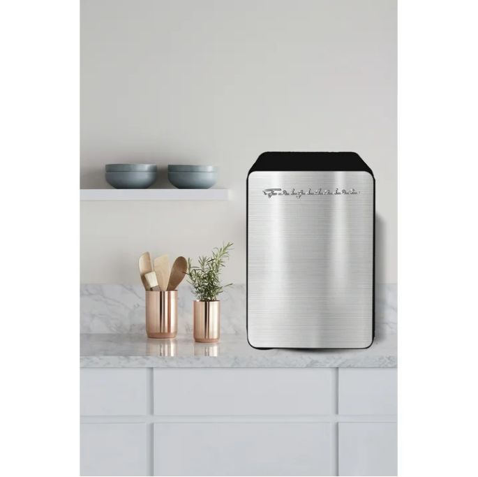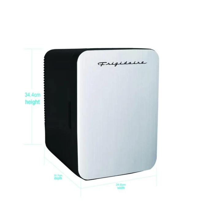 This silver stainless steel compact refrigerator keeps drinks, snacks, small meals, and skincare products ice-cold, with a fun, retro-inspired design that infuses a little fun into everyday life. The Frigidaire mini-fridge is built to last, using the same robust technology that has made Frigidaire one of the most trusted names in household appliances for nearly a century. Two shelves allow for storing multiple items, and an in-door shelf allows you to easily store any sheet mask when using it as a skincare fridge. A vintage logo enhances the nostalgia-inspired look and feel. Versatile Storage: Conveniently store snacks, beverages, medication, breast milk, insulin, and skin care products with ease. Compact and Portable: Fits perfectly on your desk, bookshelf, or any handy spot in your home or office. Ample Capacity: This mini fridge can hold up to 15 cans or 10 liters of your favorite items. Makeup Storage Solution: Perfect for organizing your makeup at home or while on the go. Extend Product Shelf Life: The thermoelectric cooling system chills your skincare products, helping to extend their shelf life. Stylish Retro Design: A fun and attractive stainless steel design adds a touch of retro charm to your space. Whisper-Quiet Cooling: Enjoy dependable thermoelectric cooling that operates quietly and free from vibrations. Our mini beverage fridge is engineered to chill beverages 26-28°F below the ambient temperature. However, the extent of cooling achieved may vary based on the surrounding environment. Multiple Storage Options: Two shelves offer ample storage for various items, and the in-door shelf is ideal for holding sheet masks and more. Perfect for Any Space: Ideal for dorm rooms, vehicles, cubicles, nurseries, or any place where you need simple drink storage. Secure Locking Latch: Keep your items safe and secure with the built-in locking latch. Energy-Efficient: This economical design consumes significantly less power than a traditional refrigerator. Please allow 2 hours for it to reach the optimal temperature. Dual Power Options: It conveniently plugs into a 12V car adapter or a home outlet, and both cords are included for your convenience. Stylish Stainless Steel: The sleek and modern stainless steel silver finish complements any decor.