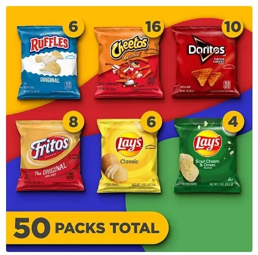Frito-Lay Classic Mix Variety Pack Chips is an American snack assortment featuring Balsamic Vinegar flavored chips. Each 40-gram serving contains 101-200 calories. The pack includes 50 single-serve bags, GMO-free, and made in the United States. It is a pantry staple from the brand Frito-Lay2GO.
