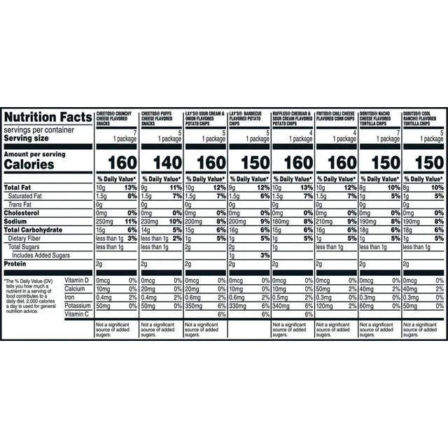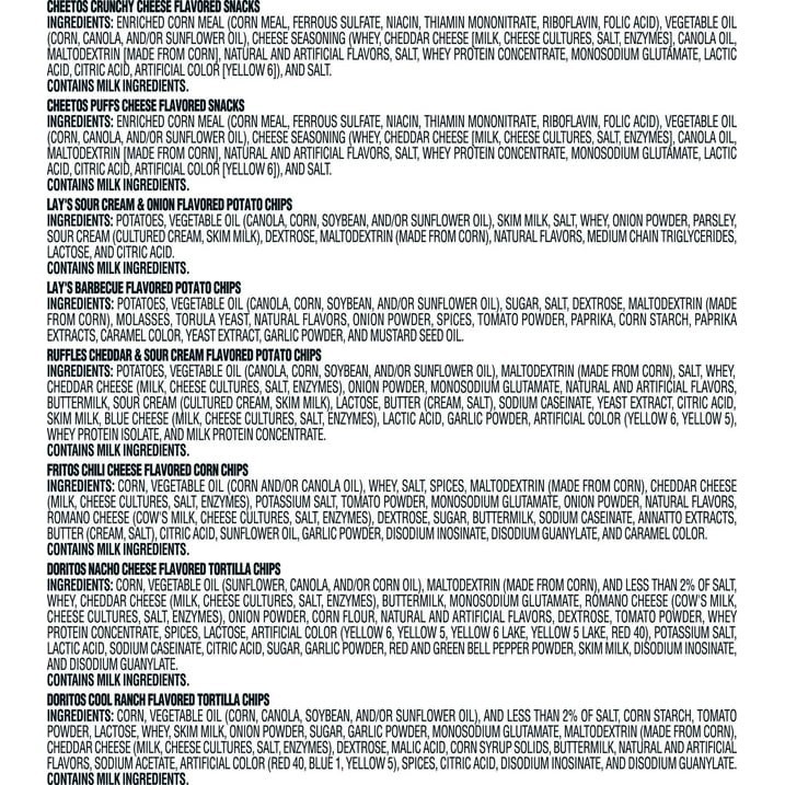 The Frito-Lay Flavor Mix Variety Pack Snack Chips is a multipack containing 42 assorted bags of chips. These American-style snack chips come in a convenient assortment & multipack packaging, making them perfect for snacking on-the-go. The product includes allergens such as milk, and is ideal for those who enjoy a variety of flavors in their snack chips. This variety pack is a pantry staple for anyone looking for delicious and savory snacks.