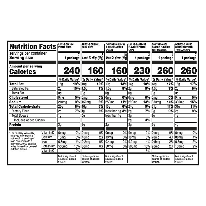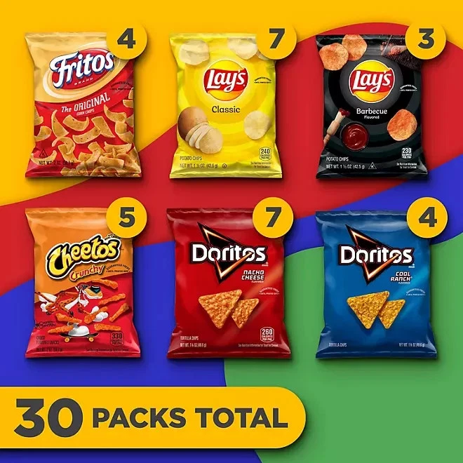 Frito-Lay Classic Variety Pack – Assorted Chips & Snacks – Perfect for Parties, Lunches & On-the-Go 🎉 Perfect Snack Pack for Every Occasion Keep everyone satisfied with the Frito-Lay Classic Variety Pack , featuring an irresistible assortment of your favorite chips and snacks. Whether it’s for school lunches, office break rooms, road trips, or family movie nights, this pack offers the ideal portion size and flavor variety to please every palate. 🥪 Great for Lunches, Parties & More From lunchboxes to snack tables, Frito-Lay makes it easy to grab, go, and enjoy . Each individually portioned bag is sealed for freshness, making it perfect for: School snacks & lunchboxes Office pantries & break rooms Picnics, road trips & camping Game nights, parties & get-togethers 🧂 A Delicious Assortment Everyone Loves This classic variety includes some of the most popular Frito-Lay chips, offering a mix of savory flavors and satisfying crunch in every bite. Perfect for both kids and adults. ✅ Trusted Brand, Quality Snacks Frito-Lay is known for crafting delicious, high-quality snacks that bring people together. Whether you’re relaxing at home or hosting a crowd, this variety pack ensures there’s something for everyone to enjoy . Product Features: Brand: Frito-Lay Type: Classic Variety Snack Pack Packaging: Individually wrapped snack-size bags Ideal for: Lunches, parties, travel, sharing Fresh, sealed packaging for long shelf life Stock up on flavor with the Frito-Lay Variety Pack – your go-to solution for convenient, crowd-pleasing snacks!