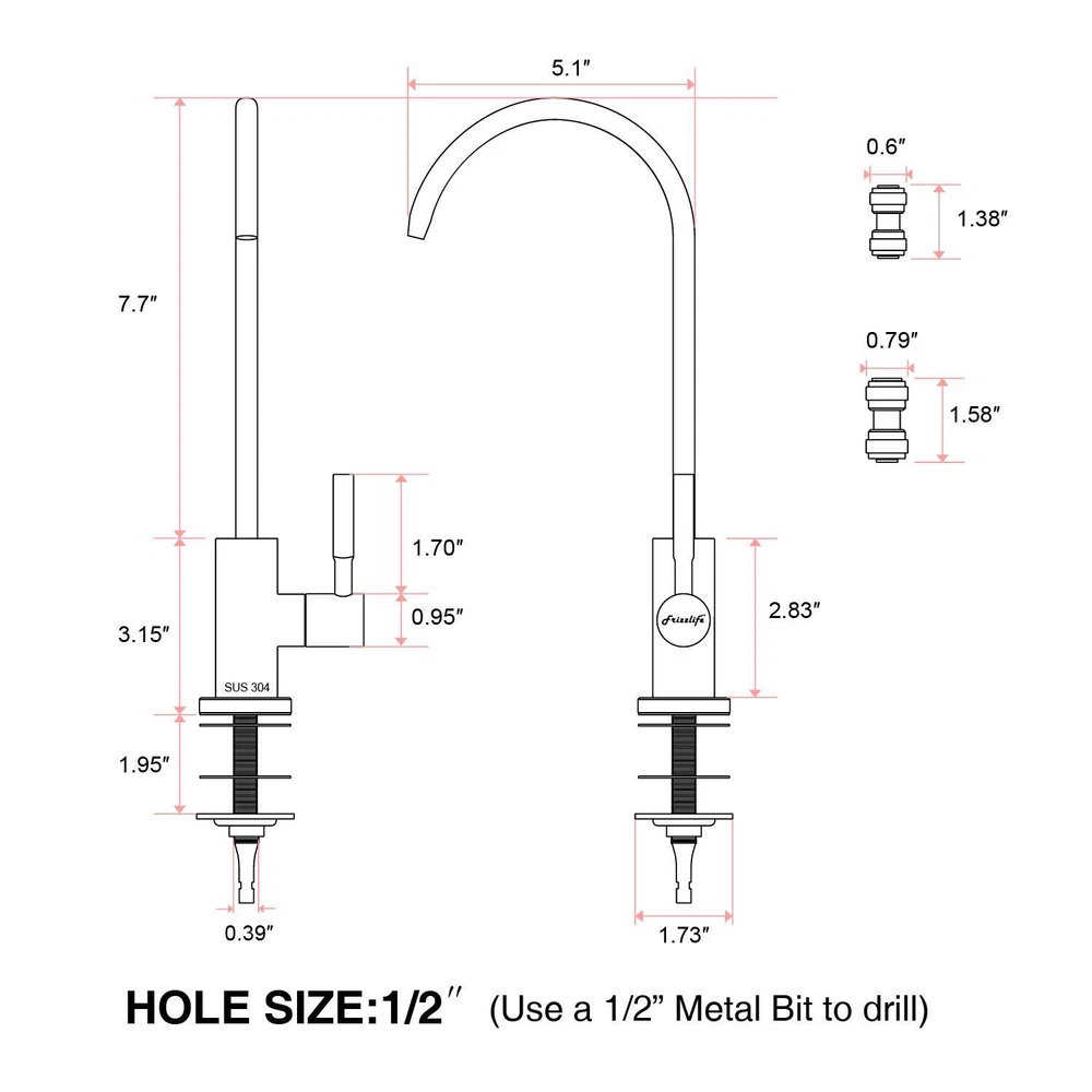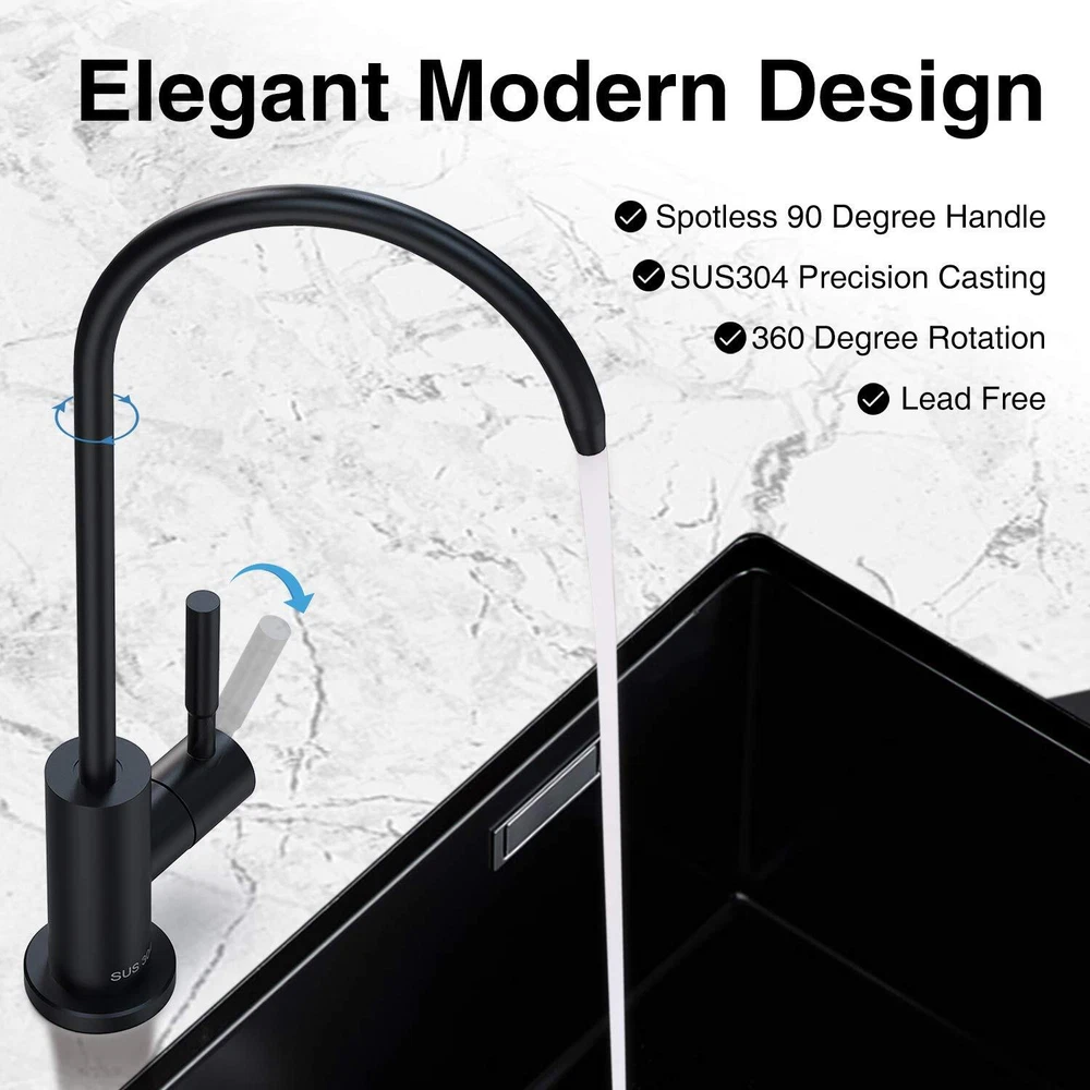 【PREMIUM LEAD-FREE MATERIAL DRINKING WATER FAUCET】 Constructed of premium LEAD-Free SUS304 stainless steel, the high-arch faucet body and handle are featured with reliability, keeping the water cleaner and safer for drinking. The Matte Black Finish of the faucet ensures no tarnish, scratches and corrosion. 【ELEGANT HANDLE DESIGN & 360 DEGREE SWIVEL SINK FAUCET】The water filter faucet comes with a 90 degree spotless single push operation level for quick and easy water control. 360 degree-- all the free rotation you want: high-arch spout design with 360-degree rotation offers more room for a variety of sink activities in kitchen. 【MODERN DESIGN AND QUICK CONNECTION】The Matte Black Finish RO faucet adds a touch of sophistication to any interior design. The package contains 2pcs 1/4" quick fitting, and a 1/4"-3/8" quick fitting for connection of the under sink RO system water filter or general water filtration system. Non Air Gap drinking water faucet. 【EASY INSTALLATION & HIGH FLOW WATER】Fixture hardware is included, fits for 0.5 inch to 1.73 inch kitchen sink hole. Suggest to use 1/2" Metal bit to drill. The faucet is designed to be easily settled, sturdy and stable. The stem of the faucet is 1.5 inch, suitable for most standard US kitchen. Perfect for BAR, KITCHEN SINK, DRINKING FOUNTAIN, WATER DISPENSER. Water Flow rate is 1.2 GPM to 1.5GPM. 【SUPERIOR QUALITY & 100% SATISFACTION】High grade Ceramic valve core has passed high pressure test, no leak, no drip. 3 years of limited warranty is guaranteed. With dedicated US support team, your 100% satisfaction is always our permanent goal.