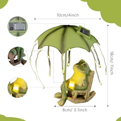 gtin13: Does Not Apply Material: Resin Style: Frog Theme: Frog Cartoon Character: Frog MPN: Does Not Apply Number of Items: 1 Item Length: 1 Date First Available: July 8, 2024 Occasion: Housewarming Product Care Instructions: Wipe Clean UPC: Does Not Apply Item model number: YL0009 Collection Name: All Seasons: All Seasons Product Dimensions: 2.16"D x 2.16"W x 2.95"H EAN: Does Not Apply Finish Type: Glossy Item Height: 1 Country of Origin: China Included Components: Frog Garden Decor Solar Recommended Uses For Product: Outdoor, Home Special Feature: Waterproof Color: Green Type: Does Not Apply Brand: Does Not Apply Item Width: 1 Item Weight: 10.8 ounces Manufacturer: Does Not Apply
