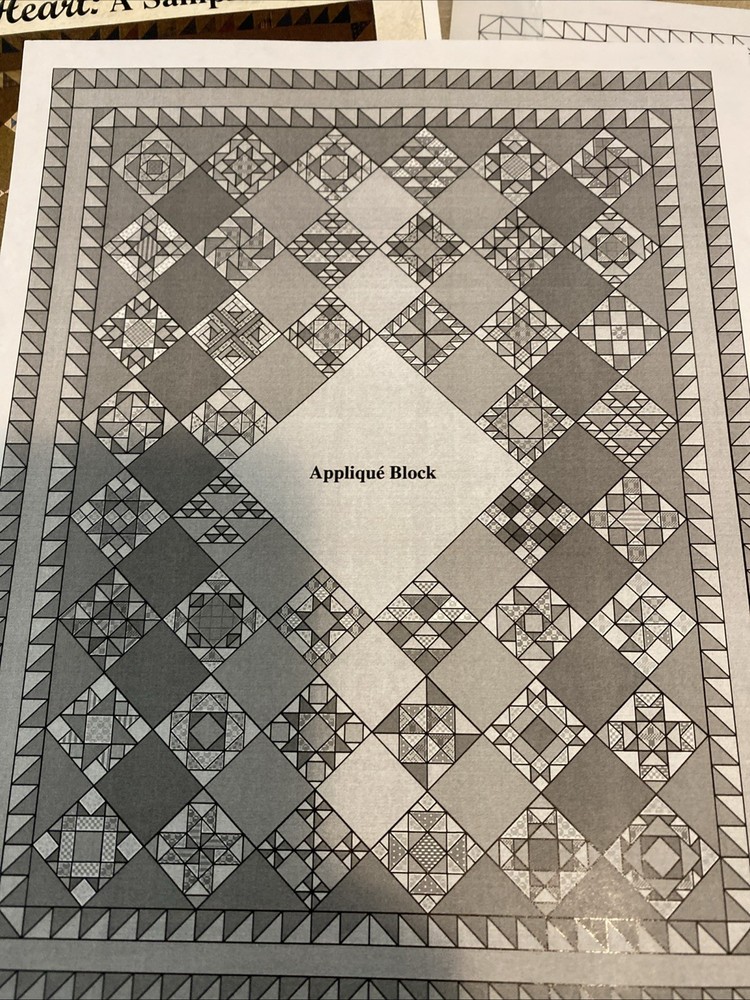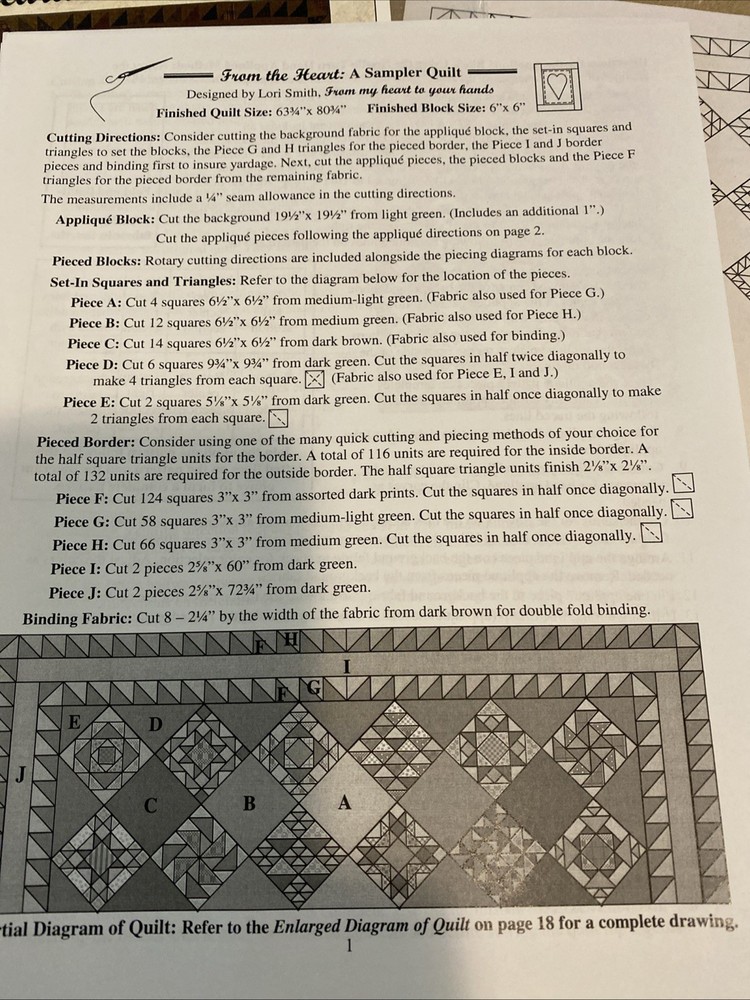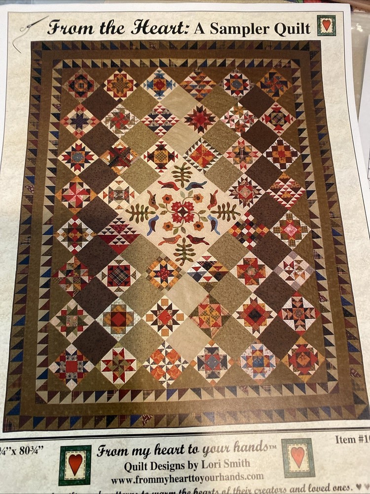 From The Heart: A Sampler Quilt Pattern 60 3/4” X 80 3/4” Item # 1005 Lori Smith is a beautiful quilt pattern that will bring charm to any room. The pattern includes pieced blocks and an appliquéd center block, showcasing intricate details that will impress any quilter. Made in the United States, this pattern is perfect for those who want to create a unique and timeless piece. Get your hands on this pattern today and start creating a masterpiece that you can cherish for years to come. There are patterns for 44 pieced blocks and pattern for center medallion that features bird and floral appliqués. Brand new, uncut.
