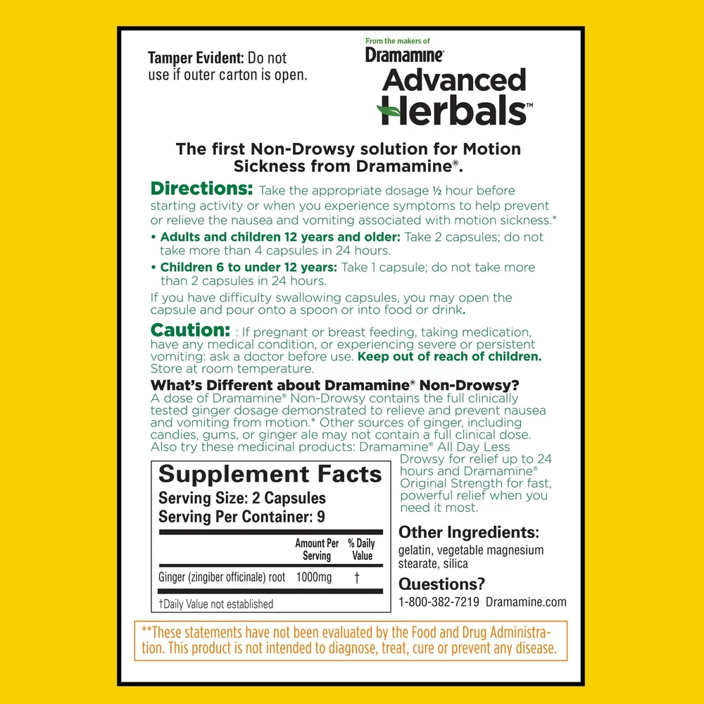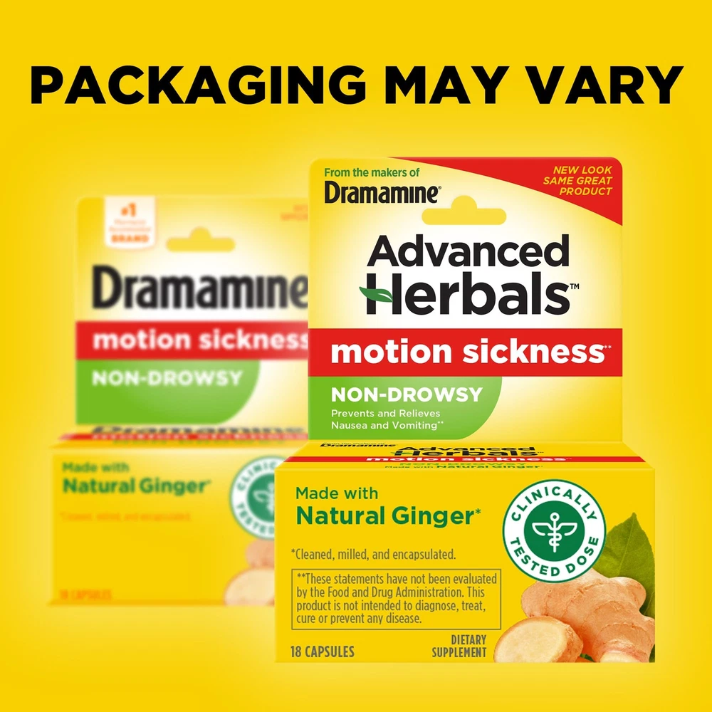 From the Makers of , Advanced Herbals, Non-Drowsy, Motion Sickness Relief, Made with Natural Ginger, 18 Count From the makers of , Advanced Herbals Motion Sickness Non-Drowsy capsules are a dietary supplement that provides motion sickness relief for children 6+ and adults Prevents and relieves nausea and vomiting with no drowsiness* Made with natural ginger: cleaned, milled and encapsulated; Contains the clinically tested ginger dosage required for preventing and treating motion sickness Safe to use every day you travel since it’s made with natural ginger; Be sure to include it on your next vacation or cruise essentials Contains 1 pack of Advanced Herbals Motion Sickness Non-Drowsy Ginger dietary supplement capsules, 18 count Get non-drowsy relief from motion sickness with Advanced Herbals from the makers of . Advanced Herbals Motion Sickness Non Drowsy capsules are a dietary supplement that provide relief from motion sickness when you need it most. ’ Advanced Herbals Motion Sickness Non-Drowsy dietary supplement capsules prevent and relieve nausea and vomiting with a clinically tested ginger dosage required for preventing and treating motion sickness.* This non-medicated, Non-Drowsy supplement is safe to use every day you travel since it’s made with natural ginger.* Wherever your adventure takes you, Advanced Herbals is a vacation essential in your travel bag. Don't let motion sickness affect your plans on your next cruise, theme park visit, or road trip, Advanced Herbals fits with your other travel size toiletries and travel must haves. If you know you are going on an adventure that is likely to cause motion sickness, take Advanced Herbals Non-Drowsy BEFORE the trek. Also, be sure to drink plenty of water and avoid alcohol. For adults and children 6 and older. See packaging for dosing and warnings. *These statements have not been evaluated by the Food and Drug Administration. This product is not intended to diagnose, treat, cure or prevent any disease. Shipping We offer FREE shipping on all orders! We ship within Three business days of payment, usually sooner. We use a selection of shipping services such as UPS, FedEx, USPS etc. We only ship to the lower 48 states, no APO/FPO addresses or PO Boxes allowed. Local pickups and combined shipping options are not provided at this time. Return You can return a product for up to 30 days from the date you purchased it. Any product you return must be in the same condition you received it and in the original packaging. Please keep the receipt. Payment We accept payment by any of the following methods: PayPal Please pay as soon as possible after winning an auction, as that will allow us to post your item to you sooner! Feedback Customer satisfaction is very important to us. If you have any problem with your order, please contact us and we will do our best to make you satisfied. Contact Us If you have any queries, please contact us via ebay. We usually respond within 24 hours on weekdays. Please visit our eBay store to check out other items for sale! Thank you for shopping at our store.