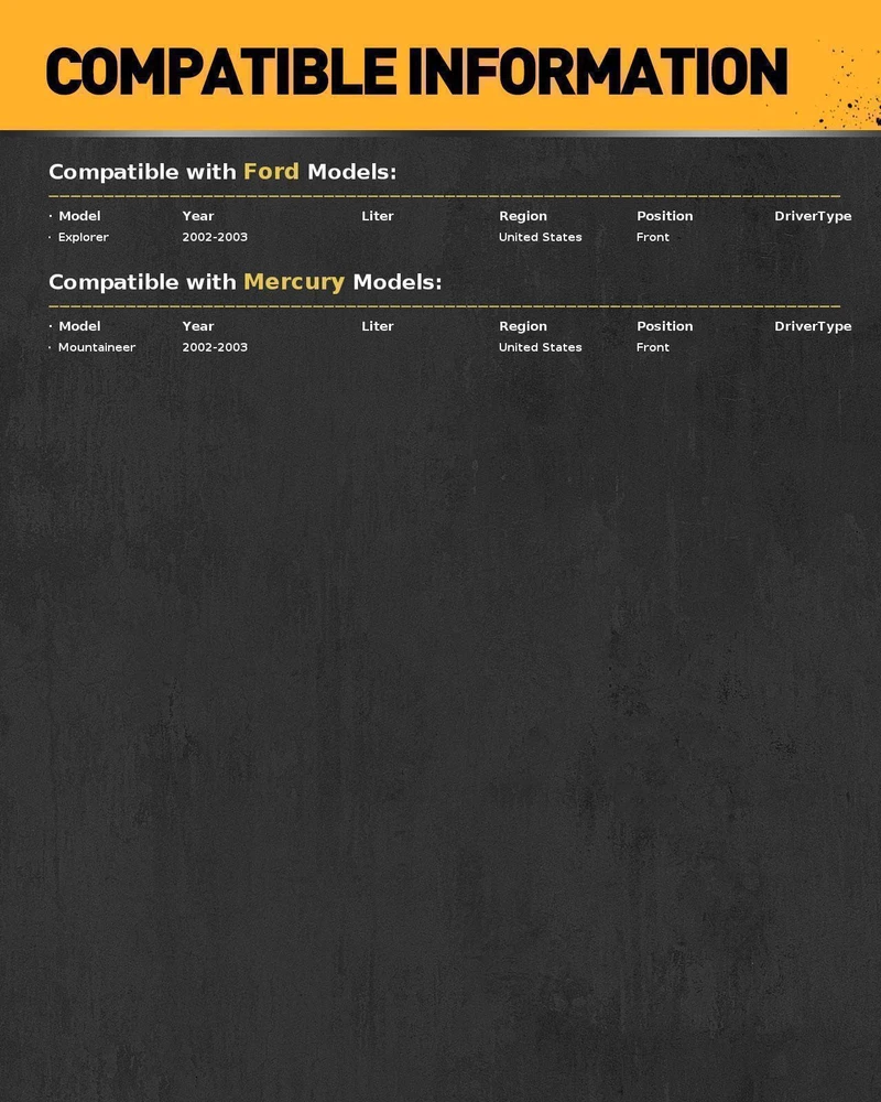 About this item Improve driving comfort: Shock absorbers can reduce the vibration and bumps of the vehicle during driving, so that passengers can feel a smoother driving experience. Increase safety: Shock absorbers can improve the stability and handling of the vehicle, reducing the risk of rollover and loss of control when the vehicle is driven at high speed or in an emergency. Extend vehicle life: Shock absorbers reduce wear and damage to vehicle components, extending the overall life of the vehicle and reducing maintenance costs. Improve fuel economy: shock absorbers can reduce the resistance of the vehicle during driving, improve fuel economy and reduce fuel costs. Customer Support : We are always developing and innovating, will continue to bring new auto parts. If this model is not suitable for your car, you can enter the our store, we have more models for you to choose! Feature: Enhanced Handing: Optimizes the response of the suspension system to road irregularities, absorbs road vibration, and maximizes the bumps and vibrations generated during driving to enhance the handing and control of the car on the road. Durable Material: Shock absorbers are made of high-quality steel and have been tested for impact wear and fatigue to provide structural integrity and durability, which can protect automobile spring parts and tires from mechanical damage caused by driving. OE Compliant: Each product is quality inspected and 100% tested, Installation is fast and direct: easy to install without special tools or skills. Enhanced Handing: Our strut assembly optimizes the response of the suspension system to road irregularities, absorbs road vibration, and maximizes the bumps and vibrations generated during driving to enhance the handing and control of the car on the road. Interchange Part Number : 171321*2 Fitment for: Make Model Year Ford Explorer 2002-2003 Mercury Mountaineer 2002-2003 Kit Includes: 2x Front Strut & Coil Spring Shock Assemblies-171321 Note: 1. The real product may differ from the pics due to the pics shown are genetic pics. 2. Shocks should always be replaced in pairs 3. Installation instruction is not included ,Professional installation is highly recommended. We are not responsible for any misuse or inappropriate installation. Time to replace your struts if you are troubled by bellow - The car makes unusual noises. - The car sink when the road is bad or load is heavy. - Oil Leakage. - Frequent and irregular tire wear. - It's hard to control the car. - Poor stability makes you feel very uncomfortable. How to Install : Step 1: Before You Lift the Vehicle, Loosen Lug Nuts One Full Turn. Step 2: Jack up Vehicle and Use Jack Stands for Safety & Remove the Tire from the Rotor. Step 3: (Wheel Alignment Is Necessary After Strut Replacement.) Marking the Position of All the Bolts Will Help Keep the Alignment Close to Original and save Time Aligning. Use a Colored Pencil to Mark the Old Strut on the Bolt. Step 4: Use Penetrating Oil (Such As Wd40) to Coat Any Rusted Fasteners, Let Soak for Approximately 1 Hour. Step 5: (Optional) While Waiting for Oil to Soak, Take This Time to Inspect All Other Components That May Need Replacement (Brake Pads, Rotors, Brake Hoses, Ball Joints, Cv Boots, Tie Rod Ends, Bushings, Sway Bars, Etc). Step 6: Remove Any Brake Line or Wire Attachments from the Strut Body. Do Not Disconnect Brake Lines (If Possible)! Opening Brake Lines Will Require Bleeding of the Brake System. Use Extreme Caution When Removing Brake Lines from Your Struts, As Any Damage to Your Brake Line Can Result in Expensive and Time Consuming Repairs. Step 7: Remove Sway bar Attached to the Strut Assembly or Control Arm. Step 8: Remove the Tie Rod (Only If It Attached to the Body of the Strut, If Not Leave It Attached to the Steering Knuckle). Step 9: Remove the Strut to Knuckle Bolts at the Bottom of the Strut. on some Vehicles, the Brake Caliper and Rotor May Need to Be Removed to Gain Access. Step 10: Remove the Upper Mounting Plate Bolts Located in the Engine or Trunk Compartment. Do Not Remove the Center Retaining Nut! It Is Not Safe to Unload the Spring from the Assembly in This Position. Step 11: Carefully Remove the Old Strut Assembly from the Vehicle. Be Very Cautious Not to Let the Strut "Drop" down on Your Brake Line, Rotor or Drum. Step 12: Install the New Complete Strut Assembly in the Reverse Order As Above (Steps 11-6). Using an Anti-seize Compound on All Fasteners Is Suggested. Step 13: Carefully Double Check Your Work and Make Sure Everything Is Tightened to Manufacturers Torque Specifications. Step 14: Replace the Tire the Rotor and Tighten to Manufacturers Torque Specifications. Step 15: Slowly Lower the Vehicle down After Removing the Jack Stands. Pay Very Close Attention to Any Odd Sounds When the Vehicle Is Lowered Onto the New Complete Strut Assemblies. Step 16: It Is Very Important That You Immediately "Road Test" Your Vehicle Right Away to Ensure That Installation Was Done Properly. Listen and Feel for Common Signs of Incorrect Installation While Driving Slowly over Speed Bumps, Rough Road or Potholes. Easy to Install Fully-assembled unit includes everything you need for strut replacement. No need for coil spring compressor and special tools. Superb Stability Each coil spring is specially designed to restore the ride height and support the weight of the vehicle, reducing body shaking and improve the handling performance. High Performance Detroit Axle parts are OE manufactured to meet expectations for fit, form, and function, offering high quality and great value.