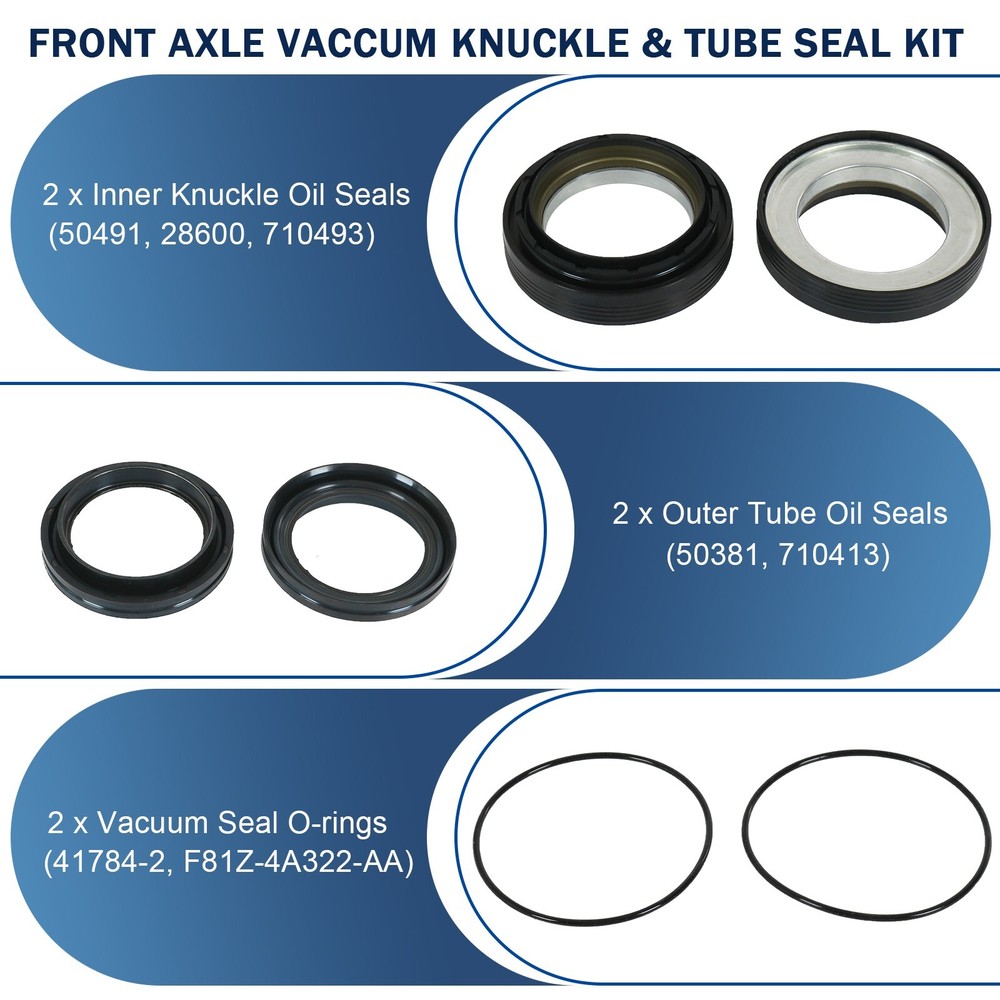 Front Axle Knuckle Vacuum & Tube Seal Kit for Ford F250/350/450 Super Duty 98-04 ★ 1 Year warranty, long durable life ★ Fast and Free Ecomomic/Standard shipping Manufacturer: JDMSPEED Application: 1998 1999 2000 2001 2002 2003 2004 Ford Super Duty Excursion F250 F350 F450 F550 Dana 50 60 Package Included: 2 Inner Knuckle Seals (Part # 50491) 2 Outer Tube Dust seals (Part # 50381) 2 O-Ring (Part # 41784-2) PS: Ship items within one working days All parts are in stock and ready to ship The part you see is the part you receive Standard size, perfect match for your vehicle All parts are fully inspected and professionally packaged We respond to any and all buyer questions or issues Shipping and Payment Return Warranty Delivery Warning Shipping and Payment We ship all the packages within 1-2 business days. Our shipment arrive your address will take around 2-10 business days. Orders placed on Saturday or Sundays should be processed and shipped on Monday. Hope you can understand. If you didn't received packages in 15 business days, please contact us freely, and we will check and solve it. Please purchase and pay for the item through eBay auction, and do not manually send us a PayPal payment. Return 60-day money back guarantee We offer a 6-month warranty for most of our products that starts on the original purchase date. If you are not satisfied with our product, most items can be returned in their new/original/unworn condition within 60 days. We will offer a refund or exchange (Shipping and handling fees are not refundable). A 15% restocking fee ($10 minimum) may be applicable. Items that have been worn, misused, abused, damaged, and/or altered beyond warranty coverage and period will not be refunded or exchanged. Warranty This item have 1-year warranty. In the event the item should fail due to manufacturing defects during intended use, we will replace the part by free. We only warranty cost of item parts. Any installation or other fees are non-refundable. Note: Any modifying the item of any kind without contacting us will void any and all warranty coverage for this item. Please contact us before modifying the part so that we have the opportunity to correct the situation. You can contact us by ebay message to get the full text of the written warranty. Delivery We ship all the packages within 1-2 business days. Arrival time for the USA buyers: about 1-6 business days. Arrival time for Canada buyers: about 3-10 business days. Please allow 3 to 6 working days to receive your item(s). International Buyers - Please Note: Import duties, taxes, and charges are not included in the item price or shipping cost. These charges are the buyer's responsibility. Please check with your country's customs office to determine what these additional costs will be prior to bidding or buying. Warning This product can expose you to chemicals including Chromium (Hexavalent Compounds), which is known to the State of California to cause cancer, and birth defects or other reproductive harm. For more information, go to California goverment website, you can search California P65Warnings. Type Axle Knuckle Vacuum Tube Seal Kit Year 1998-2004 OE/OEM Part Number 50491, 50381, 41784-2 Manufacturer Part Number 865062 Model F250 F350 F450 F550 Super Duty Make Ford Material Steel & Rubber Universal Fitment Yes Placement on Vehicle Front Brand JDMSPEED Manufacturer Warranty 1 Year Interchange Part Number 50491 50381 41784-2
