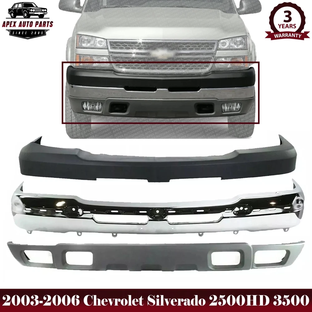 eBay Welcome to APEX AUTO PARTS Store Home About Us Feedback Add To Favorites New Arrivals Ending Soon Contact Us Front Bumper Chrome Steel + Bumper Cover & Valance With Fog Light Holes Textured For 2003-2006 Chevrolet Silverado 2500HD 3500HD Product Description WARNING : This product can expose you to chemical which is known to the State of California to cause cancer and birth defects or other reproductive harm. For more information go to www.P65Warnings.ca.gov. Specifics and Features : Quantity Sold : Set of 14 Product Fit : Direct Fit Recommended Use : OE Replacement Replaces OE Number : 15139804 19150310 10397999 Replaces Parts link Number : GM1051109 GM1002416 GM1092204 Includes : 1 x Front Bumper Chrome Steel 1 x Bumper Upper Cover Textured 1 x Lower Valance Textured Grey With Fog Light Holes Notes : Compatible with : 2003 Chevrolet Silverado 2500 HD Base 8 Cyl 6.6L 2003 Chevrolet Silverado 2500 HD Base 8 Cyl 6.0L 2003 Chevrolet Silverado 2500 HD LS 8 Cyl 6.0L 2003 Chevrolet Silverado 2500 HD Base 8 Cyl 8.1L 2003 Chevrolet Silverado 2500 HD LS 8 Cyl 8.1L 2003 Chevrolet Silverado 2500 HD LT 8 Cyl 6.0L 2003 Chevrolet Silverado 2500 HD LT 8 Cyl 8.1L 2003 Chevrolet Silverado 2500 HD LS 8 Cyl 6.6L 2003 Chevrolet Silverado 2500 HD LT 8 Cyl 6.6L 2003 Chevrolet Silverado 3500 2004 Chevrolet Silverado 2500 HD Base 8 Cyl 6.6L 2004 Chevrolet Silverado 2500 HD Base 8 Cyl 6.0L 2004 Chevrolet Silverado 2500 HD LS 8 Cyl 6.0L 2004 Chevrolet Silverado 2500 HD Base 8 Cyl 8.1L 2004 Chevrolet Silverado 2500 HD LS 8 Cyl 8.1L 2004 Chevrolet Silverado 2500 HD LT 8 Cyl 6.0L 2004 Chevrolet Silverado 2500 HD LT 8 Cyl 8.1L 2004 Chevrolet Silverado 2500 HD LS 8 Cyl 6.6L 2004 Chevrolet Silverado 2500 HD LT 8 Cyl 6.6L 2004 Chevrolet Silverado 3500 Base 8 Cyl 6.6L 2004 Chevrolet Silverado 3500 Base 8 Cyl 6.0L 2004 Chevrolet Silverado 3500 LS 8 Cyl 6.0L 2004 Chevrolet Silverado 3500 Base 8 Cyl 8.1L 2004 Chevrolet Silverado 3500 LS 8 Cyl 8.1L 2004 Chevrolet Silverado 3500 LT 8 Cyl 6.0L 2004 Chevrolet Silverado 3500 LT 8 Cyl 8.1L 2004 Chevrolet Silverado 3500 LS 8 Cyl 6.6L 2004 Chevrolet Silverado 3500 LT 8 Cyl 6.6L 2005 Chevrolet Silverado 2500 HD Base 8 Cyl 6.6L 2005 Chevrolet Silverado 2500 HD Base 8 Cyl 6.0L 2005 Chevrolet Silverado 2500 HD LS 8 Cyl 6.0L 2005 Chevrolet Silverado 2500 HD Base 8 Cyl 8.1L 2005 Chevrolet Silverado 2500 HD LS 8 Cyl 8.1L 2005 Chevrolet Silverado 2500 HD LT 8 Cyl 6.0L 2005 Chevrolet Silverado 2500 HD LT 8 Cyl 8.1L 2005 Chevrolet Silverado 2500 HD LS 8 Cyl 6.6L 2005 Chevrolet Silverado 2500 HD LT 8 Cyl 6.6L 2005 Chevrolet Silverado 3500 2006 Chevrolet Silverado 2500 HD LS 8 Cyl 6.0L 2006 Chevrolet Silverado 2500 HD LS 8 Cyl 8.1L 2006 Chevrolet Silverado 2500 HD LT 8 Cyl 6.0L 2006 Chevrolet Silverado 2500 HD LT 8 Cyl 8.1L 2006 Chevrolet Silverado 2500 HD LS 8 Cyl 6.6L 2006 Chevrolet Silverado 2500 HD LT 8 Cyl 6.6L 2006 Chevrolet Silverado 3500 LS 8 Cyl 6.0L 2006 Chevrolet Silverado 3500 LS 8 Cyl 8.1L 2006 Chevrolet Silverado 3500 LT 8 Cyl 6.0L 2006 Chevrolet Silverado 3500 LT 8 Cyl 8.1L 2006 Chevrolet Silverado 3500 LS 8 Cyl 6.6L 2006 Chevrolet Silverado 3500 LT 8 Cyl 6.6L 2007 Chevrolet Silverado 2500 HD Classic LS 8 Cyl 6.0L 2007 Chevrolet Silverado 2500 HD Classic LS 8 Cyl 8.1L 2007 Chevrolet Silverado 2500 HD Classic LT 8 Cyl 6.0L 2007 Chevrolet Silverado 2500 HD Classic LT 8 Cyl 8.1L 2007 Chevrolet Silverado 2500 HD Classic LS 8 Cyl 6.6L 2007 Chevrolet Silverado 2500 HD Classic LT 8 Cyl 6.6L 2007 Chevrolet Silverado 3500 Classic LS 8 Cyl 6.0L 2007 Chevrolet Silverado 3500 Classic LS 8 Cyl 8.1L 2007 Chevrolet Silverado 3500 Classic LT 8 Cyl 6.0L 2007 Chevrolet Silverado 3500 Classic LT 8 Cyl 8.1L 2007 Chevrolet Silverado 3500 Classic LS 8 Cyl 6.6L 2007 Chevrolet Silverado 3500 Classic LT 8 Cyl 6.6L Shipping Payment Returns Terms & Conditions Feedback Contact Us DOMESTIC LOWER 48 US STATES: FREE SALES TAX: CA ONLY VERY IMPORTANT: Double check shipping address. We are not responsible for incorrect or undeliverable addresses. Please use Shipping & Payments tab on top of page for shipping details for your location. Shipping to PR, HI, AK and PO Box addresses will be charged the same as shipping to Canada. GU, VI, SAIPAN will be charged the same as international shipping rate. For Canada shipping please select the lowest price. We do not offer expedited shipping. US Territories such as GU, VI, SAIPAN will be charged the same as CANADA shipping rate. Transaction will be held until a full shipping amount received. Some of the packages cannot be delivered to a PO Box. Customer is responsible to ensure PO Box address given is deliverable by the shipping company. Package will be held until a valid physical address is provided. Customer assumes shipping charges incurred in shipping to undeliverable address. International buyers are responsible for all customs duties, taxes, and other applicable fees incurred by the country's customs/border regulations. Please contact customs for more information. We ship 98% of all orders the same or next business day after payment received/cleared. Please understand that once orders are shipped, we cannot control the transit times thereafter. Most orders will ship via USPS First Class/Priority Mail or FedEx/UPS or the best suitable carrier for the specific size of the product. We are not responsible for any changes to address after item has been shipped. Item will be shipped out within 24-48 hours after payment cleared, except for weekends and holidays. PayPal e-check takes 3-7 business days to be processed. We will not ship until an e-check has been cleared. We do not accept returns. However, if there is an issue with your package, please contact us within 5 days of delivery. If we are not contacted within this period, we will be unable to process any claims. For emissions related items, please check with your local jurisdiction for emission specific requirements before purchasing. All items do not come with installation instruction unless otherwise specifie