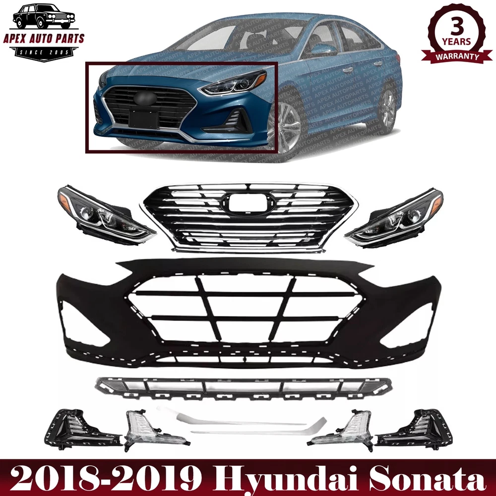 eBay Welcome to APEX AUTO PARTS Store Home About Us Feedback Add To Favorites New Arrivals Ending Soon Contact Us NEW Front Bumper Cover Primed + Front Grille Assembly Chrome Trim + Headlight Assembly Pair + Fog Light Cover Pair + Fog Light Pair + Lower Grille + Bumper Lower Molding Chrome For 2018-2019 Hyundai Sonata Product Description WARNING : This product can expose you to chemical which is known to the State of California to cause cancer and birth defects or other reproductive harm. For more information go to www.P65Warnings.ca.gov. Specifics and Features : Quantity Sold : Set of 11 Product Fit : Direct Fit Recommended Use : OE Replacement Replaces OE Number : hs1819 Replaces Parts link Number : hs1819 Includes : 1 x Front Bumper Cover Primed 1 x Front Grille Assembly Chrome Trim 1 x Front Bumper Lower Grille 1 x Front Headlight Left Driver Side 1 x Front Headlight Right Pessenger Side 1 x Front Bumper Fog Light Cover Left Driver Side 1 x Front Bumper Fog Light Cover Right Pessenger Side 1 x Front Bumper Fog Light Left Driver Side 1 x Front Bumper Fog Light Right Pessenger Side 1 x Front Bumper Lower Molding Left Driver Side 1 x Front Bumper Lower Molding Right Pessenger Side Notes : Compatible with : 2018 Sonata (submodel: Eco, GL, GLS) 2018-2019 Sonata (submodel: Limited, SE, SEL) 2019 Sonata (submodel: Essential, Luxury, Preferred) Shipping Payment Returns Terms & Conditions Feedback Contact Us DOMESTIC LOWER 48 US STATES: FREE SALES TAX: CA ONLY VERY IMPORTANT: Double check shipping address. We are not responsible for incorrect or undeliverable addresses. Please use Shipping & Payments tab on top of page for shipping details for your location. Shipping to PR, HI, AK and PO Box addresses will be charged the same as shipping to Canada. GU, VI, SAIPAN will be charged the same as international shipping rate. For Canada shipping please select the lowest price. We do not offer expedited shipping. US Territories such as GU, VI, SAIPAN will be charged the same as CANADA shipping rate. Transaction will be held until a full shipping amount received. Some of the packages cannot be delivered to a PO Box. Customer is responsible to ensure PO Box address given is deliverable by the shipping company. Package will be held until a valid physical address is provided. Customer assumes shipping charges incurred in shipping to undeliverable address. International buyers are responsible for all customs duties, taxes, and other applicable fees incurred by the country's customs/border regulations. Please contact customs for more information. We ship 98% of all orders the same or next business day after payment received/cleared. Please understand that once orders are shipped, we cannot control the transit times thereafter. Most orders will ship via USPS First Class/Priority Mail or FedEx/UPS or the best suitable carrier for the specific size of the product. We are not responsible for any changes to address after item has been shipped. Item will be shipped out within 24-48 hours after payment cleared, except for weekends and holidays. PayPal e-check takes 3-7 business days to be processed. We will not ship until an e-check has been cleared. We do not accept returns. However, if there is an issue with your package, please contact us within 5 days of delivery. If we are not contacted within this period, we will be unable to process any claims. For emissions related items, please check with your local jurisdiction for emission specific requirements before purchasing. All items do not come with installation instruction unless otherwise specified. If item is questionable, please consult your local professional/mechanic before making purchase. Shipping DOMESTIC LOWER 48 US STATES: FREE SALES TAX: CA ONLY VERY IMPORTANT: Double check shipping address. We are not responsible for incorrect or undeliverable addresses. Please use Shipping & Payments tab on top of page for shipping details for your location. Shipping to PR, HI, AK and PO Box addresses will be charged the same as shipping to Canada. GU, VI, SAIPAN will be charged the same as international shipping rate. For Canada shipping please select the lowest price. We do not offer expedited shipping. US Territories such as GU, VI, SAIPAN will be charged the same as CANADA shipping rate. Transaction will be held until a full shipping amount received. Some of the packages cannot be delivered to a PO Box. Customer is responsible to ensure PO Box address given is deliverable by the shipping company. Package will be held until a valid physical address is provided. Customer assumes shipping charges incurred in shipping to undeliverable address. International buyers are responsible for all customs duties, taxes, and other applicable fees incurred by the country's customs/border regulations. Please contact customs for more information. We ship 98% of all orders the same or next business day after payment received/cleared. Please understand that once orders are shipped, we cannot control the transit times thereafter. Most orders will ship via USPS First Class/Priority Mail or FedEx/UPS or the best suitable carrier for the specific size of the product. We are not responsible for any changes to address after item has been shipped. Payment Item will be shipped out within 24 hours after payment cleared, except for weekends and holidays. PayPal e-check takes 3-7 business days to be processed. We will not ship until an e-check has been cleared. Returns 30 Days money back, please notify us within 30 days after you've received your purchased item. All return requests must be submitted through your eBay account. You have to obtain a RMA (Return Merchandise Authorization) number from us, and have the RMA number written on the return package. Buyers pay for return shipping fee. Items to be returned must be in resalable condition. All returns are for refund ONLY. No exchange accepted. Returns for refund are subject to a 20% restocking fee. Terms & Conditions For emissions related 