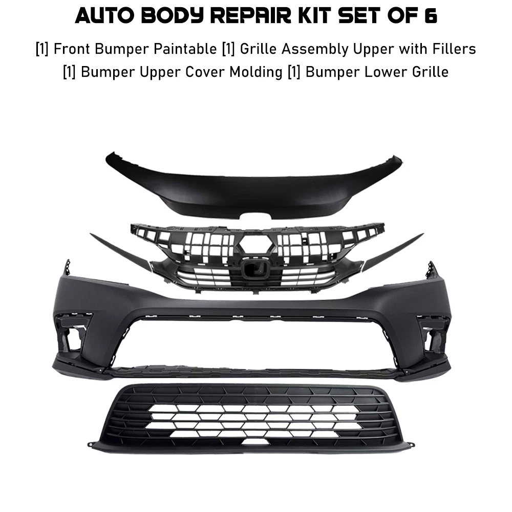 Hype_Turbo Free Shipping & Returns 3-4 days Shipping 30 Days Money Back 100% Satisfaction Front Bumper Cover Paintable & Grille Assembly Kit For 2022-2023 Honda Civic REPLACEMENT BUMPER KIT Restore the sleek, modern appearance of your 2011-2013 Hyundai Elantra with this high-quality Front Bumper Cover Fascia & Grille Assembly. Engineered to meet OEM specifications, this replacement assembly delivers an exact fit and exceptional performance. The bumper cover arrives primed and ready for paint, allowing you to match your vehicle’s color effortlessly. The included grille assembly enhances the front-end look while ensuring proper airflow to critical components. Whether you're replacing damaged parts or upgrading your car's style, this bumper and grille combo is the ideal solution. Built with durability in mind, it resists wear and tear while offering easy installation for both professionals and DIY enthusiasts. NOTES Location : Front & Lower Brand New in the Box - Fit and Quality Guaranteed! Material Plastic Anticipated Ship Out Time 1-4 business day Quantity Sold Auto Body Repair Kit Set Of 6 Product Fit Direct Fit Replaces OE Number AF501 Color/Finish Black / Primed Recommended Use OE Replacement Replaces Partslink Number AF501 Vehicle Body Type 4-Door Components [1] Front Bumper Paintable [1] Grille Assembly Upper with Fillers [1] Bumper Upper Cover Molding [1] Bumper Lower Grille Prop 65 Warning WARNING: This product can expose you to chemical which is known to the State of California to cause cancer and birth defects or other reproductive harm. For more information go to www.P65Warnings.ca.gov. Shipping Notes We have multiple warehouses in US and will choose the nearest one for shipping according to your address and our inventory. Honda : 2022 Civic EX Sedan, Canada or Japan Built Vehicle 2022 Civic EX-L Hatchback 2022 Civic LX Hatchback 2022 Civic LX Sedan 2022 Civic Sport Hatchback 2022 Civic Sport Sedan 2022 Civic Sport Touring Hatchback 2022 Civic Touring Sedan 2023 Civic (submodel: EX, EX-L, LX, Si, Sport, Sport Touring, Touring) 2011-2013 Jetta (submodel: Comfortline, Sportline) 2011-2014 Jetta (submodel: Highline, S, SE, SEL, TDI, Trendline) 2012-2014 Jetta (submodel: GLI, TDI Premium) 2013-2014 Jetta (submodel: Hybrid, Hybrid Comfortline, Hybrid Highline, Hybrid SE, Hybrid SEL, Hybrid Trendline) 2014 Jetta (submodel: Comfort, Comfort TDI, Hybrid SEL Premium)