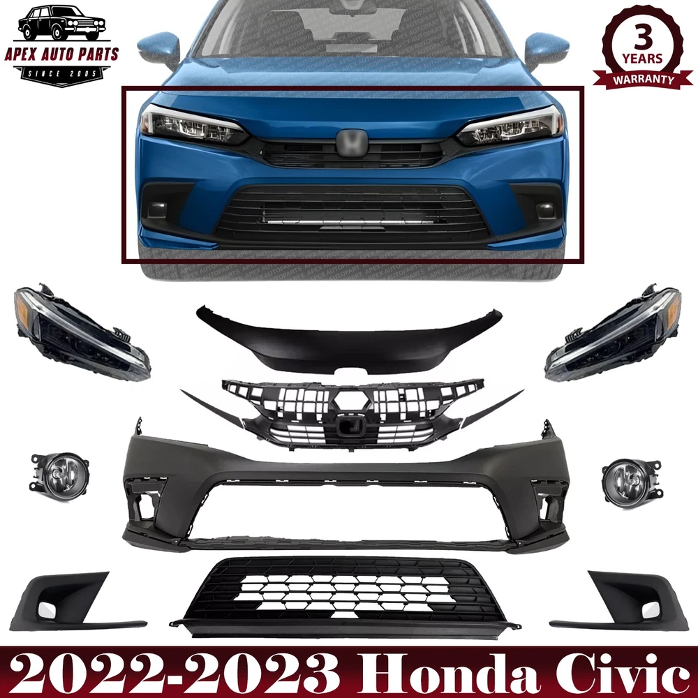 eBay Welcome to APEX AUTO PARTS Store Home About Us Feedback Add To Favorites New Arrivals Ending Soon Contact Us Front Bumper Cover Primed & Headlight Assembly Kit For 2022-2023 Honda Civic Product Description WARNING : This product can expose you to chemical which is known to the State of California to cause cancer and birth defects or other reproductive harm. For more information go to www.P65Warnings.ca.gov. Specifics and Features : Quantity Sold : Set of 10 Product Fit : Direct Fit Recommended Use : OE Replacement Replaces OE Number : HC2223 Replaces Parts link Number : HC2223 Includes : 1 x Front Bumper Cover Paintable 1 x Front Grille Assembly Upper 1 x Front Bumper Upper Cover Molding 1 x Front Bumper Lower Grille 1 x Fog Light Trims Left Driver Side 1 x Fog Light Trims Right Pessenger Side 1 x Fog Light Left Driver Side 1 x Fog Light Right Pessenger Side 1 x Front Head light Left Driver Side 1 x Front Head light Right Pessenger Side Notes : Compatible with : 2022 Civic EX Sedan, Canada or Japan Built Vehicle 2022 Civic EX-L Hatchback 2022 Civic LX Hatchback 2022 Civic LX Sedan 2022 Civic Sport Hatchback 2022 Civic Sport Sedan 2022 Civic Sport Touring Hatchback 2022 Civic Touring Sedan 2023 Civic (submodel: EX, EX-L, LX, Si, Sport, Sport Touring, Touring) Shipping Payment Returns Terms & Conditions Feedback Contact Us DOMESTIC LOWER 48 US STATES: FREE SALES TAX: CA ONLY VERY IMPORTANT: Double check shipping address. We are not responsible for incorrect or undeliverable addresses. Please use Shipping & Payments tab on top of page for shipping details for your location. Shipping to PR, HI, AK and PO Box addresses will be charged the same as shipping to Canada. GU, VI, SAIPAN will be charged the same as international shipping rate. For Canada shipping please select the lowest price. We do not offer expedited shipping. US Territories such as GU, VI, SAIPAN will be charged the same as CANADA shipping rate. Transaction will be held until a full shipping amount received. Some of the packages cannot be delivered to a PO Box. Customer is responsible to ensure PO Box address given is deliverable by the shipping company. Package will be held until a valid physical address is provided. Customer assumes shipping charges incurred in shipping to undeliverable address. International buyers are responsible for all customs duties, taxes, and other applicable fees incurred by the country's customs/border regulations. Please contact customs for more information. We ship 98% of all orders the same or next business day after payment received/cleared. Please understand that once orders are shipped, we cannot control the transit times thereafter. Most orders will ship via USPS First Class/Priority Mail or FedEx/UPS or the best suitable carrier for the specific size of the product. We are not responsible for any changes to address after item has been shipped. Item will be shipped out within 24-48 hours after payment cleared, except for weekends and holidays. PayPal e-check takes 3-7 business days to be processed. We will not ship until an e-check has been cleared. We do not accept returns. However, if there is an issue with your package, please contact us within 5 days of delivery. If we are not contacted within this period, we will be unable to process any claims. For emissions related items, please check with your local jurisdiction for emission specific requirements before purchasing. All items do not come with installation instruction unless otherwise specified. If item is questionable, please consult your local professional/mechanic before making purchase. Shipping DOMESTIC LOWER 48 US STATES: FREE SALES TAX: CA ONLY VERY IMPORTANT: Double check shipping address. We are not responsible for incorrect or undeliverable addresses. Please use Shipping & Payments tab on top of page for shipping details for your location. Shipping to PR, HI, AK and PO Box addresses will be charged the same as shipping to Canada. GU, VI, SAIPAN will be charged the same as international shipping rate. For Canada shipping please select the lowest price. We do not offer expedited shipping. US Territories such as GU, VI, SAIPAN will be charged the same as CANADA shipping rate. Transaction will be held until a full shipping amount received. Some of the packages cannot be delivered to a PO Box. Customer is responsible to ensure PO Box address given is deliverable by the shipping company. Package will be held until a valid physical address is provided. Customer assumes shipping charges incurred in shipping to undeliverable address. International buyers are responsible for all customs duties, taxes, and other applicable fees incurred by the country's customs/border regulations. Please contact customs for more information. We ship 98% of all orders the same or next business day after payment received/cleared. Please understand that once orders are shipped, we cannot control the transit times thereafter. Most orders will ship via USPS First Class/Priority Mail or FedEx/UPS or the best suitable carrier for the specific size of the product. We are not responsible for any changes to address after item has been shipped. Payment Item will be shipped out within 24 hours after payment cleared, except for weekends and holidays. PayPal e-check takes 3-7 business days to be processed. We will not ship until an e-check has been cleared. Returns 30 Days money back, please notify us within 30 days after you've received your purchased item. All return requests must be submitted through your eBay account. You have to obtain a RMA (Return Merchandise Authorization) number from us, and have the RMA number written on the return package. Buyers pay for return shipping fee. Items to be returned must be in resalable condition. All returns are for refund ONLY. No exchange accepted. Returns for refund are subject to a 20% restocking fee. Terms & Conditions For emissions related items, please check with your local jurisdiction for emission specific requirem