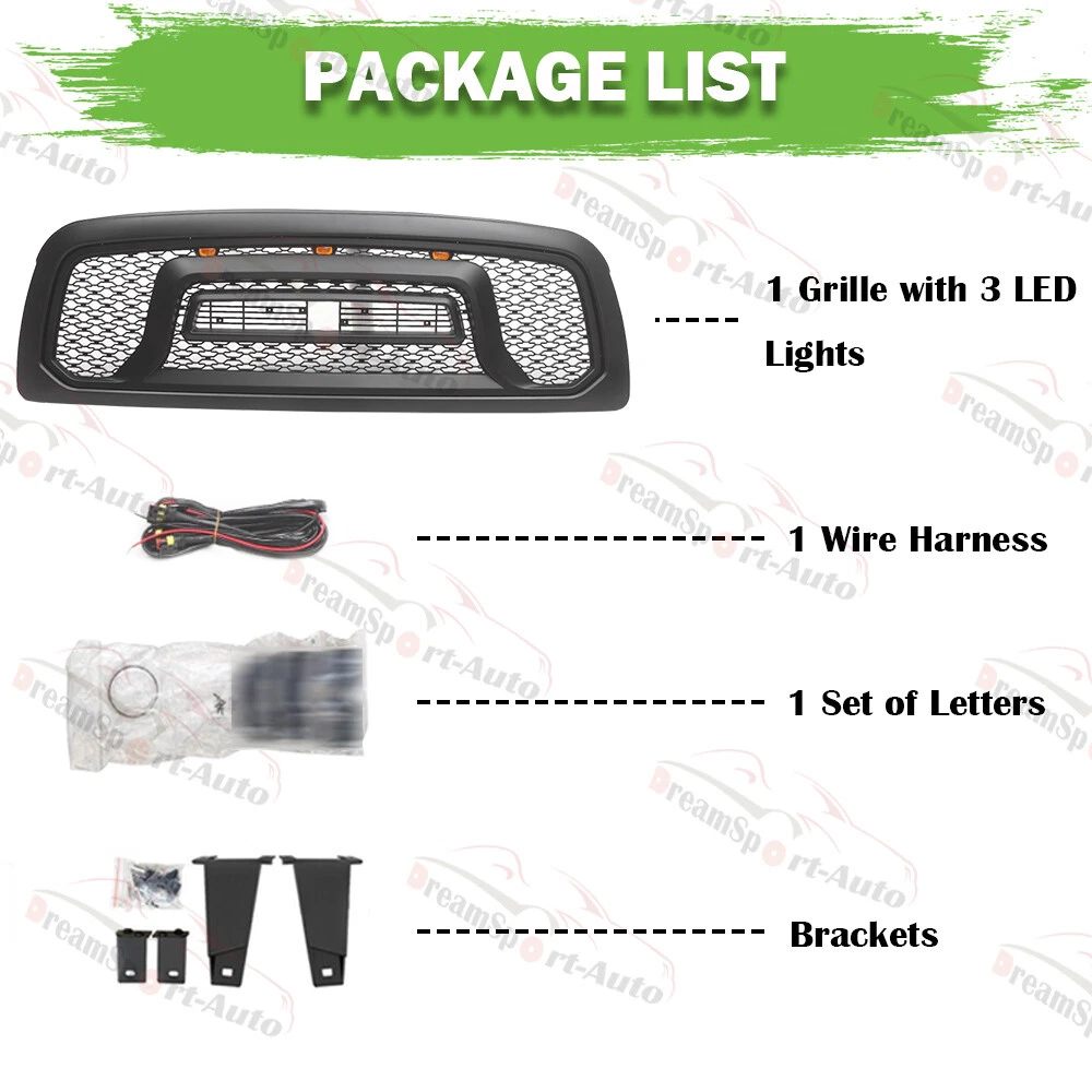 SAFE & SECURE SHOPPING 100% SATISFACTION GUARANTEED FAST SHIPPING Front Bumper Grille for 2009-2012 2011 Dodge Ram 1500 Black w/Letters LED Grill Product Description Front Bumper Grille for 2009-2012 2011 Dodge Ram 1500 Black w/Letters LED Grill (With all letters & Ships with 1 working day after payment ) Stock in US and will be shipped out in two business days(mostly in one weekday) from CA Led lights and letters include. Made of high quality ABS plastic with matte black finish. Any question,please contact with us. FEATURE This Grille not only adds great styling to the front end of your RAM, but it will also increase airflow across the radiator - when compared to the stock grille. This additional air helps to improve engine cooling, which in turn improves performance. Simple Straight Forward Installation. There is no cutting or modifications required for a clean straightforward installation. Installation can be completed in about 1 hour with just basic hand tools. FITMENT: For 2009 2010 2011 2012 Dodge Ram 1500 PACKAGE INCLUDE: 1x Grille 3X Letters R/A/M 3x Amber LED Lights 1x Wiring Harness ! Note: 1. If You Can't Make Sure It's Will Fit Or Not Please Send Us You Model Car Photos. Thanks !!! 2. Customer satisfaction is our number one priority. Please contact us to resolve any problem before leaving neutral or negative feedback. 3. Please check compatibility table, item specifics, part numbers as well as the product description to ensure this is the correct part for your vehicle. 4. Instruction not included. Professional installation is always recommended. 5. Any damaged products due to non-professional or user error may not be returned for refund. About Us Payment Shipping Returns Contact Us About Us Welcome to Dreamsport-auto ,this is a professional shop selling Auto parts, with high-quality and affordable products.You can choose the products suitable for your car, we provide you with the best price and high quality products. Thank you for your business.If you have any questions, please contact us. Please leave us with positive feedback if you are satisfied with our products and services,if not, please contact us before leave any neutral or negative feedback,we'll try our best to satisfy with you. Thanks. Payment We only accept PayPal payment. Shipping -We do not offer expedited shipping. -We only ship to the Lower 48 states, and we do not ship to FPO, APO or PO Box addresses. And we are not responsible for wrong or undeliverable address. Please provide us your full address with Telephone number and make sure your shipping address is correct and deliverable. If you need to change your address,please change it in PayPal first before you pay. -Package handling only takes 1 business day at our warehouse, so please make sure entering correct payment and shipping information before checking out. -We are not responsible for any changed of address after item has been shipped. IMPORTANT NOTICE: We ship our products via Fed EX or USPS. In some cases,your purchase will be shipped in two packages(e.g. Grille is in a package,letters,LED lights are in another packge),so please be patience if you recieve one of them first. Returns Return: We offer a 30-Day Limited Warranty. If you are not satisfied with your purchase, we are more than happy to offer an exchange or refund within 30 days. *** Received Incorrect / Damaged / Missing Item: Please take some photos of everything you have received in the package, along with a picture of the invoice and shipping label and send it to our email. We will take care of everything. Please inspect the items upon receiving any damages or missing contents. Please contact us within 7 days of delivery via email. If you change your mind / don't like it / buy it by mistake. Please repack the items carefully. Items to be returned must be in resalable condition. Returned items will be tested and if found defective / incorrect / damaged / missing parts,we will deduct the refund based on the condition of the item. The product must in brand NEW conditions and in original packaging. !!! No returns are accepted after installation/used. Installations: It is imperative that buyers understand the items are vehicle-related and require installation and vehicle knowledge. Some of our parts are direct from EUROPE or ASIA which may require modification to complete the installation. Most of the items do not have installation instructions. We highly recommend professional installation if you are not familiar with the installation. Contact Us If you have any question regarding this listing, Please send us a message. Before leaving us neutral or negative feedback, please contact us first. We will do everything we can to give you a satisfying solution. We do our best to resolve any issue. Leaving negative feedbacks and low ratings doesn't get things solved. So please talk with us and we will not let you down. Business hours: Monday to Friday (exclude Holidays) 9:00 A.M. – 6:00 P.M. Pacific Standard Time ***We do not answer any emails over the weekends and holidays. All emails will be replied in the order it was received on the following business day. Copyright © 2024 Tongtool
