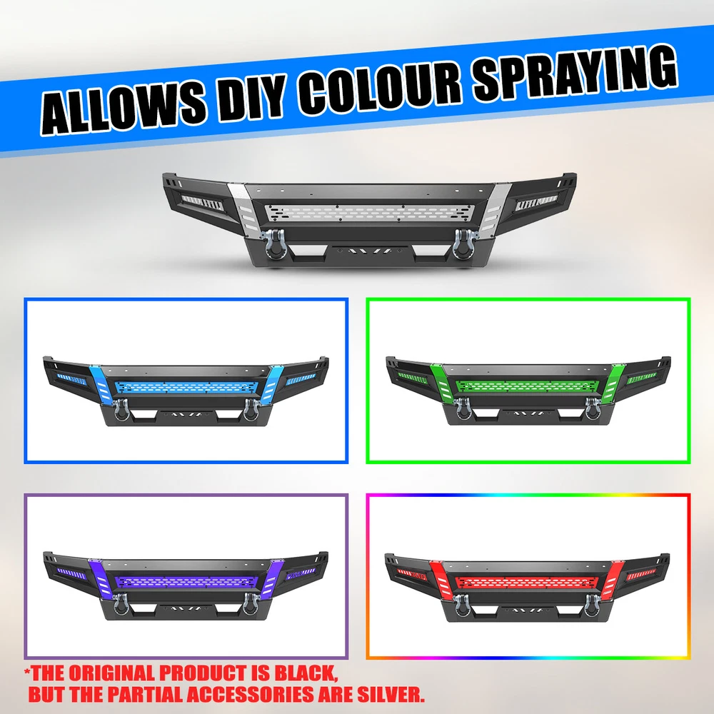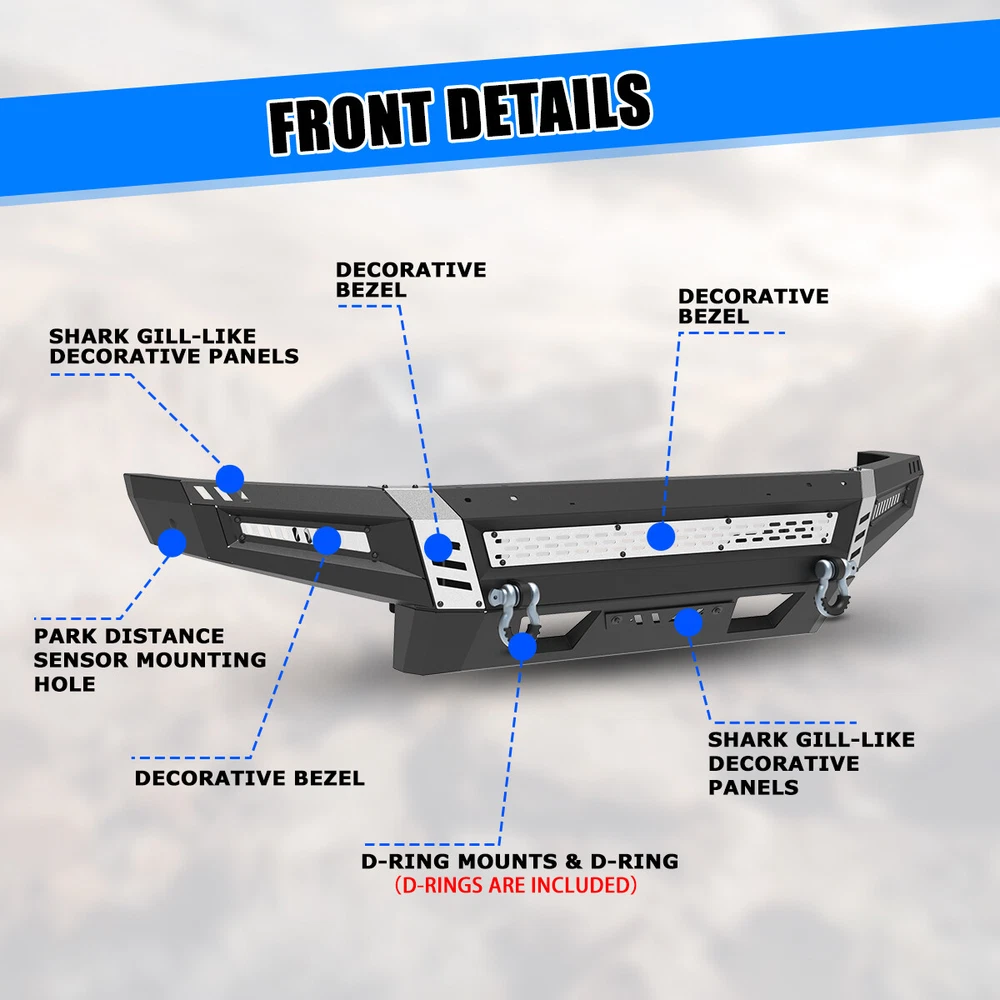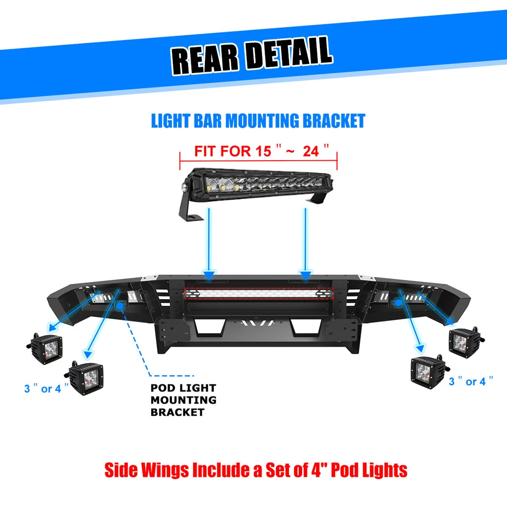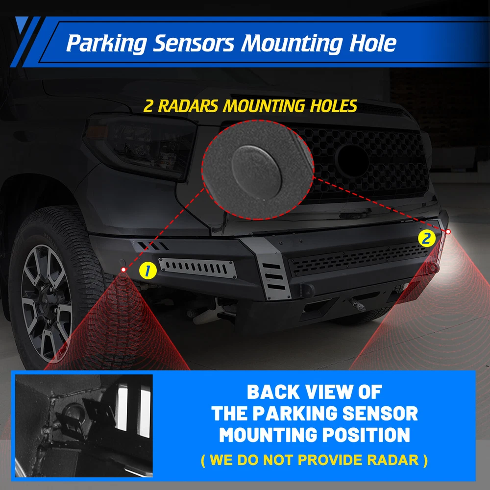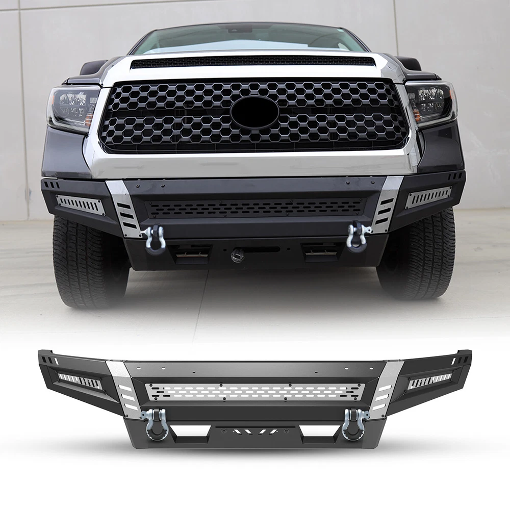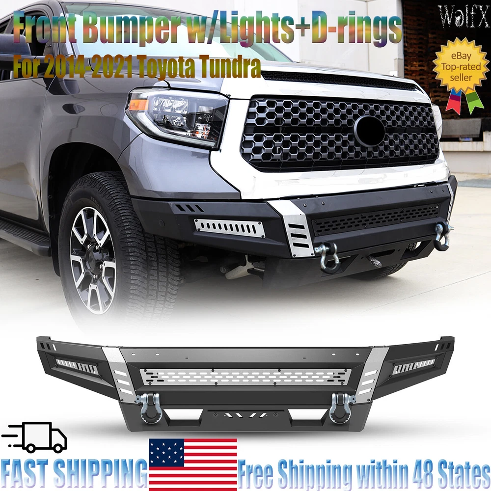 Front Bumper w/Lights+D-rings for 2014-2021 Toyota Tundra Off-Road Black Steel Fitments: For 2014-2021 Toyota Tundra Features: 【Perfect Fitment】The mid-width front bumper fits for 2014 - 2021 Toyota Tundra.The modular design of the front bumper makes installing the bumper on your car quicker and easier. 【Unique Design】The front bumper equipped with two D-rings,parking distance sensor mounting holes can work with the factory radar, (radar not included) heavy-duty D-ring shackle mounting bracket.Detachable decorative frame and honeycomb decorative net for DIY color spraying. 【Heavy Duty Steel & Long-lasting】The main body of the front bumper is made of heavy-duty high-strength steel. The front bumper also powder-coated with black textured finish and enhanced by pre-treatment to provide extreme resistance against wear. 【Easy Installation】Direct bolt-on upgrade replacement for your original stock front bumper reusing the factory mounting points. Requires no cutting, drilling or modification.The front bumper comes with mounting hardware kit. Specification: Color:Black Material: Steel Q235A Surface Finish: Black Anti Rust Powder Coated Fitment Type:Direct Replacement Placement on Vehicle: Front Mid-Width Front Bumper: 1.Allows DIY colour spraying 2.Shark Gill-like Decorative Panels 3.15-24 inches single row light bar can be installed (Not included) 4.Shackles are included 5.Product Dimensions:48.54 x 11.96 x 14.8 inch 6.Product Weight: 68 lbs Side Wings: 1.Retains OEM Parking Sensors (With dust plug when no sensors are installed) 2.Accept 3" or 4" Pod Light on Each Side (Includes a set of 4" Pod Lights ) 3.Product Dimensions: 25.43 x 10.63 x 8.89 inch 4.Product Weight: 24.25lbs Package included: 1 x Front Bumper 2 x Side Wings 2 x D-Rings Shackles 2 x 4" LED Pod Lights 1 x Set of All Mounting Hardwares Payment Delivery details Terms of sales About us Contact us Payment 👉 We accept PayPal (Recommended), credit card, VISA, Google Pay & Discover etc. 👉 Please submit your payment within 7 days after your purchase. 👉 If not, eBay will automatically open an Unpaid Item Dispute on our behalf if the item(s) are not paid within 7 days. Delivery details 👉 Please double check your delivery address and contact information. 👉 All items will be shipped within 1 business days after payment received. 👉 Tracking numbers will be easily accessible ASAP they are created and processed. Terms of sales 👉 Free 30 days Return, we will cover the return post fee. 👉 If a defective product was received, please do not hesitate to message us via eBay message. 👉 We will response in 24 hours in business to resolve the problem 👉 We stand behind our products. Items can be returned for exchange or full refund within 30 days from the date you receive. About us 👉 Wolfstorm has a huge warehouse and office located in the United States. 👉 All US domestic 48 states customers are able to benefit from the FREE SHIPPING services. 👉 Our experienced, professional customer service representatives offers prompt and courteous service. 👉 Best quality products, outstanding services and professional experience keep our customers. Contact us 👉 Please feel free to contact us if you have any problems. 👉 Emails will be replied within 24 hours in working days. 👉 After hours emails will be replied on the next business day. On Dec 3, 2024 at 01:25:42 PST, seller added the following information: