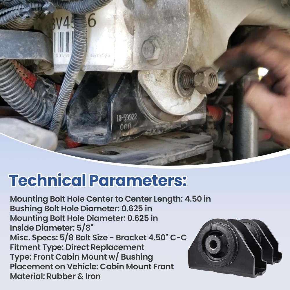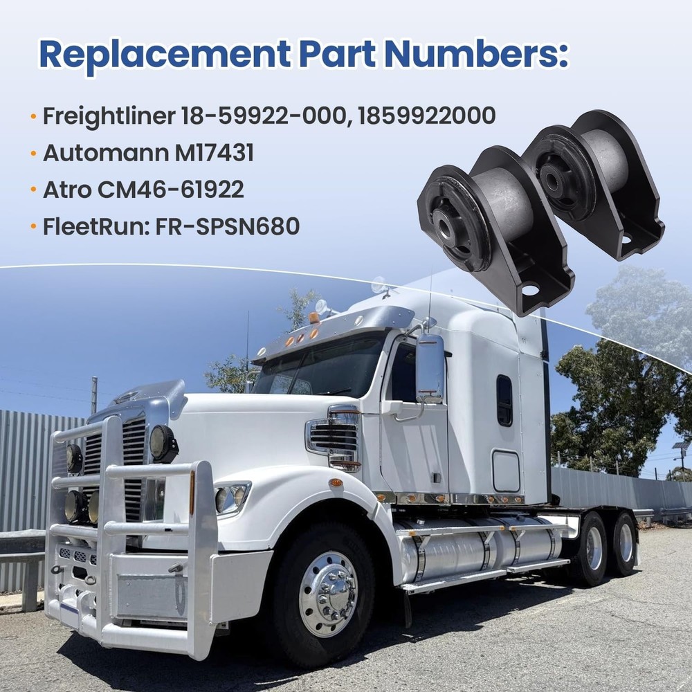 Front Cab Mount w/ Bushing Replaces 18-59922-000 For Freightliner 2008-2016 2017 Specification Type: Cabin Mount w/ Bushing Placement on Vehicle: Front Material: Rubber & Iron Color: Black Fitment Type: Performance / Custom Part Number 18-59922-000, 1859922000 59922, CM46-61922, M17431 Fitment For Freightliner Cascadia 2008-2017 (PX-125) For Freightliner Columbia 2008-2017 (CL-120) For Freightliner Coronado 2008-2017 (CORO-132) Package Included 1x Front Cabin Mount w/ Bushing Shipping Policy Payment Method Order Cancel & Returns Policy Contact us About Us Shipping Policy Delivery details -Handling time:We will prepare your order within 1-3 Business Day -Delivery Time: Normally it takes about 8-16 working days to deliver to your addresss. -Note: 1. Please ensure that the shipping address( English Address and Name) and the postcode you provide at checkout and PayPal is accurate. We are not responsible for undeliverable addresses. 2. The delivery time is for reference only.It will be influenced by the flight, holiday, weather, local post or custom passing .But normally we deliver it faster than expected. Payment Method Most of the payment methods are available, Such as Paypal, Payoneer, Credit Card. Within 1 business day of receiving your payment, we will begin processing your order. Order Cancel & Returns Policy -About Order Cancel: Pls inform us if you need to cancel the order within 24 hours. If orders are more than 24 hours and we have already sent the items, it will be difficult for us to cancel the order. So pls contact us in time, thank you for your understanding! -About Order Returns & Exchange: if you receive wrong or defective parts, pls contact us before you take any other actions, We will solve the problems for you and give you a satisfied reply asap. Contact us If you are unsure or have questions regarding the correct part for your car, pls message or email us and we would be more than happy to assist you. To ensure a fast and accurate response pls include your vehicle's year, make, model, and engine size. We will reply all messages within 24 hours. Business Day: From Monday to Saturday, 9:00 am to 6:00 pm (Beijing Time). Our goal is to make sure you are a happy buyer and have a pleasant shopping with us. When you bought our product, if anything unusual happens: Not received the items, or inconsistent with the description, or other reasons make you not satisfied. Please do not leave neutral (or negative) feedback or open case easily, please feel free to write to contact me. We will do our best service to solve your problem!If you contact us via eBay, we will be more than happy to work with you! About Us We have our business in China, since then we have been serving the auto market with a wide range of automotive products and accessories. We are able to provide customers with the most competitive price due to direct dealing with manufacturers; eliminating the middle person. We are mainly offering car switches which are produced by ourselves, we also offer a lot of auto parts such as sensors, door handles, idel valves, seat heaters which we get from our cooperated factories. On Jan 13, 2026 at 03:33:50 PST, seller added the following information: