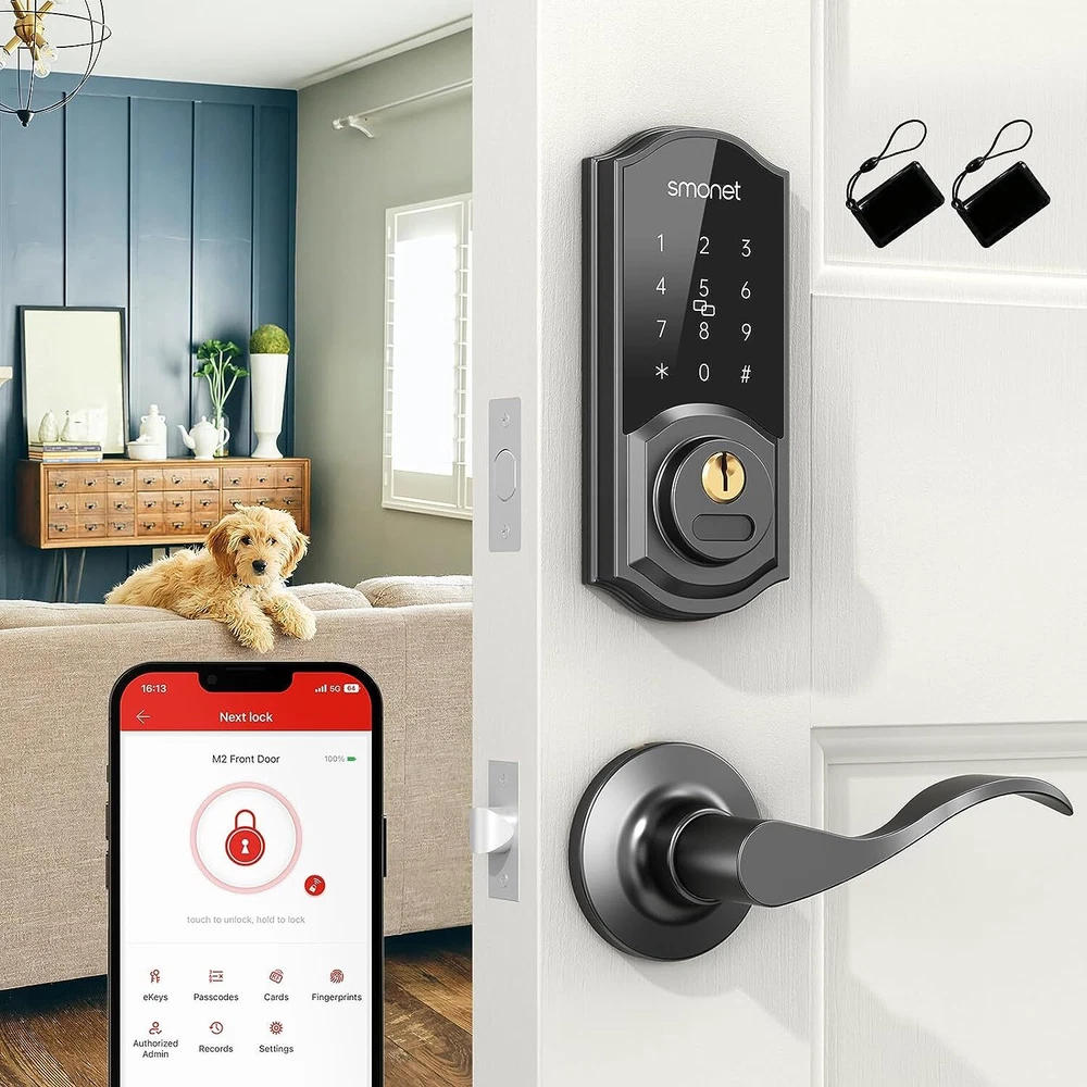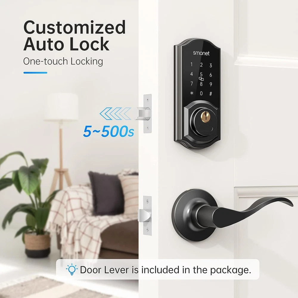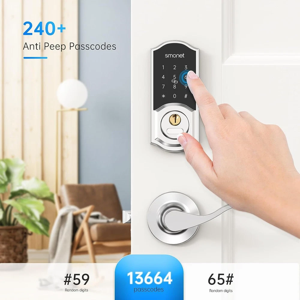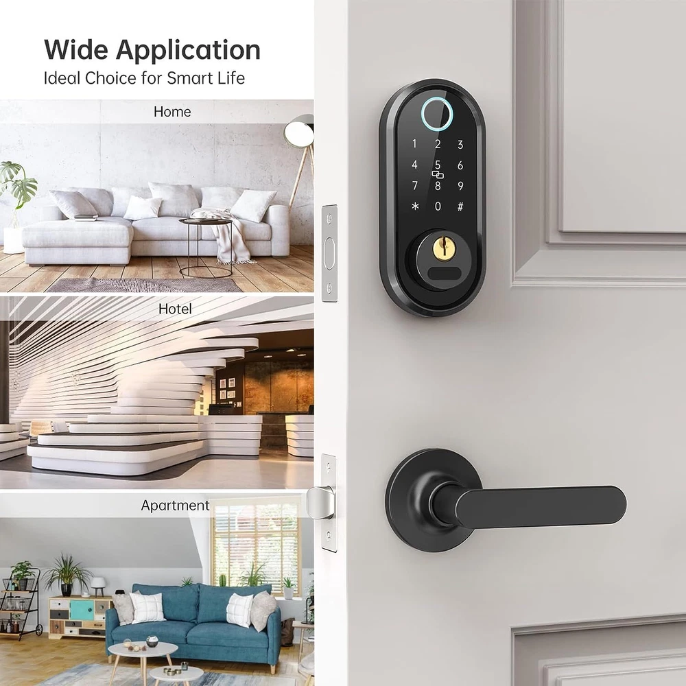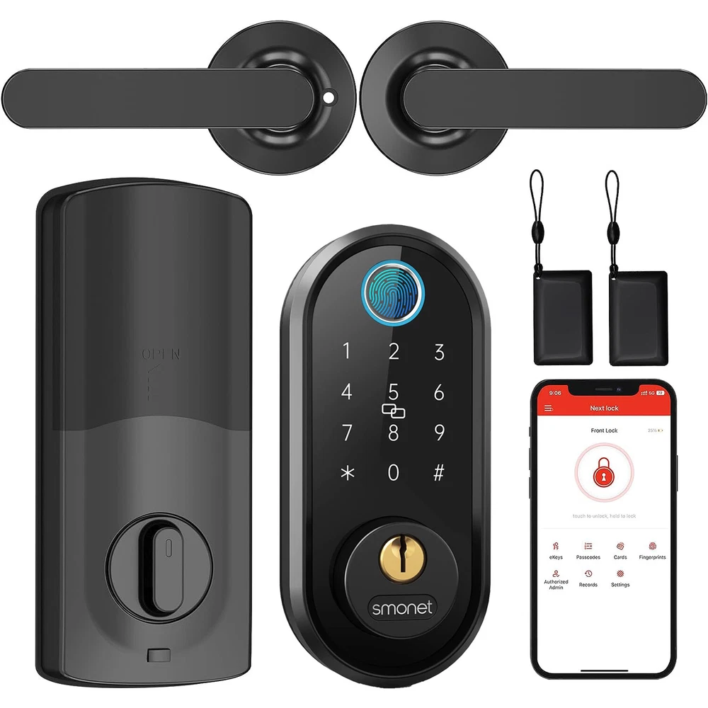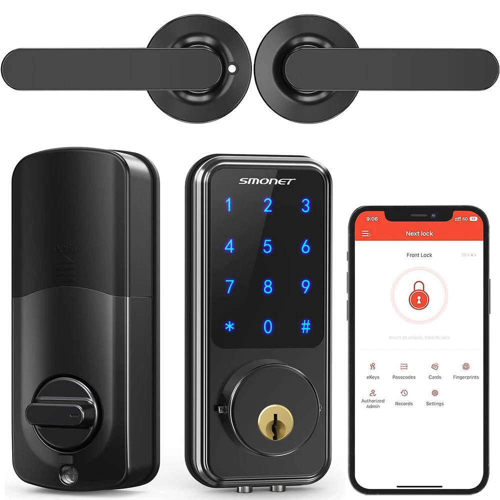 Options with "NO FP " means this model has NO fingerprint function, please kindly notice it About this item: 【 Keyless E ntry 】Front door handle set with 150 password code + 2 spare keys + 3 fobs + 250 fingerprints and bluetooth smartphone control, experience a revolutionary biometric technology with touch and go 360° fingerprint ID. Smart deadbolt supports working with Alexa & Google Home Assistant and remote controlling with your lock if paired with G2 Gateway (Optional, sold separately). 【 Automatic L ock 】With anti peeping function when entering passwords, set up auto lock function for the fingerprint door lock in 1-900 seconds, or long press '#' for manually locking. One-time password for temporary visitors, ekey or permanent code to your family, make it more flexible for children, guests, service people or others who wants to entry. 【 Keypad Door Lock with Hand le 】A digital deadbolt combined with 2 mating lever handles, built-in backlight. Solid alloy body and long battery life, 4pcs AA batteries providing 10,000 openings(approx. 12 months). Adding an equal touch of elegance to both traditional and modern homes, perfect for your smart home. 【 Easy to Ins tall 】Follow the steps and tips showing in the video, replace an existing deadbolt door lock in minutes with just a phillips screwdriver. Compatible with standard wooden, left and right handed doors, great solution for Airbnb rental apartment. Kindly noted that L/R side doors have different install method. 【 Professional Customer Su pport 】We provides at least 1 year warranty and free life-time technical support available to smart lock deadbolt. Any questions(such as installation or App problems or more information about G2 gateway) please feel free to reach out to us. Specifications: Brand: SMONET Model: A1 / M1 / Y1 Color: Black / Silver Material: Alloy Shape: Camelot / Rectangle / Oval Style: Modern Door Direction: Universal / Reversible (Both left & right, inswing & outswing) Connectivity Protocol: Bluetooth Ways to Unlock: Fingerprint / Keypad Passcode / Key Fobs / Physical Keys Control Method: App Phone APP: TT Lock / Next Lock (Totally FREE) Remotely / Voice Control: Alexa or Google Home (WiFi Gateway Needed) Lock Type: Keypad Finish: Painted Controller Type: Hand Control Control Method: Touch Power Supply: 4x AA Battery (NOT Included) IP Rating: IP63 What's in the box: 1x Front Door Lock Keypad 1x Rear Door Lock Panel 2x Knob or Lever Handle (Depends on your choice) 1x Latch 2x Key Fobs (IC Cards) 3x Physical Keys 1x Strike Pad 1x Strike Plate 1x Battery Cover 1x Drilling Template 1x Installation Screws Pack 1x User Manual Auto Lock Experience the convenience and peace of mind with smart deadbolt lock's automatic locking feature. Fingerprint Recognition Advanced fingerprint recognition technology enables the storage of up to 250 sets of fingerprints. Remote Share You have the ability to generate and share a one-time password remotely for guest. Easy to Install No extra drilling required. Can be completely installed by one person with just a Phillips screwdriver Voice Control Embrace the power of voice: Control your lock with effortless ease! (G2 Gateway Required) Widely compatibility to all kinds of weather SMONET Pro keyless entry door lock with handle provides IP63 waterproof and works from -4 °F to 158 °F temperatures. Smooth and stable in all kinds of weather, safeguard your home as always. Long battery life, Type C backup Intuitive touchscreen display, long battery life, up to 12 months of battery life. SMONET Pro front door lock with low battery alert and type C emergency backup, free you from battery worries.