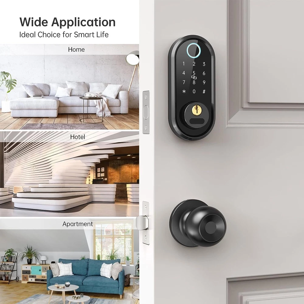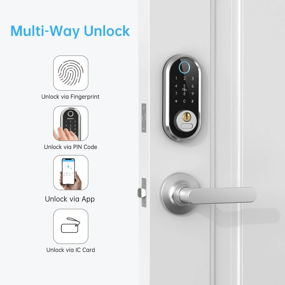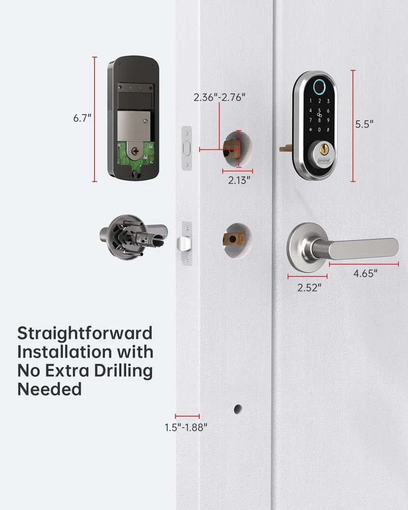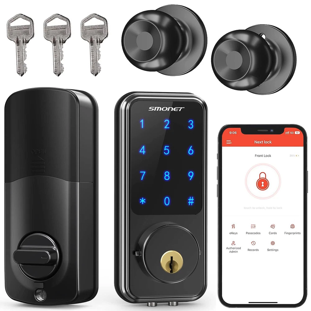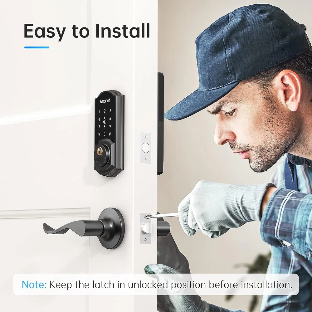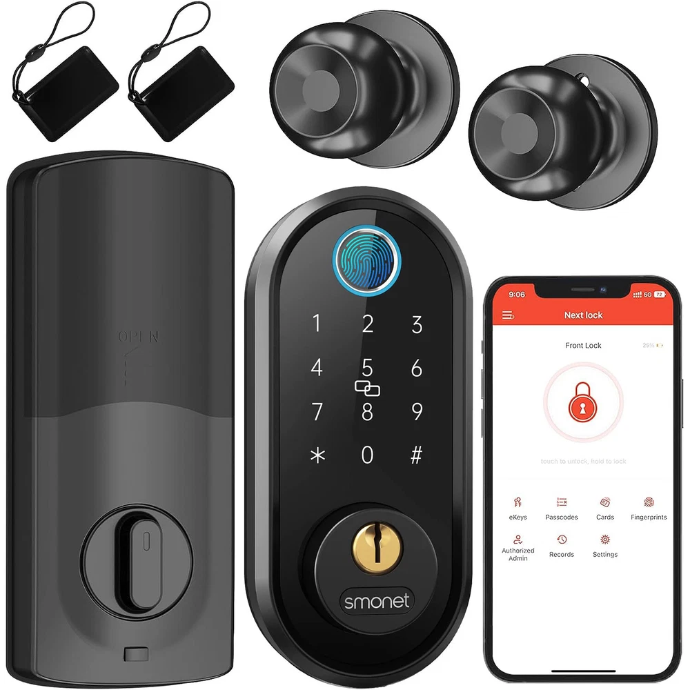 Options with "NO FP " means this model has NO fingerprint function, please kindly notice it About this item: 【 Keyless E ntry 】Front door handle set with 150 password code + 2 spare keys + 3 fobs + 250 fingerprints and bluetooth smartphone control, experience a revolutionary biometric technology with touch and go 360° fingerprint ID. Smart deadbolt supports working with Alexa & Google Home Assistant and remote controlling with your lock if paired with G2 Gateway (Optional, sold separately). 【 Automatic L ock 】With anti peeping function when entering passwords, set up auto lock function for the fingerprint door lock in 1-900 seconds, or long press '#' for manually locking. One-time password for temporary visitors, ekey or permanent code to your family, make it more flexible for children, guests, service people or others who wants to entry. 【 Keypad Door Lock with Hand le 】A digital deadbolt combined with 2 mating lever handles, built-in backlight. Solid alloy body and long battery life, 4pcs AA batteries providing 10,000 openings(approx. 12 months). Adding an equal touch of elegance to both traditional and modern homes, perfect for your smart home. 【 Easy to Ins tall 】Follow the steps and tips showing in the video, replace an existing deadbolt door lock in minutes with just a phillips screwdriver. Compatible with standard wooden, left and right handed doors, great solution for Airbnb rental apartment. Kindly noted that L/R side doors have different install method. 【 Professional Customer Su pport 】We provides at least 1 year warranty and free life-time technical support available to smart lock deadbolt. Any questions(such as installation or App problems or more information about G2 gateway) please feel free to reach out to us. Specifications: Brand: SMONET Model: A1 / M1 / Y1 Color: Black / Silver Material: Alloy Shape: Camelot / Rectangle / Oval Style: Modern Door Direction: Universal / Reversible (Both left & right, inswing & outswing) Connectivity Protocol: Bluetooth Ways to Unlock: Fingerprint / Keypad Passcode / Key Fobs / Physical Keys Control Method: App Phone APP: TT Lock / Next Lock (Totally FREE) Remotely / Voice Control: Alexa or Google Home (WiFi Gateway Needed) Lock Type: Keypad Finish: Painted Controller Type: Hand Control Control Method: Touch Power Supply: 4x AA Battery (NOT Included) IP Rating: IP63 What's in the box: 1x Front Door Lock Keypad 1x Rear Door Lock Panel 2x Knob or Lever Handle (Depends on your choice) 1x Latch 2x Key Fobs (IC Cards) 3x Physical Keys 1x Strike Pad 1x Strike Plate 1x Battery Cover 1x Drilling Template 1x Installation Screws Pack 1x User Manual Auto Lock Experience the convenience and peace of mind with smart deadbolt lock's automatic locking feature. Fingerprint Recognition Advanced fingerprint recognition technology enables the storage of up to 250 sets of fingerprints. Remote Share You have the ability to generate and share a one-time password remotely for guest. Easy to Install No extra drilling required. Can be completely installed by one person with just a Phillips screwdriver Voice Control Embrace the power of voice: Control your lock with effortless ease! (G2 Gateway Required) Widely compatibility to all kinds of weather SMONET Pro keyless entry door lock with handle provides IP63 waterproof and works from -4 °F to 158 °F temperatures. Smooth and stable in all kinds of weather, safeguard your home as always. Long battery life, Type C backup Intuitive touchscreen display, long battery life, up to 12 months of battery life. SMONET Pro front door lock with low battery alert and type C emergency backup, free you from battery worries.