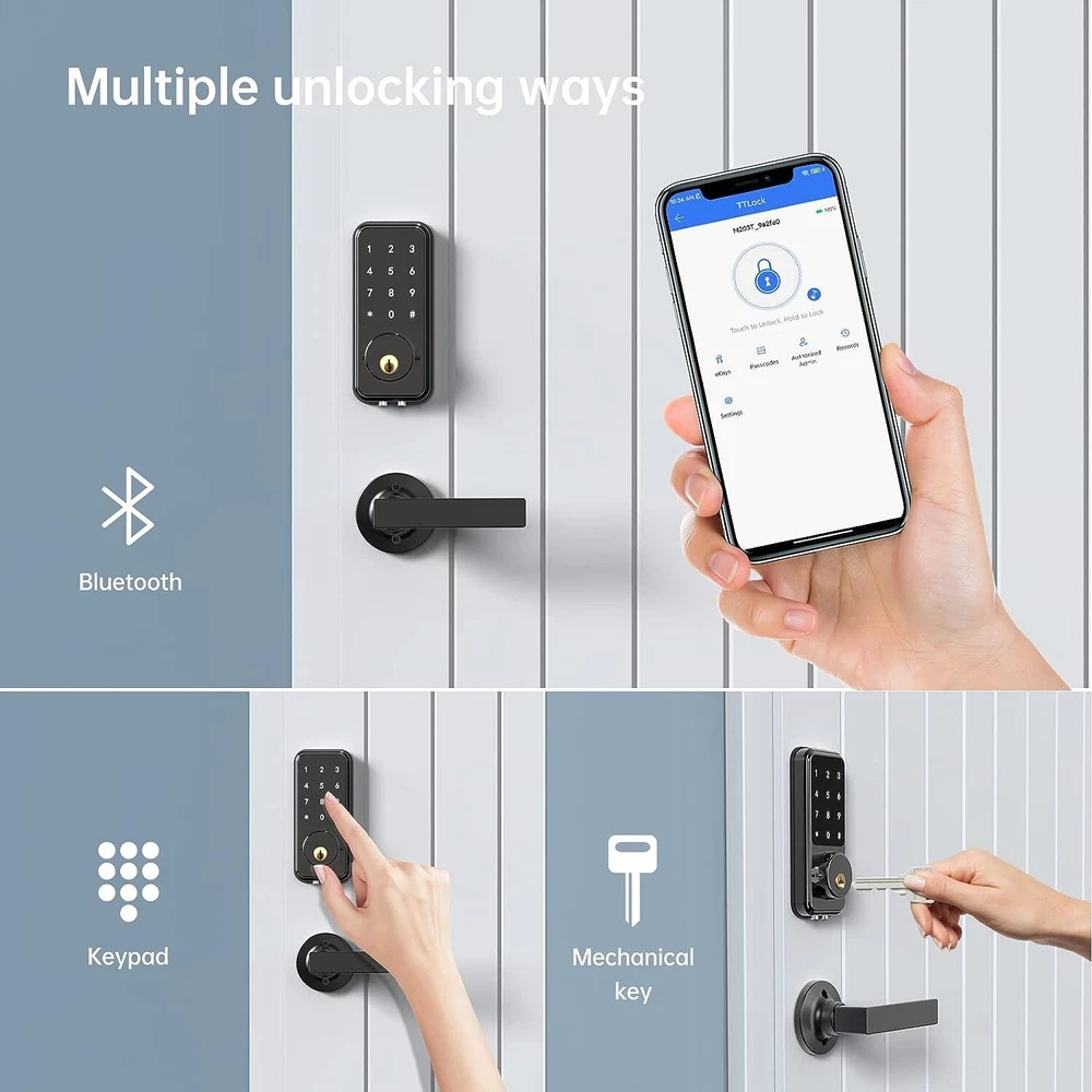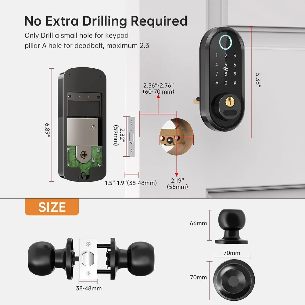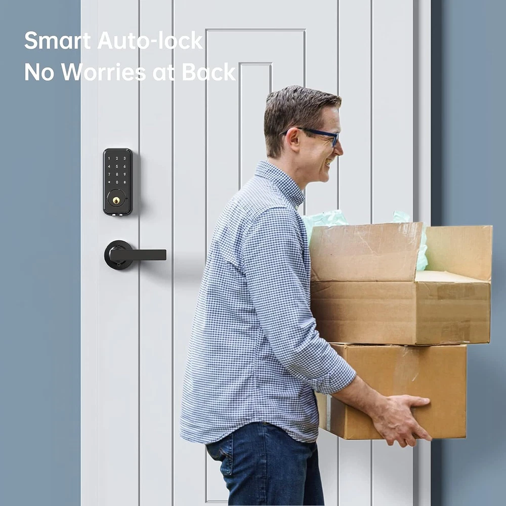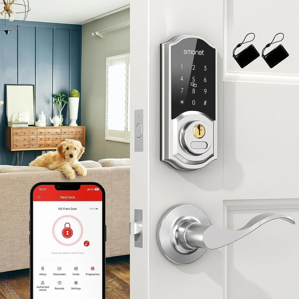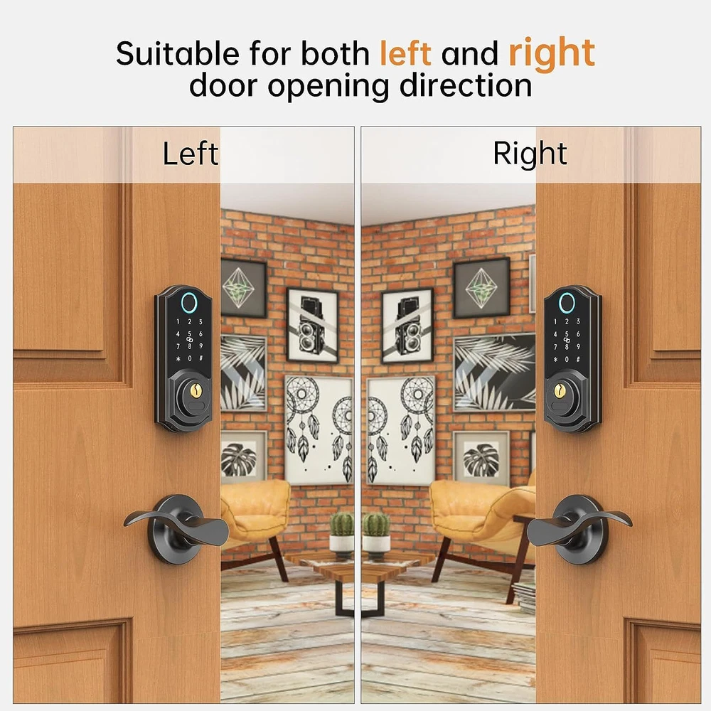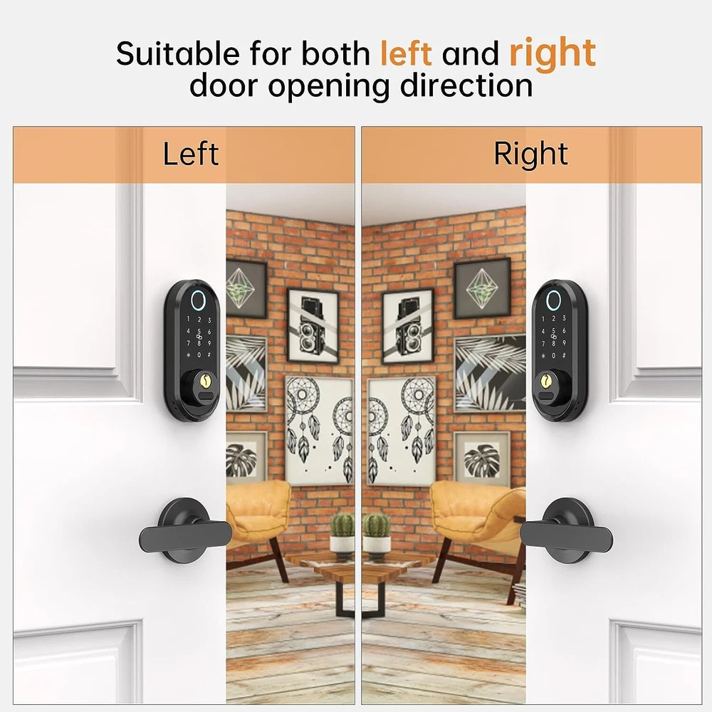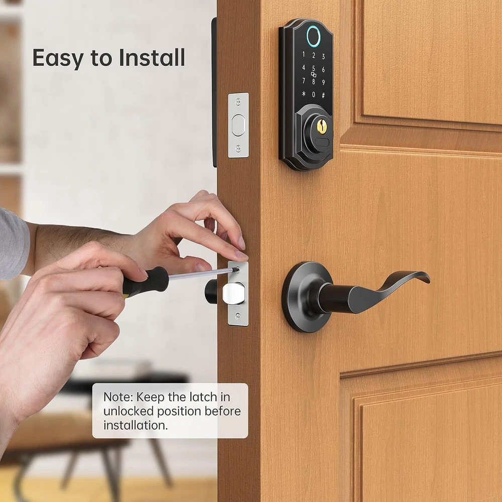 Options with "NO FP " means this model has NO fingerprint function, please kindly notice it About this item: 【 Keyless E ntry 】Front door handle set with 150 password code + 2 spare keys + 3 fobs + 250 fingerprints and bluetooth smartphone control, experience a revolutionary biometric technology with touch and go 360° fingerprint ID. Smart deadbolt supports working with Alexa & Google Home Assistant and remote controlling with your lock if paired with G2 Gateway (Optional, sold separately). 【 Automatic L ock 】With anti peeping function when entering passwords, set up auto lock function for the fingerprint door lock in 1-900 seconds, or long press '#' for manually locking. One-time password for temporary visitors, ekey or permanent code to your family, make it more flexible for children, guests, service people or others who wants to entry. 【 Keypad Door Lock with Hand le 】A digital deadbolt combined with 2 mating lever handles, built-in backlight. Solid alloy body and long battery life, 4pcs AA batteries providing 10,000 openings(approx. 12 months). Adding an equal touch of elegance to both traditional and modern homes, perfect for your smart home. 【 Easy to Ins tall 】Follow the steps and tips showing in the video, replace an existing deadbolt door lock in minutes with just a phillips screwdriver. Compatible with standard wooden, left and right handed doors, great solution for Airbnb rental apartment. Kindly noted that L/R side doors have different install method. 【 Professional Customer Su pport 】We provides at least 1 year warranty and free life-time technical support available to smart lock deadbolt. Any questions(such as installation or App problems or more information about G2 gateway) please feel free to reach out to us. Specifications: Brand: SMONET Model: A1 / M1 / Y1 Color: Black / Silver Material: Alloy Shape: Camelot / Rectangle / Oval Style: Modern Door Direction: Universal / Reversible (Both left & right, inswing & outswing) Connectivity Protocol: Bluetooth Ways to Unlock: Fingerprint / Keypad Passcode / Key Fobs / Physical Keys Control Method: App Phone APP: TT Lock / Next Lock (Totally FREE) Remotely / Voice Control: Alexa or Google Home (WiFi Gateway Needed) Lock Type: Keypad Finish: Painted Controller Type: Hand Control Control Method: Touch Power Supply: 4x AA Battery (NOT Included) IP Rating: IP63 What's in the box: 1x Front Door Lock Keypad 1x Rear Door Lock Panel 2x Knob or Lever Handle (Depends on your choice) 1x Latch 2x Key Fobs (IC Cards) 3x Physical Keys 1x Strike Pad 1x Strike Plate 1x Battery Cover 1x Drilling Template 1x Installation Screws Pack 1x User Manual Auto Lock Experience the convenience and peace of mind with smart deadbolt lock's automatic locking feature. Fingerprint Recognition Advanced fingerprint recognition technology enables the storage of up to 250 sets of fingerprints. Remote Share You have the ability to generate and share a one-time password remotely for guest. Easy to Install No extra drilling required. Can be completely installed by one person with just a Phillips screwdriver Voice Control Embrace the power of voice: Control your lock with effortless ease! (G2 Gateway Required) Widely compatibility to all kinds of weather SMONET Pro keyless entry door lock with handle provides IP63 waterproof and works from -4 °F to 158 °F temperatures. Smooth and stable in all kinds of weather, safeguard your home as always. Long battery life, Type C backup Intuitive touchscreen display, long battery life, up to 12 months of battery life. SMONET Pro front door lock with low battery alert and type C emergency backup, free you from battery worries.