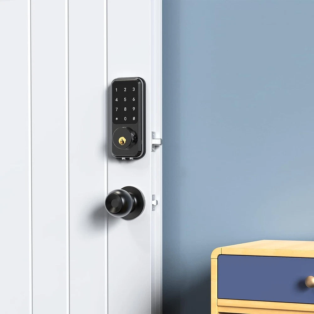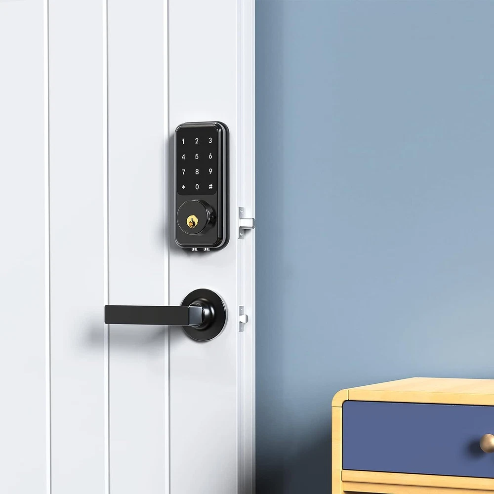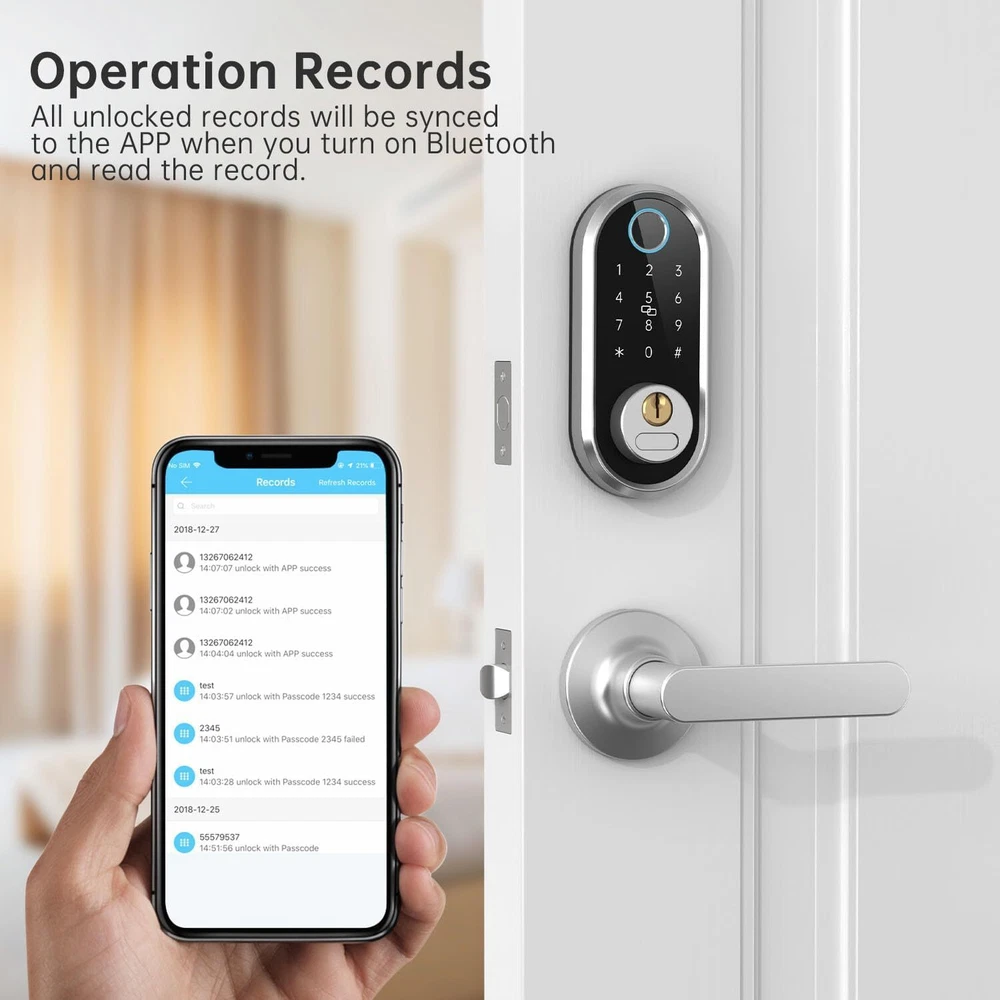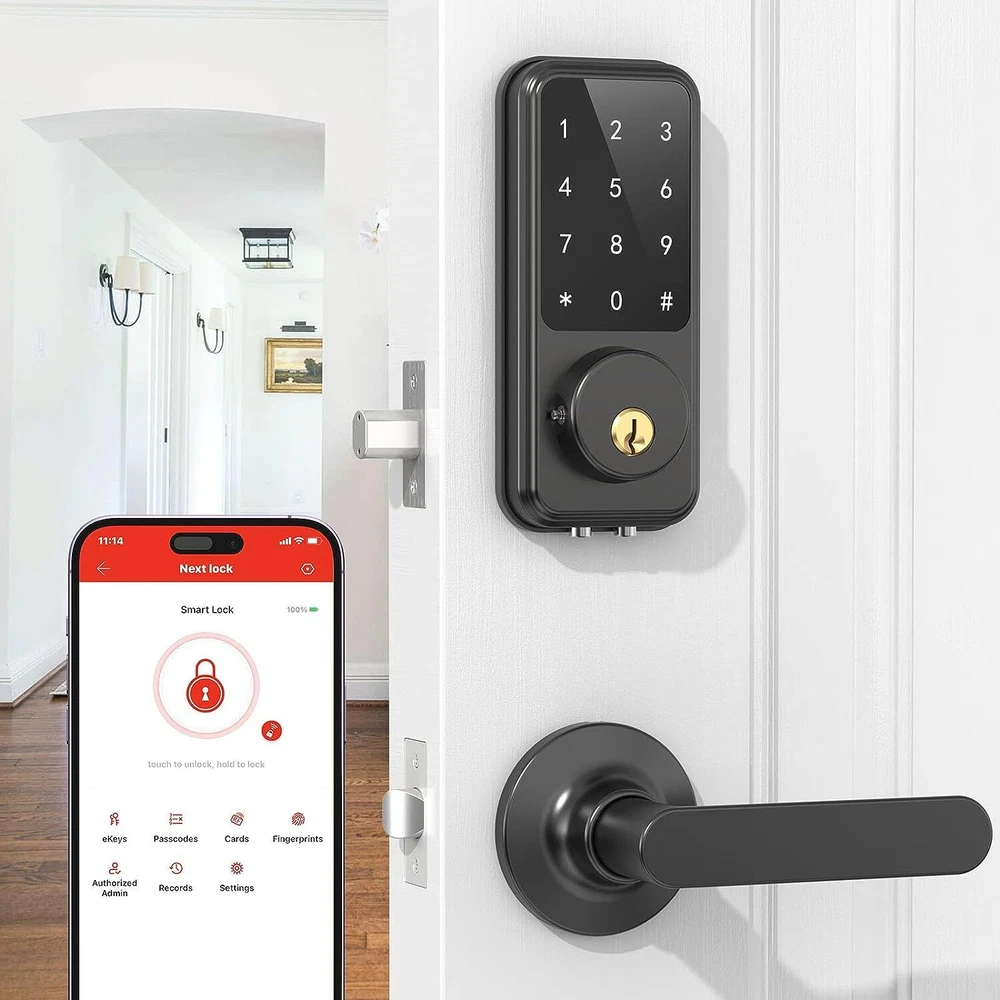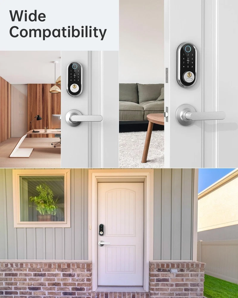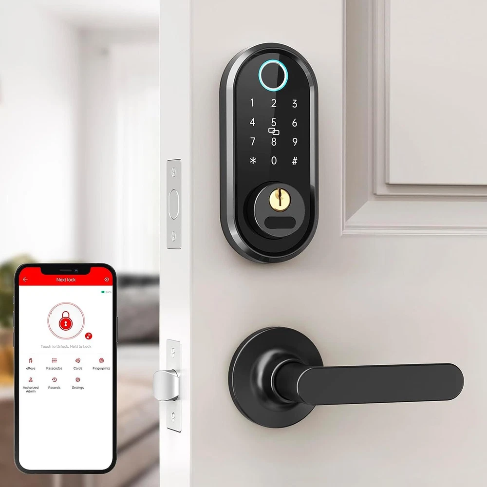 Options with "NO FP " means this model has NO fingerprint function, please kindly notice it About this item: 【 Keyless E ntry 】Front door handle set with 150 password code + 2 spare keys + 3 fobs + 250 fingerprints and bluetooth smartphone control, experience a revolutionary biometric technology with touch and go 360° fingerprint ID. Smart deadbolt supports working with Alexa & Google Home Assistant and remote controlling with your lock if paired with G2 Gateway (Optional, sold separately). 【 Automatic L ock 】With anti peeping function when entering passwords, set up auto lock function for the fingerprint door lock in 1-900 seconds, or long press '#' for manually locking. One-time password for temporary visitors, ekey or permanent code to your family, make it more flexible for children, guests, service people or others who wants to entry. 【 Keypad Door Lock with Hand le 】A digital deadbolt combined with 2 mating lever handles, built-in backlight. Solid alloy body and long battery life, 4pcs AA batteries providing 10,000 openings(approx. 12 months). Adding an equal touch of elegance to both traditional and modern homes, perfect for your smart home. 【 Easy to Ins tall 】Follow the steps and tips showing in the video, replace an existing deadbolt door lock in minutes with just a phillips screwdriver. Compatible with standard wooden, left and right handed doors, great solution for Airbnb rental apartment. Kindly noted that L/R side doors have different install method. 【 Professional Customer Su pport 】We provides at least 1 year warranty and free life-time technical support available to smart lock deadbolt. Any questions(such as installation or App problems or more information about G2 gateway) please feel free to reach out to us. Specifications: Brand: SMONET Model: A1 / M1 / Y1 Color: Black / Silver Material: Alloy Shape: Camelot / Rectangle / Oval Style: Modern Door Direction: Universal / Reversible (Both left & right, inswing & outswing) Connectivity Protocol: Bluetooth Ways to Unlock: Fingerprint / Keypad Passcode / Key Fobs / Physical Keys Control Method: App Phone APP: TT Lock / Next Lock (Totally FREE) Remotely / Voice Control: Alexa or Google Home (WiFi Gateway Needed) Lock Type: Keypad Finish: Painted Controller Type: Hand Control Control Method: Touch Power Supply: 4x AA Battery (NOT Included) IP Rating: IP63 What's in the box: 1x Front Door Lock Keypad 1x Rear Door Lock Panel 2x Knob or Lever Handle (Depends on your choice) 1x Latch 2x Key Fobs (IC Cards) 3x Physical Keys 1x Strike Pad 1x Strike Plate 1x Battery Cover 1x Drilling Template 1x Installation Screws Pack 1x User Manual Auto Lock Experience the convenience and peace of mind with smart deadbolt lock's automatic locking feature. Fingerprint Recognition Advanced fingerprint recognition technology enables the storage of up to 250 sets of fingerprints. Remote Share You have the ability to generate and share a one-time password remotely for guest. Easy to Install No extra drilling required. Can be completely installed by one person with just a Phillips screwdriver Voice Control Embrace the power of voice: Control your lock with effortless ease! (G2 Gateway Required) Widely compatibility to all kinds of weather SMONET Pro keyless entry door lock with handle provides IP63 waterproof and works from -4 °F to 158 °F temperatures. Smooth and stable in all kinds of weather, safeguard your home as always. Long battery life, Type C backup Intuitive touchscreen display, long battery life, up to 12 months of battery life. SMONET Pro front door lock with low battery alert and type C emergency backup, free you from battery worries.
