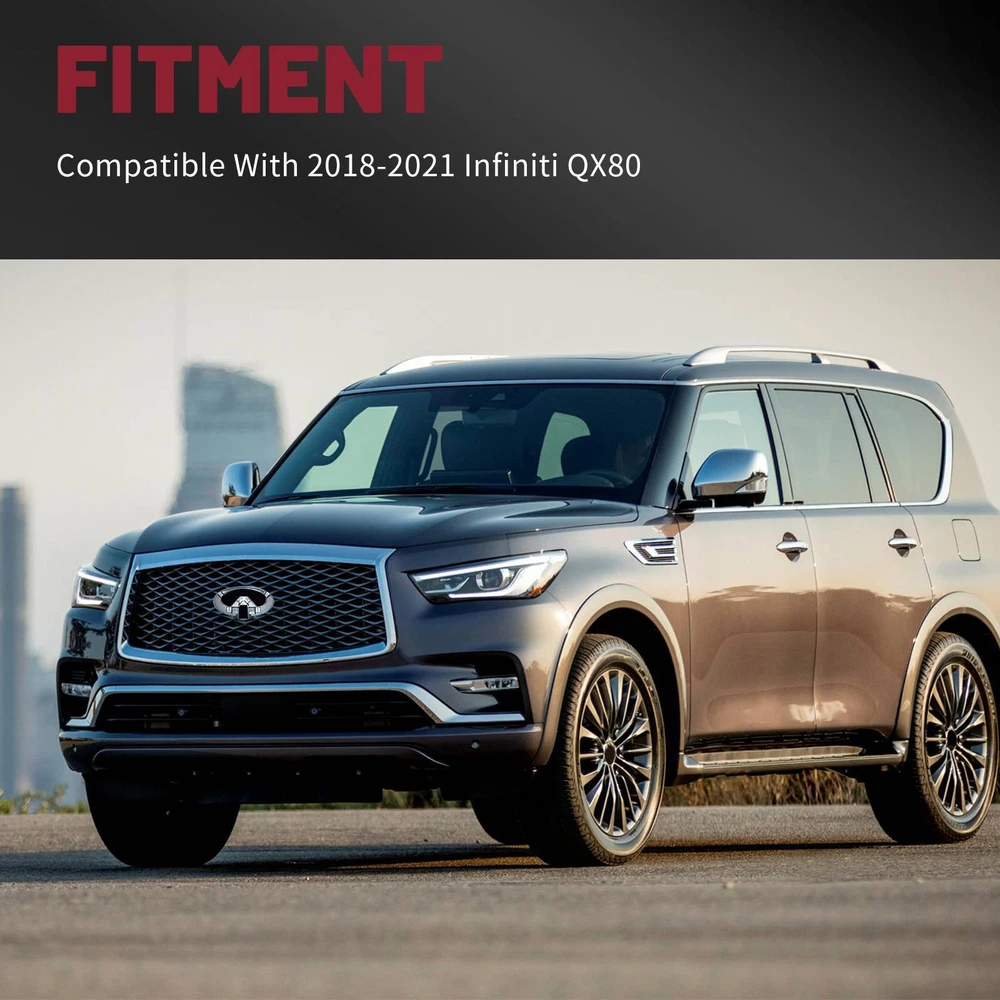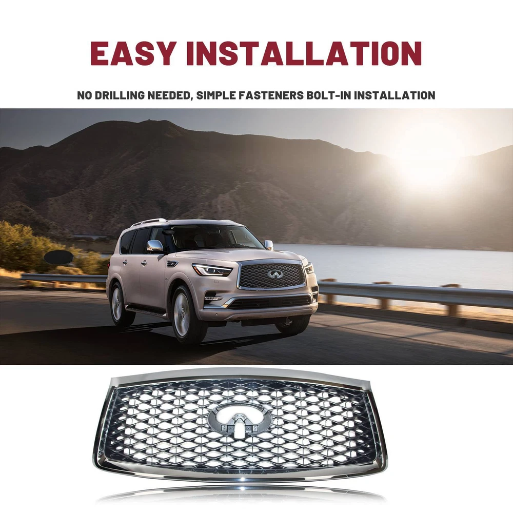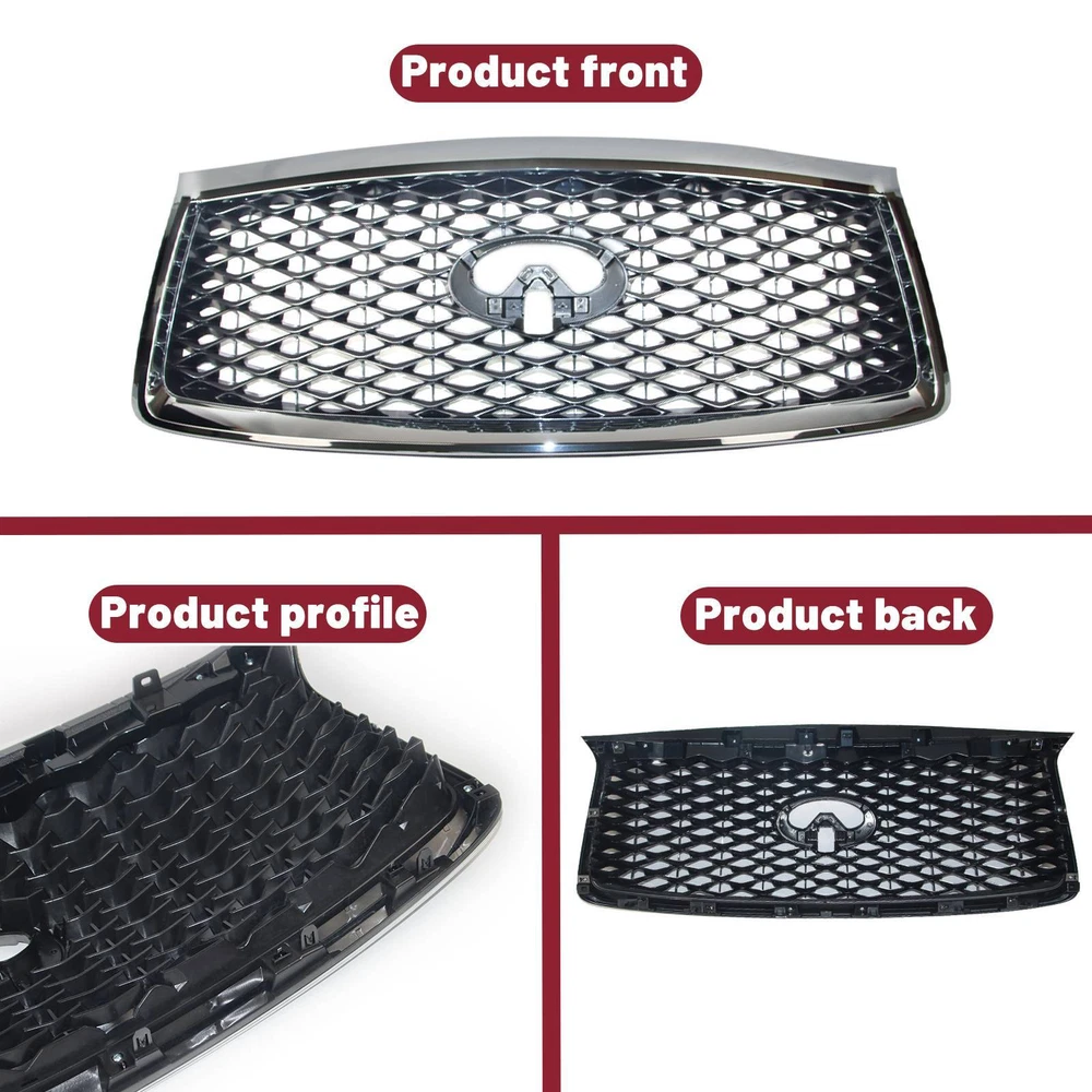Specification OE Number: 623106GW0A Condition: New Manufacturer Warranty: 1 Year Package Weight(lbs): 11.46 Package Dimensions((LengthxWidthxHeight:inch)): 45.28 Item Weight(lbs): 9.46 Item Size(LengthxWidthxHeight:inch): 45.28*18.9*6.69 Package Include: 1*Grille,1*Camera Hole Surface Finish: Paint,Electroplate Material: ABS Color: Chrome frame,Sliver Fitment 2018-2021 INFINITI QX80 Features & Benefits 1. Easy to Install & Precise Fitment Factory style designed as a direct replacement for your original grille assembly. Easy to install, directly bolt-on. Requires no cutting and no drilling. 2. Premium Look Offered nice finishes, including sleek chrome, textured black, and painted (depending on application). Prevent scratches, no fade. Make your car a new style and appearance. 3. Enduring Protection Provides better airflow to the radiator and engine to help the cooling process best. Protect your driving safety by blocking large objects to achieve good wind and dust isolation. 4. Durability Made of High-quality ABS Double-layer process material (Surface UV Finish), it has the advantages of high-temperature resistance, good impact resistance, long service life, and durability. 5. High Quality All car grilles have the same quality as the original parts but at a lower price. One-year warranty caused by quality. 6. Notes 1)Don't remove the grille when the car has just been running in case the parts are still hot. It is best to wait for up to half an hour to ensure that everything has cooled down completely. 2)Wear hand and eye protection to protect your skin from chemicals and your eyes from dust. 3)Wash your hands afterward to ensure no lingering dust or chemicals on your hands enter your eyes, even if you have been wearing gloves. Note: Only sold in the USA (Excluding Hawaii, Alaska, Puerto Rico, Guam, Virgin Islands, American Samoa, Northern Mariana Islands, Palau, Federated States of Micronesia, Marshall Islands, AA, AE, AP). Warranty: If there's any problem, please feel free to contact us with your car's VIN # and the pictures or videos to show the problem within 30 days, we’ll try our best to solve it and make you satisfied. After using, the item’s warranty is 1 year, only for replacement and no refund. Hope you know.