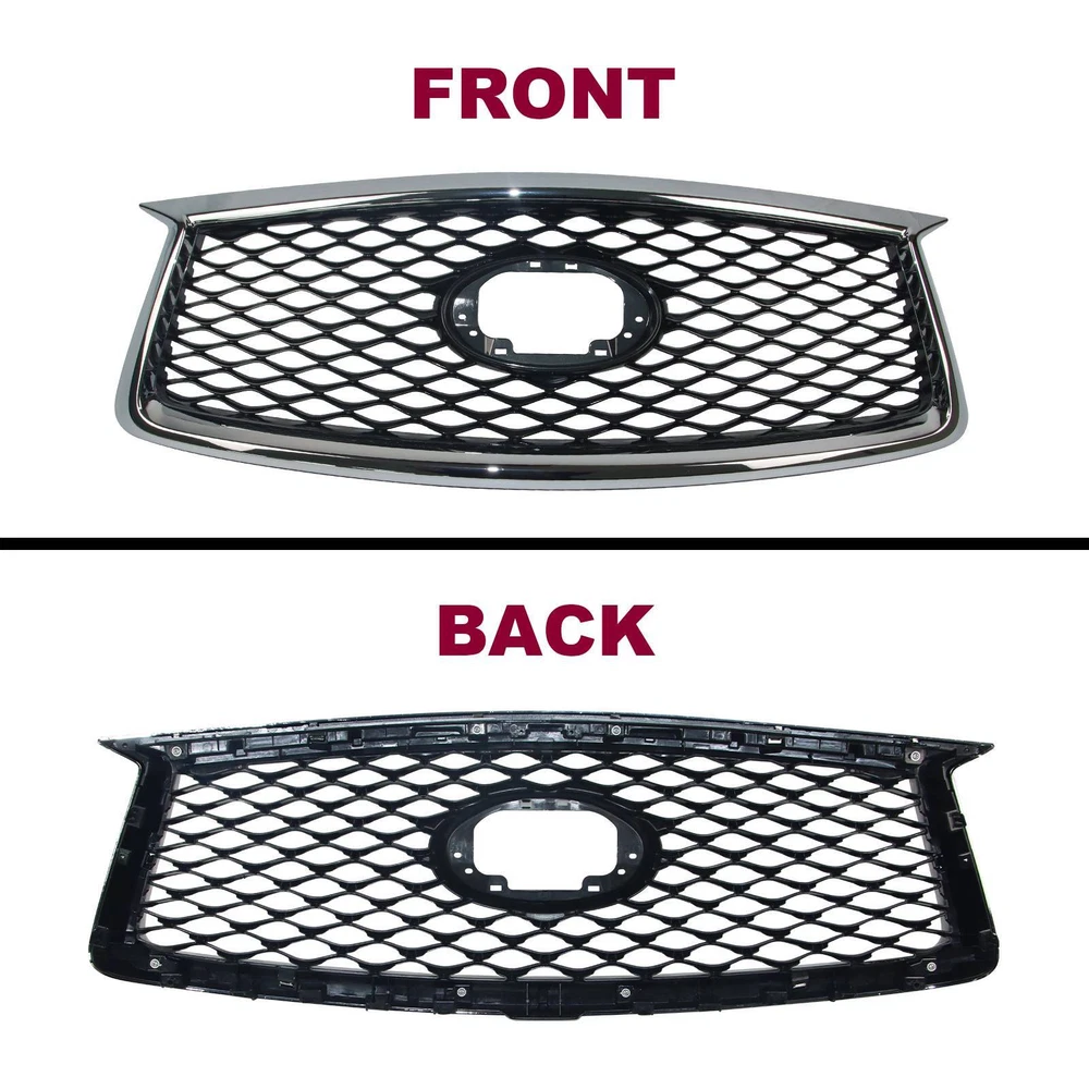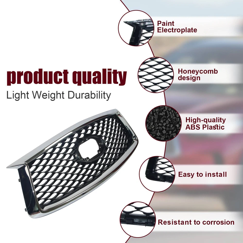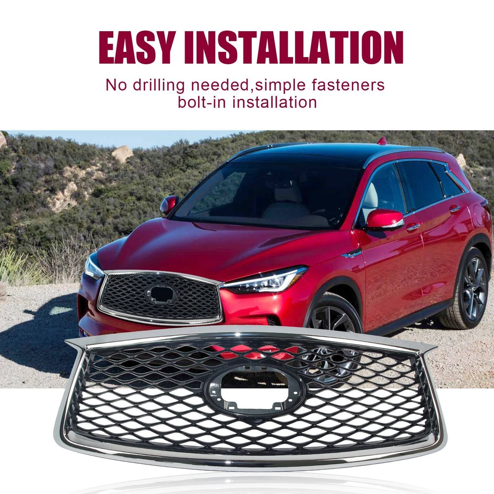 Specification OE Number: F23106HH1A Condition: New Manufacturer Warranty: 1 Year Package Weight(lbs): 7.72 Package Dimensions((LengthxWidthxHeight:inch)): 42.13 Item Weight(lbs): 6.72 Item Size(LengthxWidthxHeight:inch): 42.13*14.96*5.51 Package Include: 1*Grille,Screw Surface Finish: Paint,Electroplate Material: ABS Color: Chrome frame,Grey Fitment 2019-2022 INFINITI QX50 Features & Benefits 1. Easy to Install & Precise Fitment Factory style designed as a direct replacement for your original grille assembly. Easy to install, directly bolt-on. Requires no cutting and no drilling. 2. Premium Look Offered nice finishes, including sleek chrome, textured black, and painted (depending on application). Prevent scratches, no fade. Make your car a new style and appearance. 3. Enduring Protection Provides better airflow to the radiator and engine to help the cooling process best. Protect your driving safety by blocking large objects to achieve good wind and dust isolation. 4. Durability Made of High-quality ABS Double-layer process material (Surface UV Finish), it has the advantages of high-temperature resistance, good impact resistance, long service life, and durability. 5. High Quality All car grilles have the same quality as the original parts but at a lower price. One-year warranty caused by quality. 6. Notes 1)Don't remove the grille when the car has just been running in case the parts are still hot. It is best to wait for up to half an hour to ensure that everything has cooled down completely. 2)Wear hand and eye protection to protect your skin from chemicals and your eyes from dust. 3)Wash your hands afterward to ensure no lingering dust or chemicals on your hands enter your eyes, even if you have been wearing gloves. Note: Only sold in the USA (Excluding Hawaii, Alaska, Puerto Rico, Guam, Virgin Islands, American Samoa, Northern Mariana Islands, Palau, Federated States of Micronesia, Marshall Islands, AA, AE, AP). Warranty: If there's any problem, please feel free to contact us with your car's VIN # and the pictures or videos to show the problem within 30 days, we’ll try our best to solve it and make you satisfied. After using, the item’s warranty is 1 year, only for replacement and no refund. Hope you know.