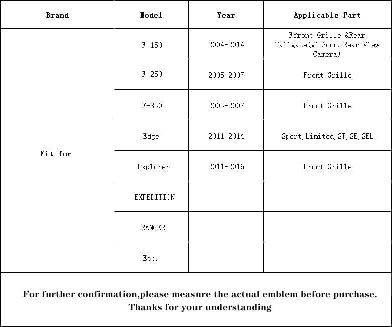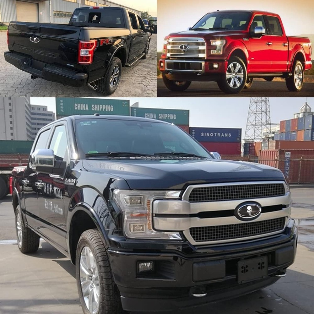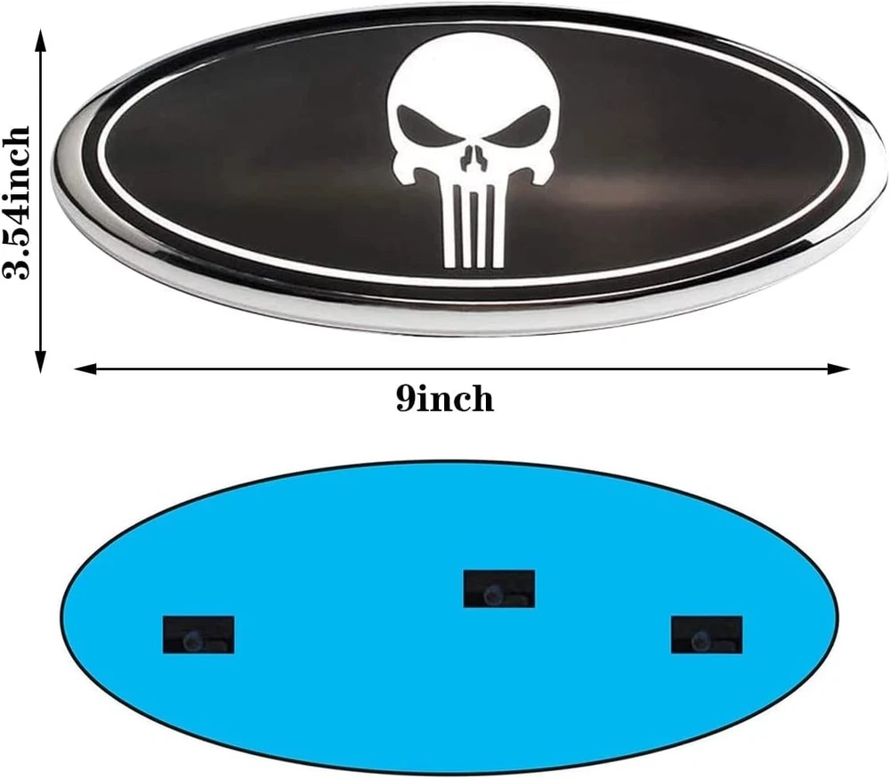 Front Grille Rear Tailgate Skull Emblem - 9" Oval Badge Name Plate Fit for 2004-2014 F150, 2005-2007 F250 F350, 11-16 Explorer, 11-14 Edge, 06-11 Range, 07-14 ExpeditionBlack [Suitable for Most Cars]:This emblem nameplate badge fits for F-150 2004-2014 (Without Rear View Camera), F-250/ F-350 2005-2007, Edge 2011-2014, Explorer 2011-2016, EXPEDITION, RANGER,Etc. [Front Grille Emblem]:It's a oval front emblem 9" ",the outer pin is " tall and the center pin is " check the size of the emblem to confirm whether the emblem is suitable for your vehicle. [Easy Installation]:The emblem nameplate badge has self-adhesive tape on the back, no drilling required. Remove your old emblem, make sure the surface is clean to assure longevity of the adhesive before applying. [Excellent Quality]:Our emblem is made of high performance ABS and aluminum alloy. Excellent quality, rustless, anti-sunburn, waterproof and fadeless. [Smart Gift]:If your families, friends or colleagues owned a F_d car, this grille tailgate emblem will be a perfect gift for them to personalize their cars. Specifications: Material: High quality ABS & Aluminum Size: 9"" 3 alignment posts for easy installation Fit For (for reference only): F-150: 2004-2014 (Front Grille & Rear Tailgate (Without Rear View Camera) F-250: 2005-2007 (Front Grille) F-350: 2005-2007 (Front Grille) Edge: 2011-2014 (Sport, , ST, SE, SEL) Explorer: 2011-2016 (Front Grille) EXPEDITION RANGER Etc. Package Included: 1 x Front Grille Emblem .