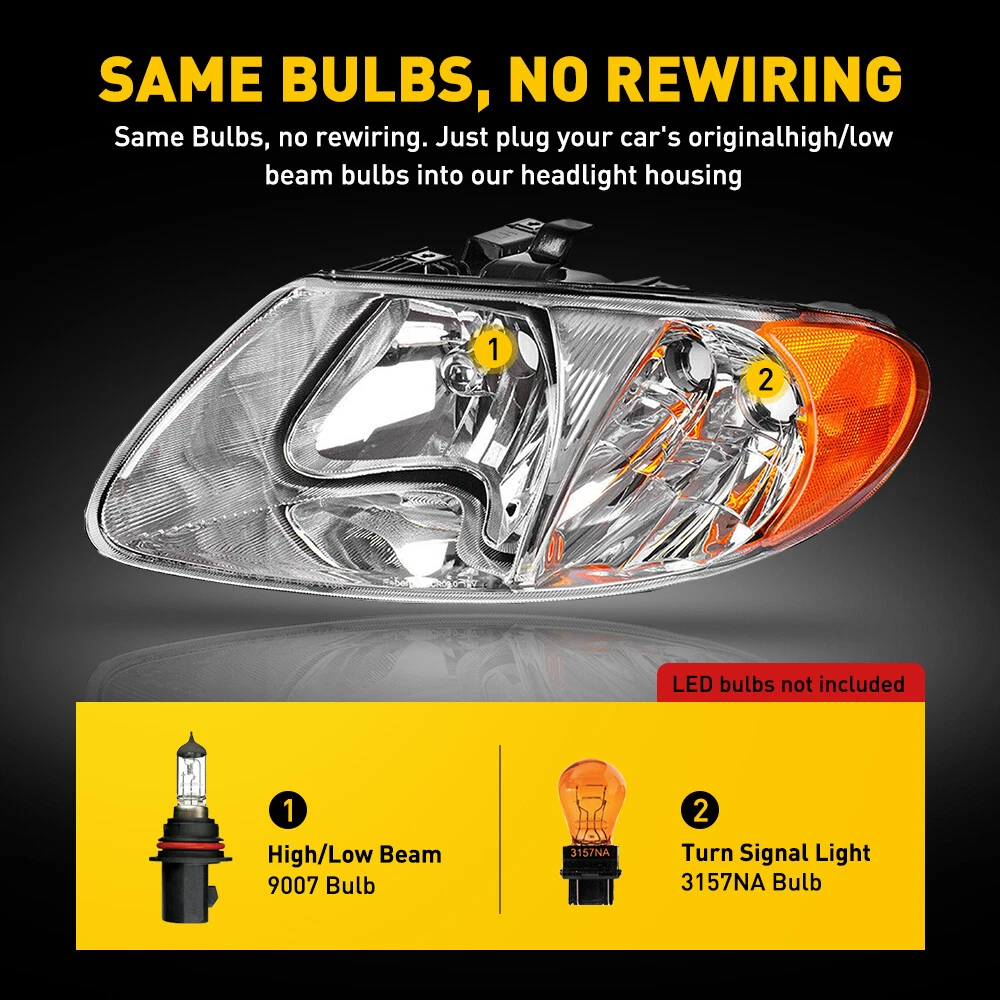 Headlights Headlamps Fit For 2001-2007 Dodge, Chrysler etc Fit for: 2001-2007 Dodge Caravan models only 2001-2007 Dodge Grand Caravan models only 2001-2007 Chrysler Town & Country models only (Do not fit 2005-2007 Town & Country models with extended wheel base (119.3")) 2001-2003 Chrysler Voyager models only 2001-2002 Chrysler Grand Voyager models only Specifications: OE number: 4857701AB, 4857700AB, 4857700AC, 4857701AC CH2503129, CH2502129 Material: ABS+PC (ABS Plastic Housing/Polycarbonate lens) Appearance color: 1.Housing Color: Chrome 2.Lens Color:Clear 3.Reflector Color:Amber Front Headlights Headlamps fits 01-07 Dodge Caravan Town & Country 01-03 Voyager Headlights Headlamps Fit For 2001-2007 Dodge, Chrysler etc Fit for: 2001-2007 Dodge Caravan models only 2001-2007 Dodge Grand Caravan models only 2001-2007 Chrysler Town & Country models only (Do not fit 2005-2007 Town & Country models with extended wheel base (119.3")) 2001-2003 Chrysler Voyager models only 2001-2002 Chrysler Grand Voyager models only Specifications: OE number: 4857701AB, 4857700AB, 4857700AC, 4857701AC CH2503129, CH2502129 Material: ABS+PC (ABS Plastic Housing/Polycarbonate lens) Appearance color: 1.Housing Color: Chrome 2.Lens Color:Clear 3.Reflector Color:Amber The bulb type of original car: 1.Low beam: 9007 2.High beam: 9007 3.Turn signal light: 3157NA Note: Projector ×(Not include) DRL × (Not include) Bulb × (Not include) Features: *Easy to install: Direct replacement, drilling and cutting are not required. *Superior quality: Made of ABS and PC materials with toughness and heat resistance functions to ensure its long service life and durability. *Angle adjustment: Equipped with a headlamp Angle adjustment knob, you can adjust the best Angle of view through the knob. *Suggestion: 1.Please confirm the OE number before purchasing!!! 2.Professional installation is required!!! Packaging include: Headlights*2(Left+Right) Item Specifics Brand AUXITO Lighting Technology Halogen Type Headlight Assembly Features Factory Headlights, Reflector Housing Housing Color Chrome (Crystal) Placement on Vehicle Front, Left, Right Lens Color Clear Manufacturer Part Number DDZC-Caravan-01-07-CA OE/OEM Part Number 4857700AC, 4857701AC Manufacturer Warranty 1 Year Interchange Part Number 4857701AC,4857700AC,4857701AB,4857700AB Other Part Number CH2502129,CH2503129 Fitment Type Direct Replacement Bulbs Included No UPC Does Not Apply Payment Returns DESCRIPTION PAYMENT SHIPPING RETURN POLICY CONTACT US Shop Category Store Home LED Headlight ◈ H4 ◈ H13 LED Reverse Light ◈ T15/921/W16W LED License Plate Light LED Side Marker Light Car Parts & Accessories Tail Light assemblies Other Hot Item Picture New List Item AUXITO Combo White 6500K 10000LM LED Headlight Kit 9005 9006 Bulbs High/Low Beam USD 39.29 9005 9006 LED Headlight Kit High Low Beam Bulb Super Bright 6500K White 720000LM USD 39.99 8x White LED Rock Light Underbody Kit Glow Neon Lamp Universal Fit Jeep Truck V USD 34.99 Set of 2 Front Sway Bar Links for 2005 2006 2007 2008-12 Chevy Cobalt Malibu G6 USD 29.99 9005+9006+H11 LED Headlight Kit High Low Beam Bulbs Super Bright 6500K White USD 119.99 Help & Info Payment Policy Shipping Policy Return Policy FAQ About Us Front Headlights Headlamps fits 01-07 Dodge Caravan Town & Country 01-03 Voyager Headlights Headlamps Fit For 2001-2007 Dodge, Chrysler etc Fit for: 2001-2007 Dodge Caravan models only 2001-2007 Dodge Grand Caravan models only 2001-2007 Chrysler Town & Country models only (Do not fit 2005-2007 Town & Country models with extended wheel base (119.3")) 2001-2003 Chrysler Voyager models only 2001-2002 Chrysler Grand Voyager models only Specifications: OE number: 4857701AB, 4857700AB, 4857700AC, 4857701AC CH2503129, CH2502129 Material: ABS+PC (ABS Plastic Housing/Polycarbonate lens) Appearance color: 1.Housing Color: Chrome 2.Lens Color:Clear 3.Reflector Color:Amber The bulb type of original car: 1.Low beam: 9007 2.High beam: 9007 3.Turn signal light: 3157NA Note: Projector ×(Not include) DRL × (Not include) Bulb × (Not include) Features: *Easy to install: Direct replacement, drilling and cutting are not required. *Superior quality: Made of ABS and PC materials with toughness and heat resistance functions to ensure its long service life and durability. *Angle adjustment: Equipped with a headlamp Angle adjustment knob, you can adjust the best Angle of view through the knob. *Suggestion: 1.Please confirm the OE number before purchasing!!! 2.Professional installation is required!!! Packaging include: Headlights*2(Left+Right) Payment Returns All rights reserved. On Dec 19, 2024 at 12:03:00 PST, seller added the following information: